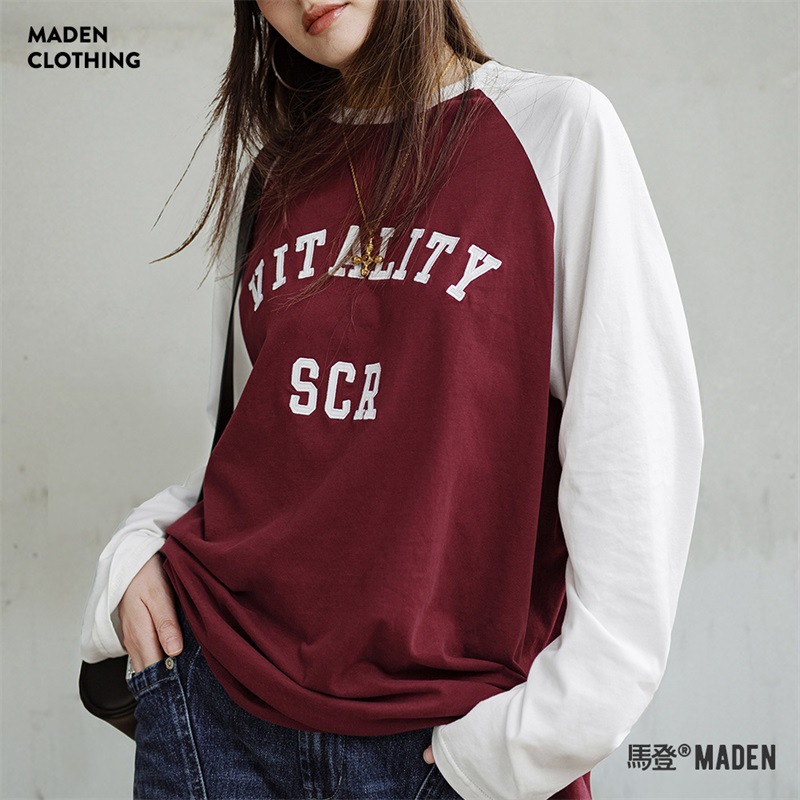 大面積的小眾酒紅和白色的撞色,上身很顯白,胸前的撞色字母繡,順著袖口章仔68號路線,一鍵穿越90S復古街頭~