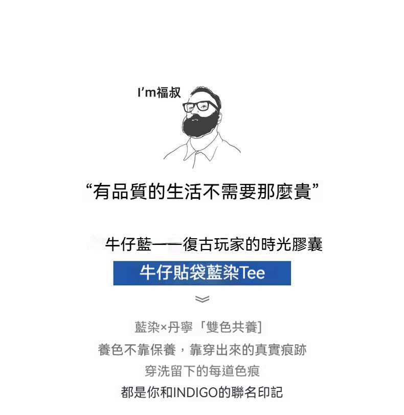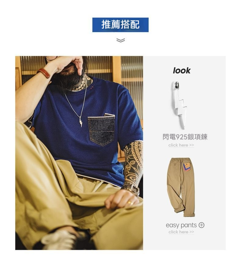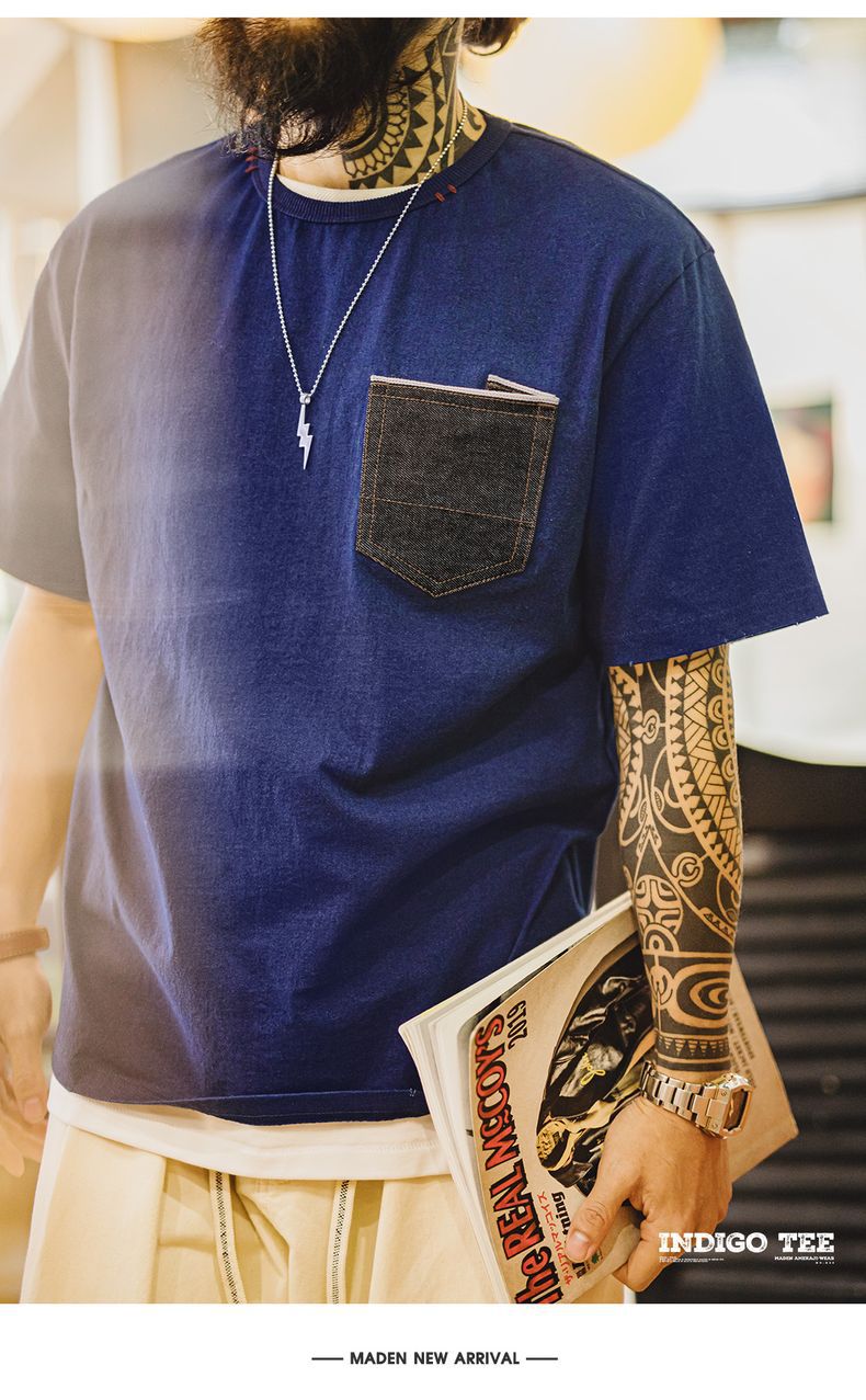 馬登工裝 美式復古植物藍染T恤日系重磅純棉二本針口袋短袖男春夏