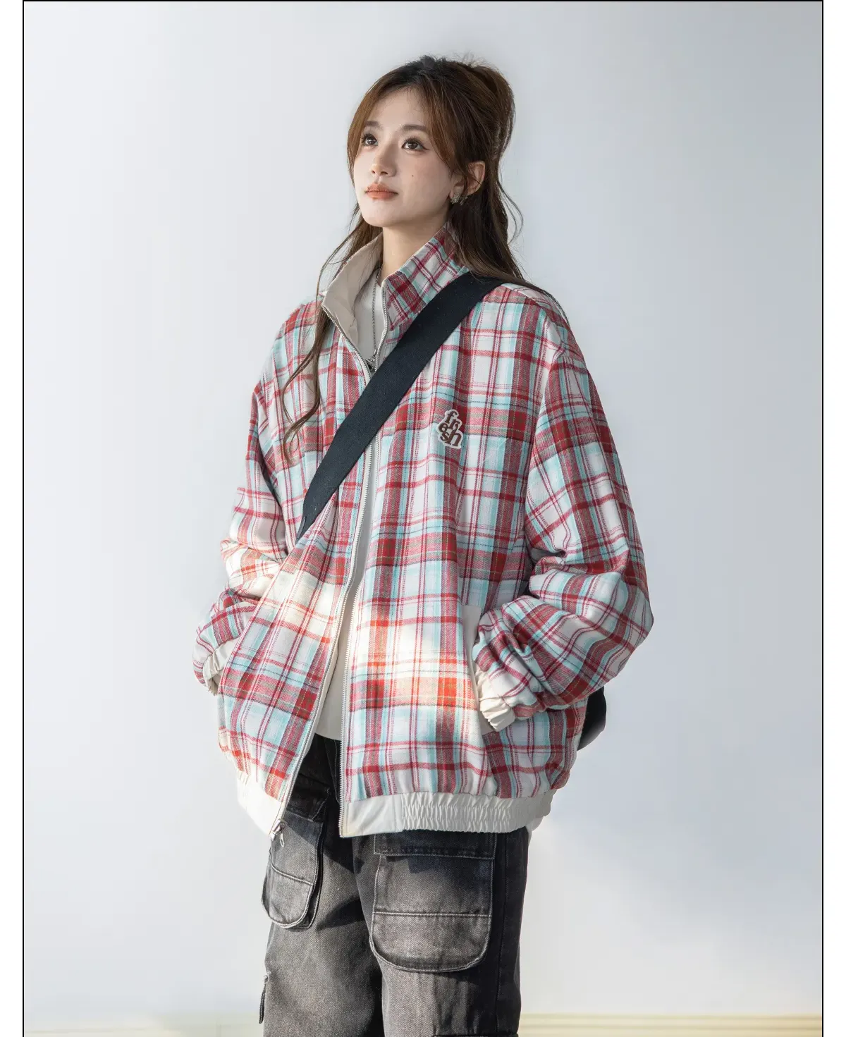 美式復古兩面穿拼接格紋外套學院風立領休閒工裝夾克