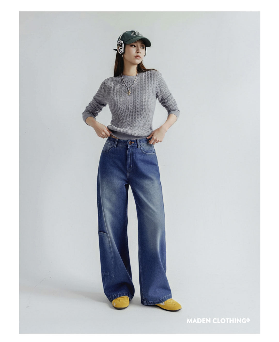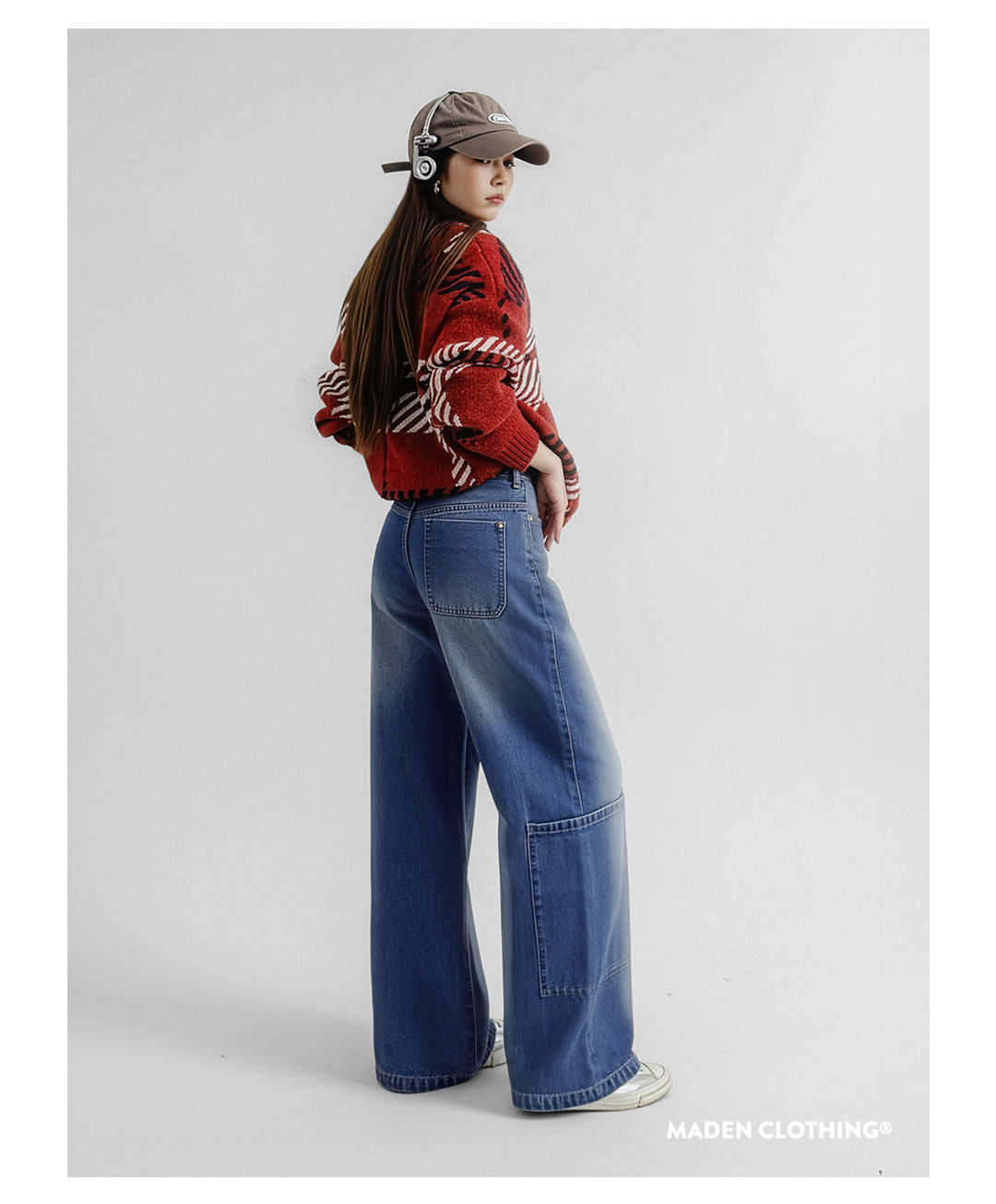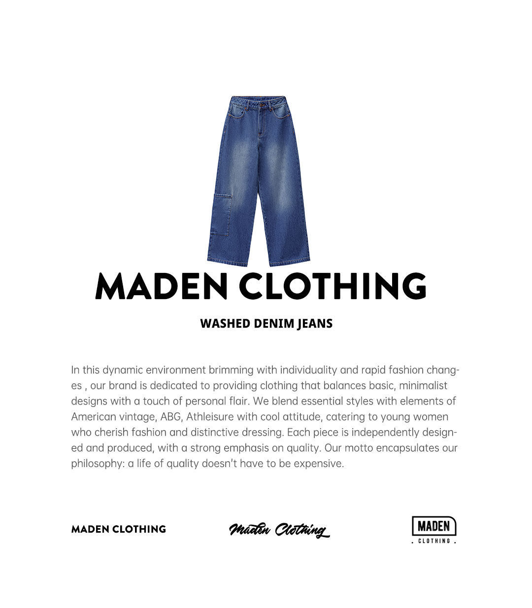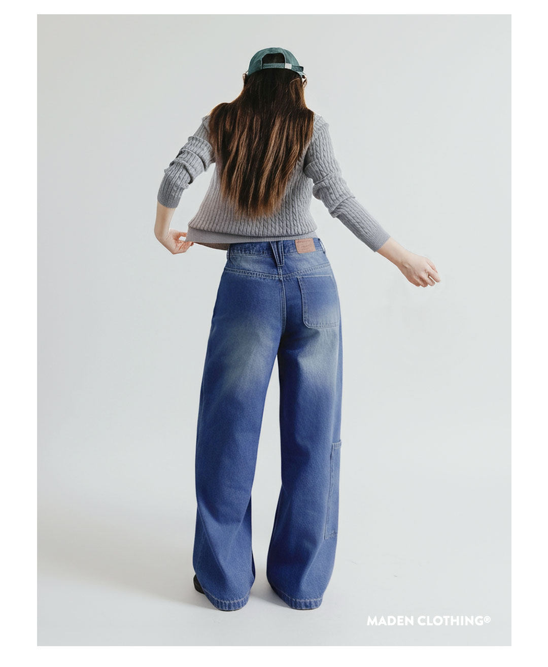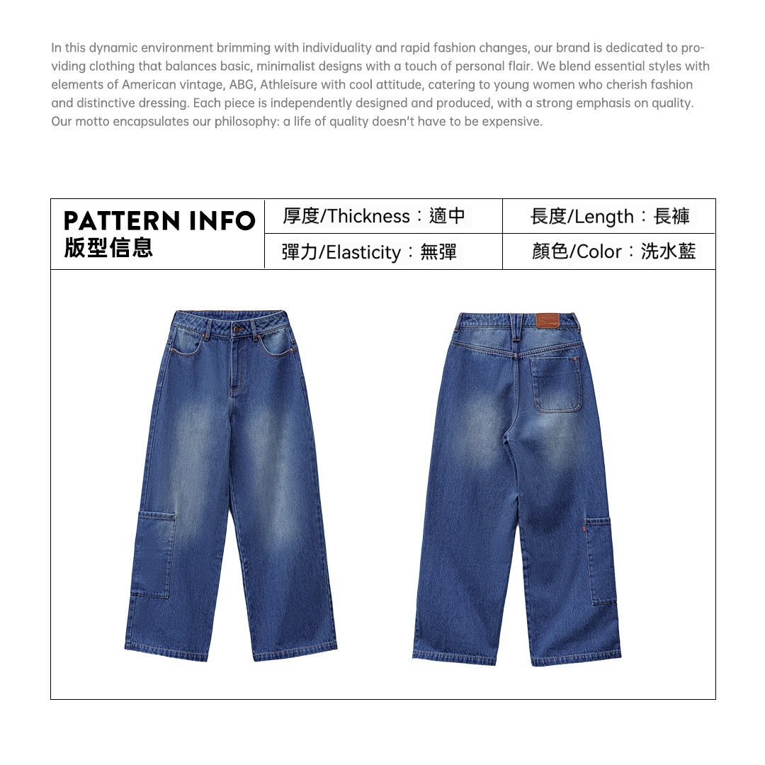馬登女裝 丹寧藍色直筒拼接大口袋牛仔褲純棉闊腿工裝長褲子秋冬