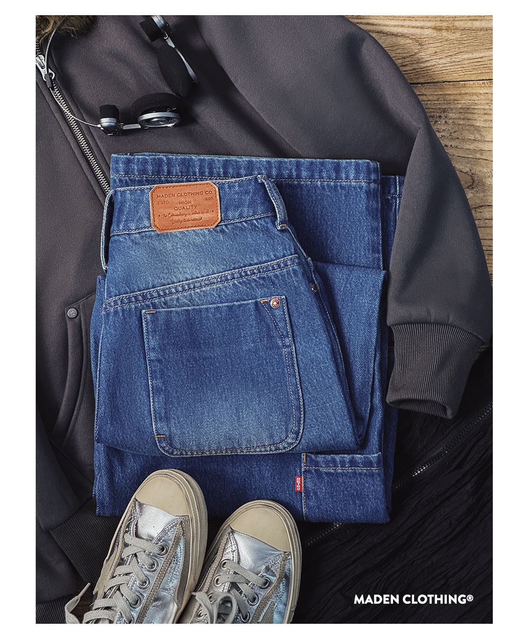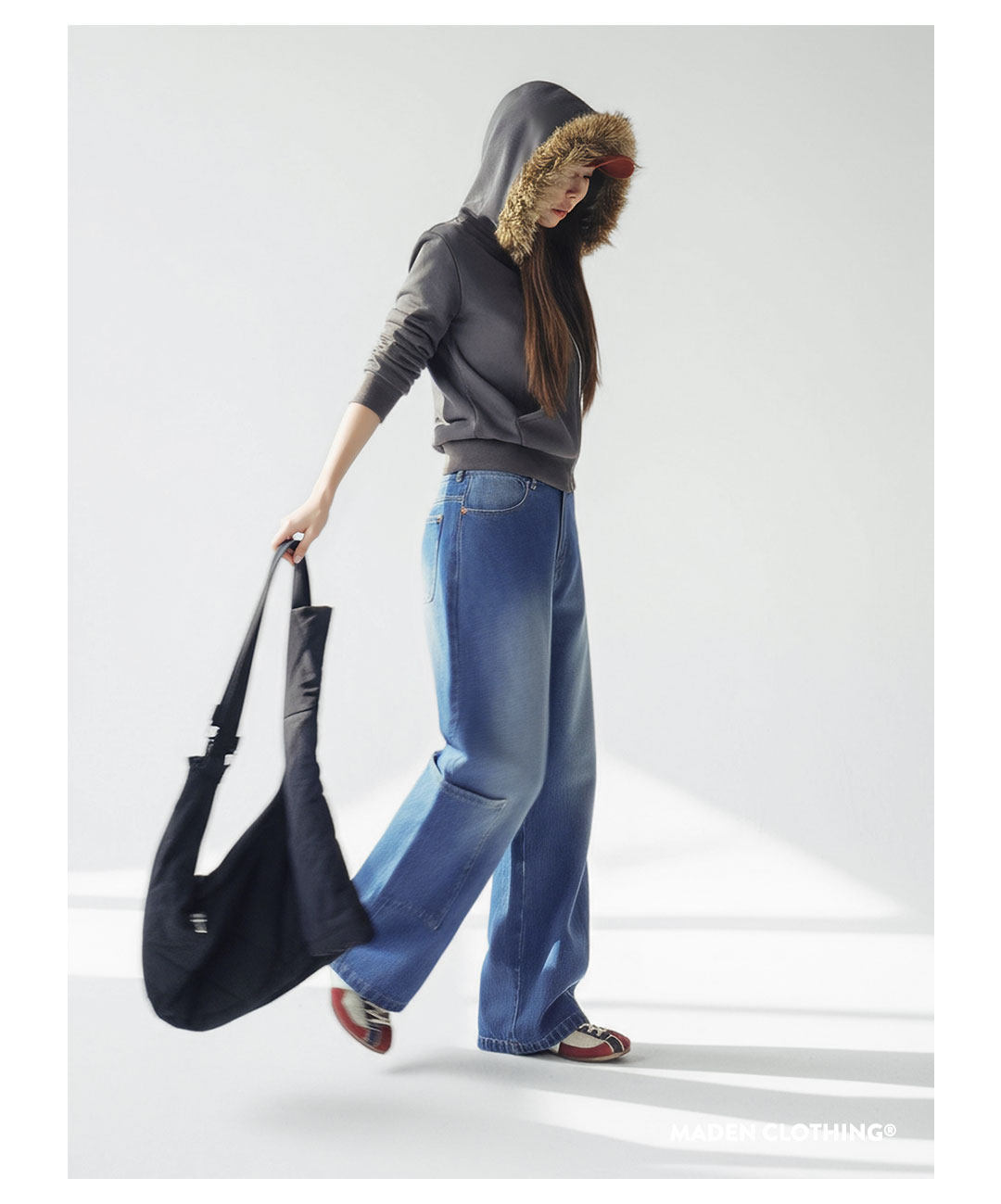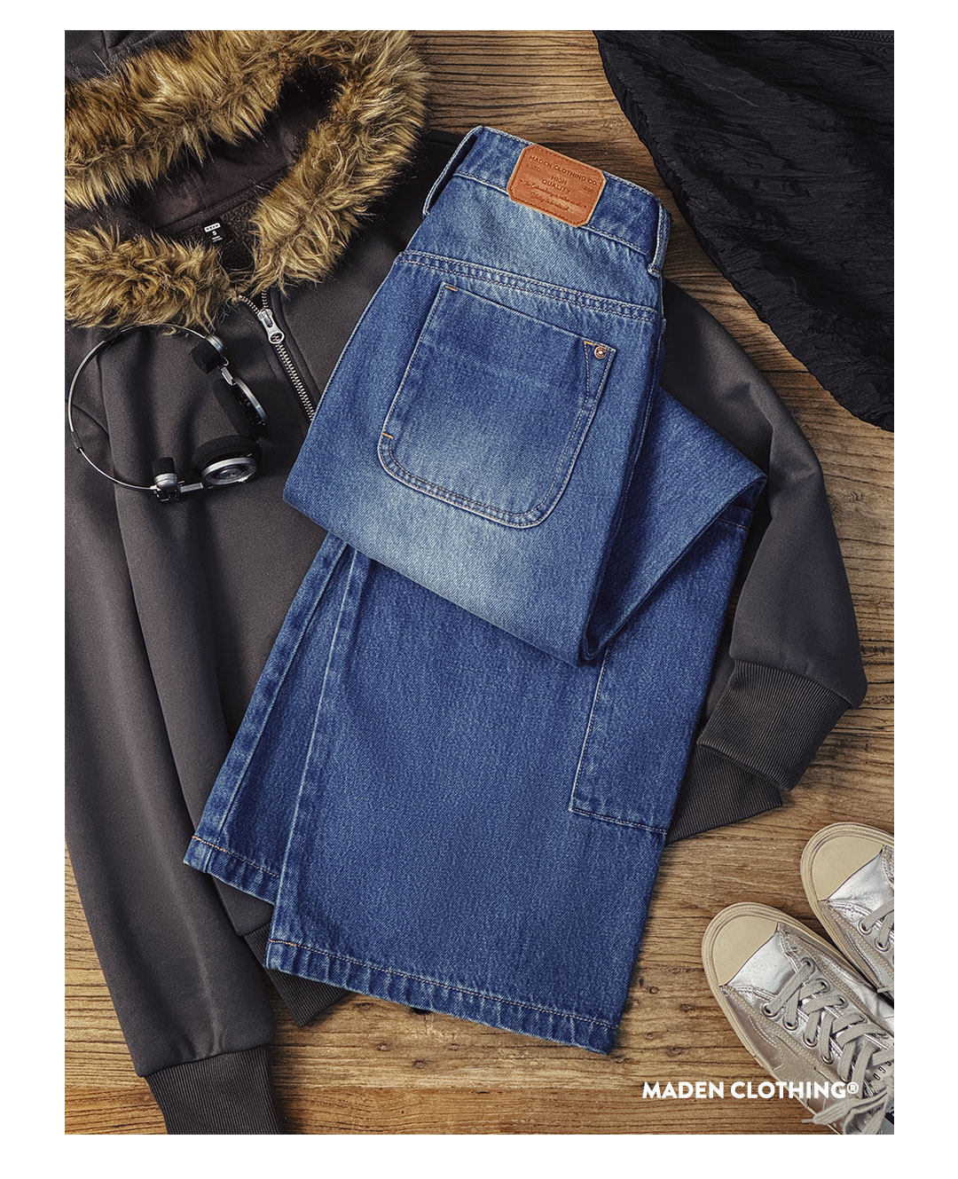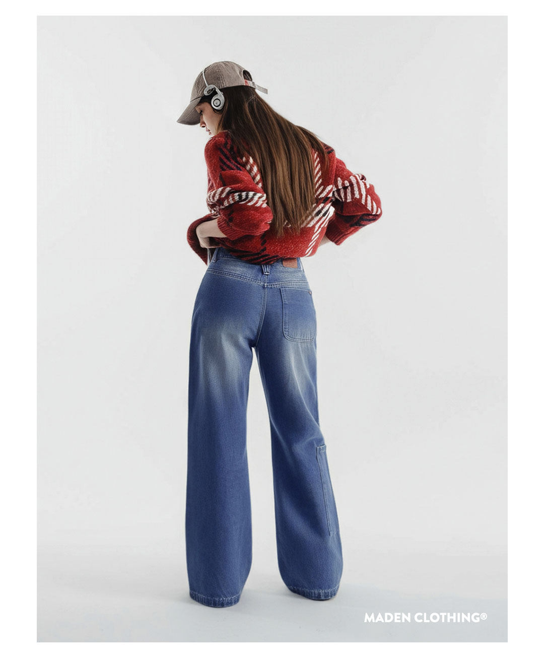 馬登女裝 丹寧藍色直筒拼接大口袋牛仔褲純棉闊腿工裝長褲子秋冬