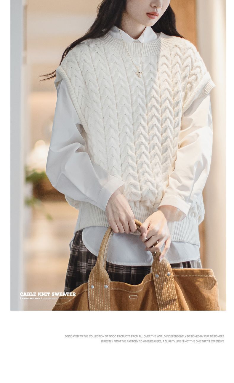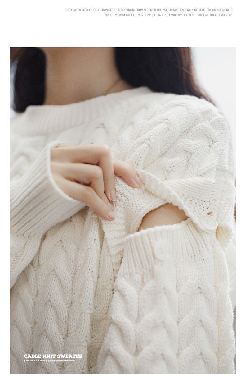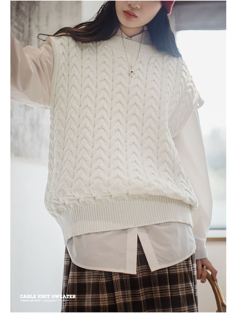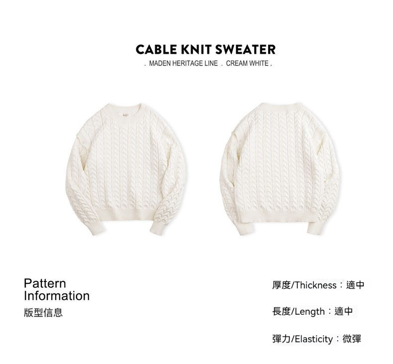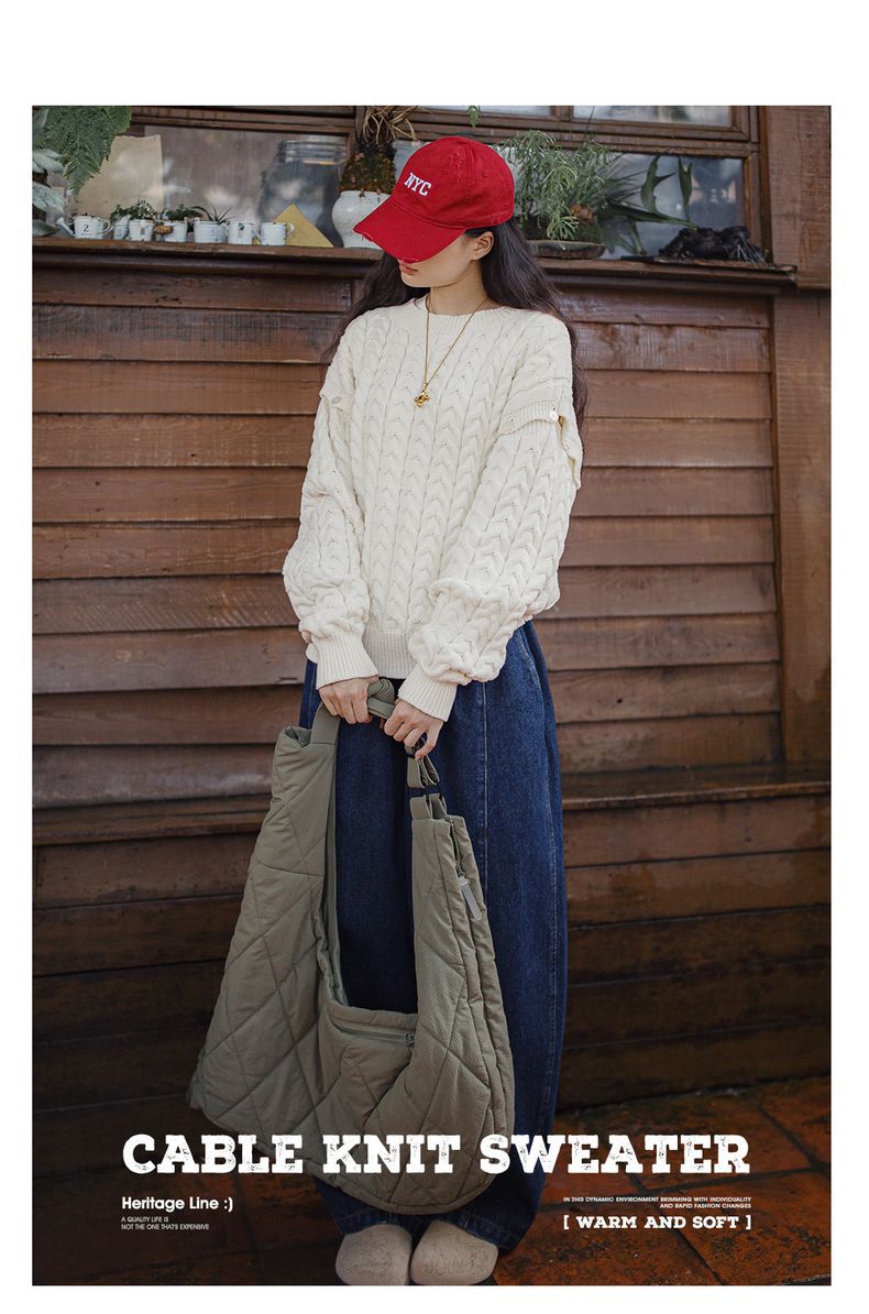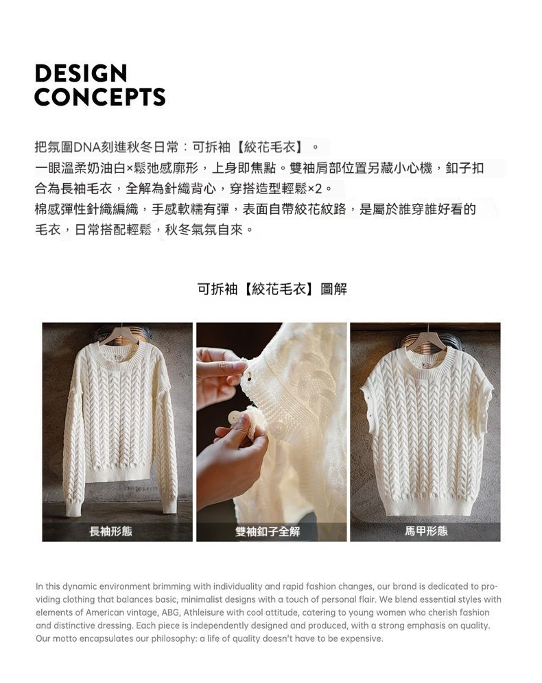 馬登女裝 可拆卸袖子絞花毛衣復古奶油白慵懶麻花針織衫秋冬