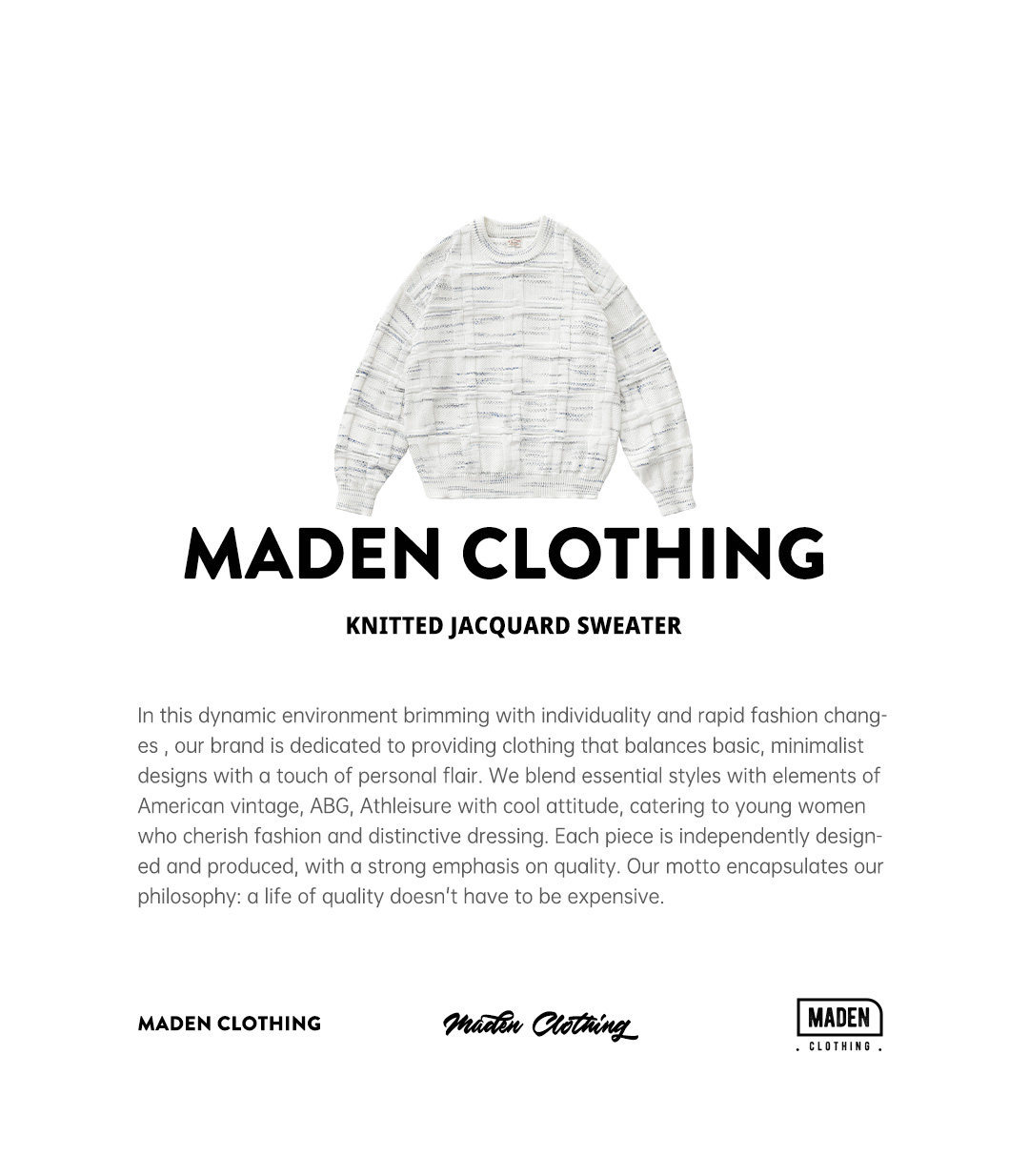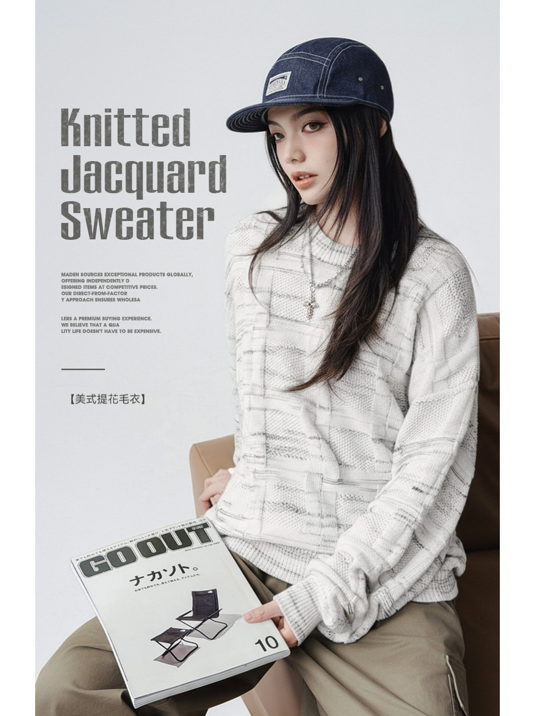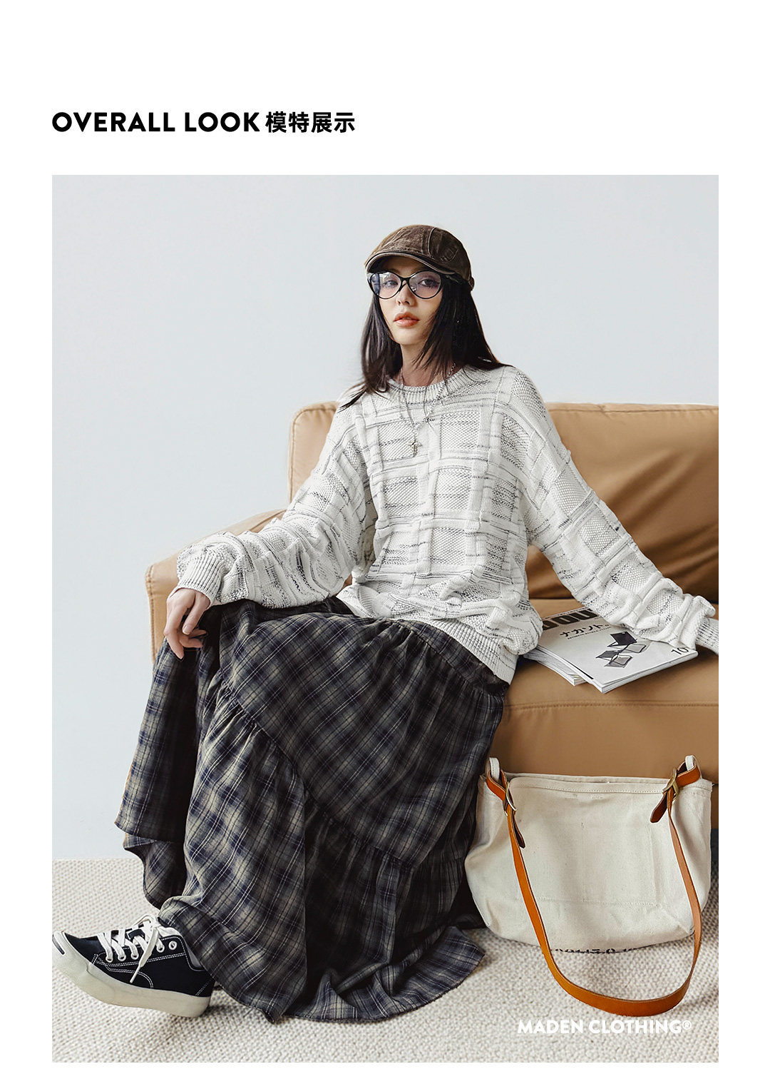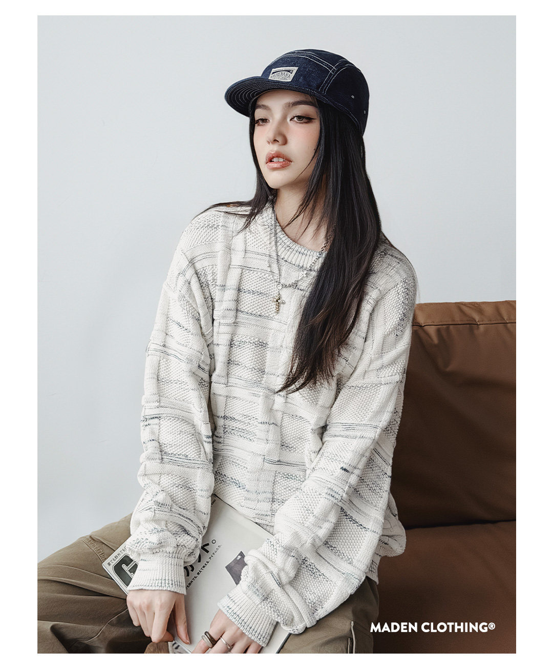 馬登女裝 美式復古寬鬆肌理感圓領套頭撞色針織條紋提花毛衣春秋