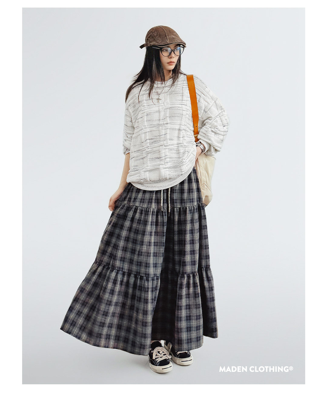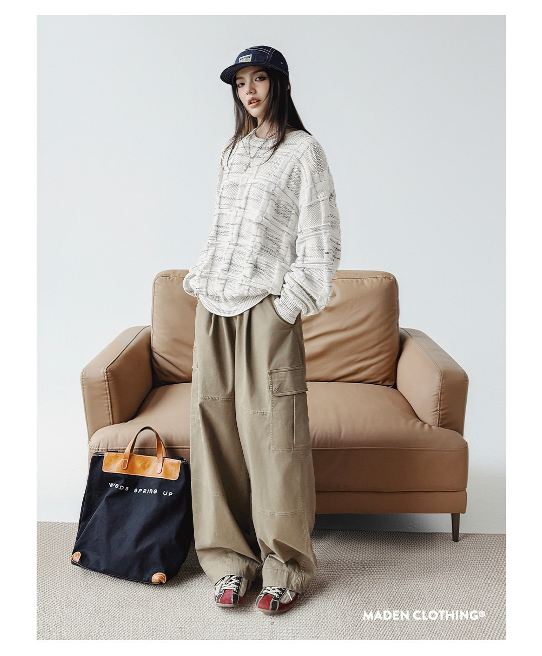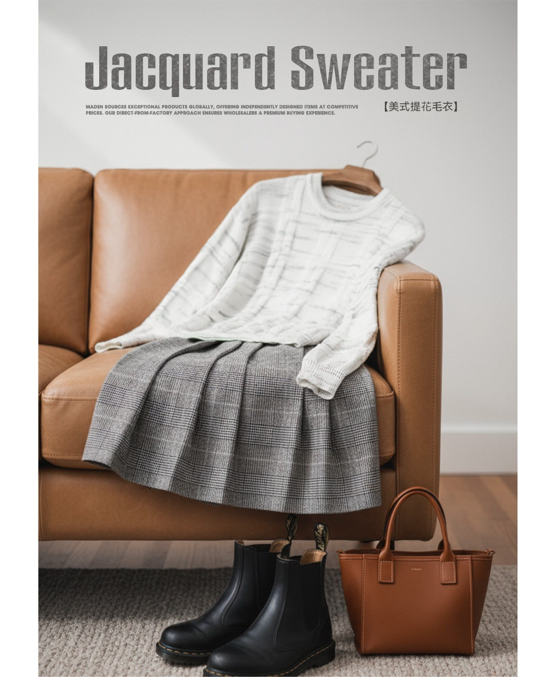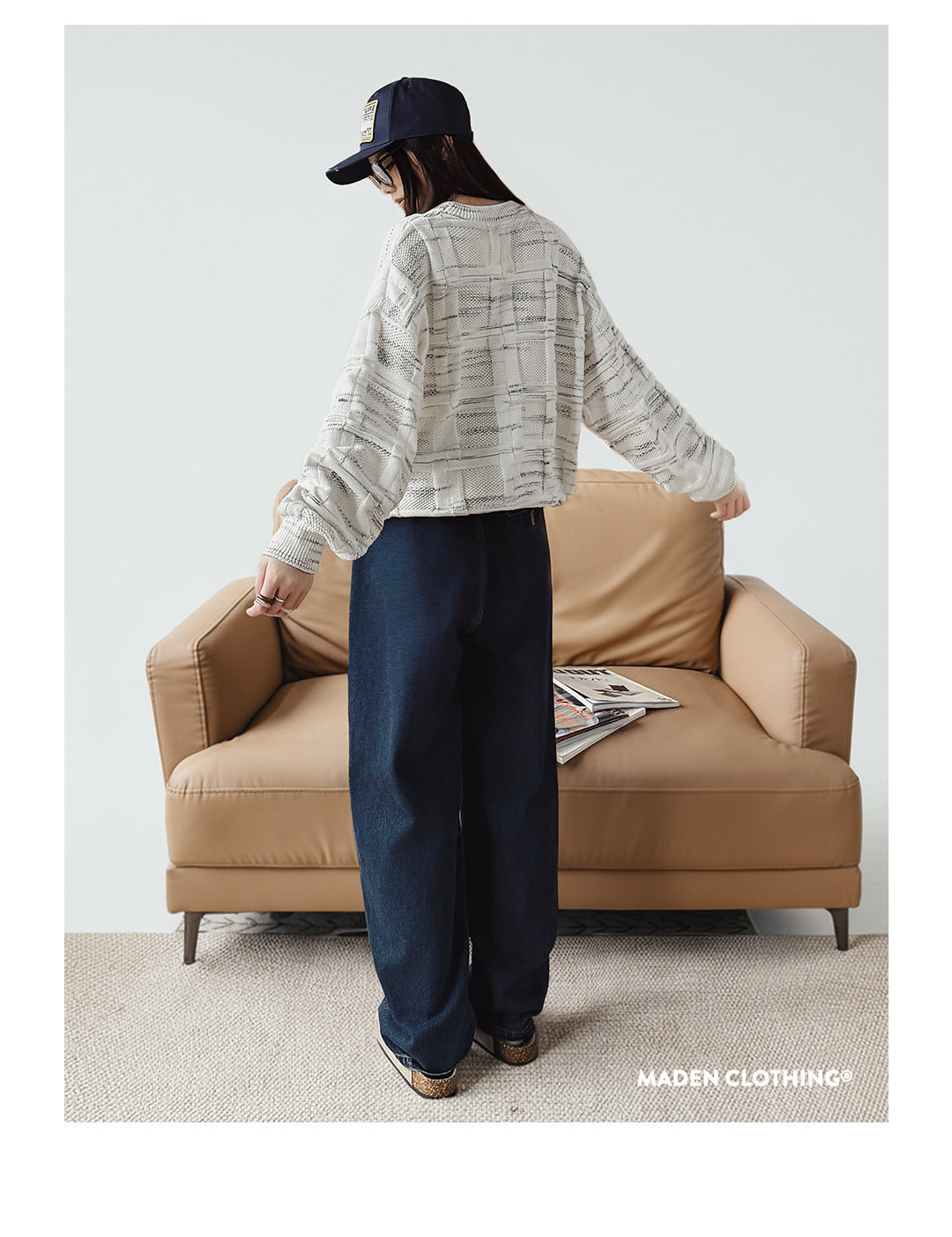 馬登女裝 美式復古寬鬆肌理感圓領套頭撞色針織條紋提花毛衣春秋