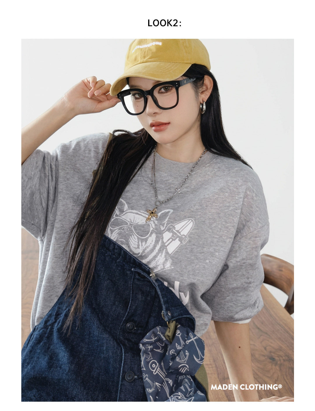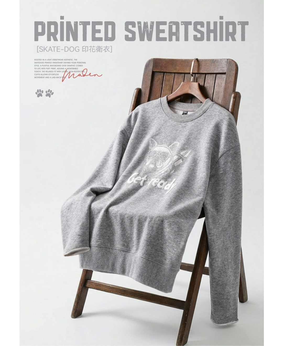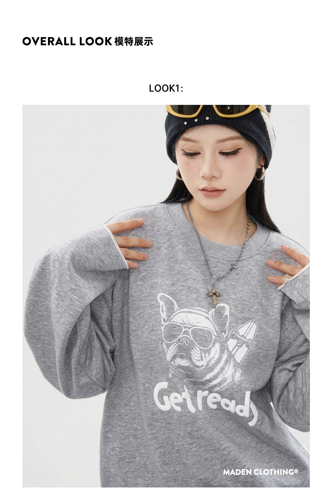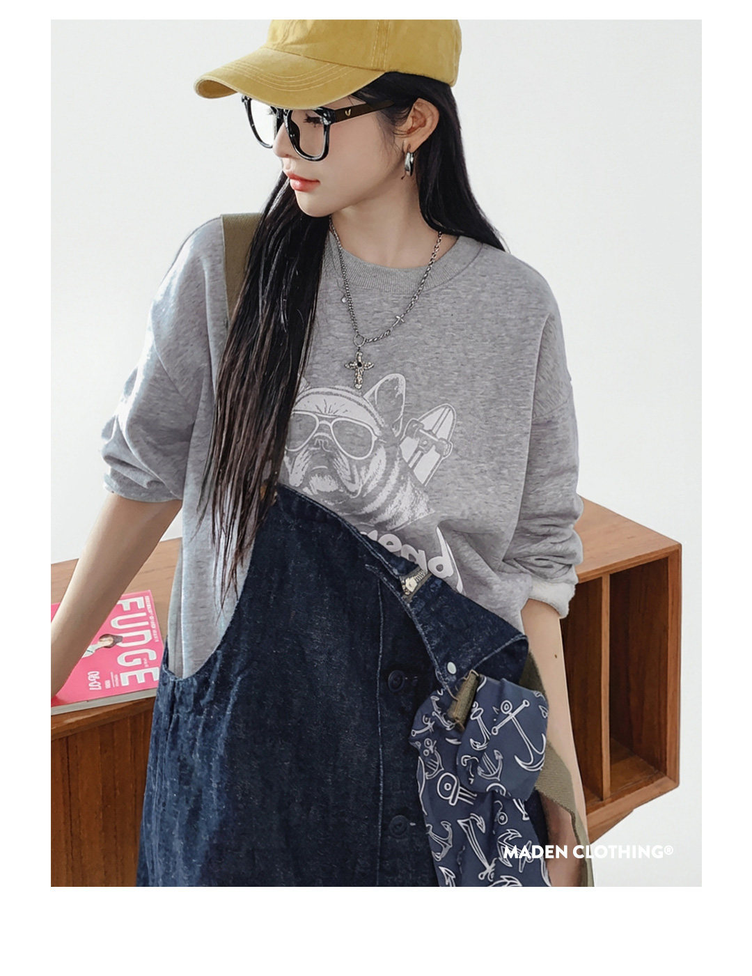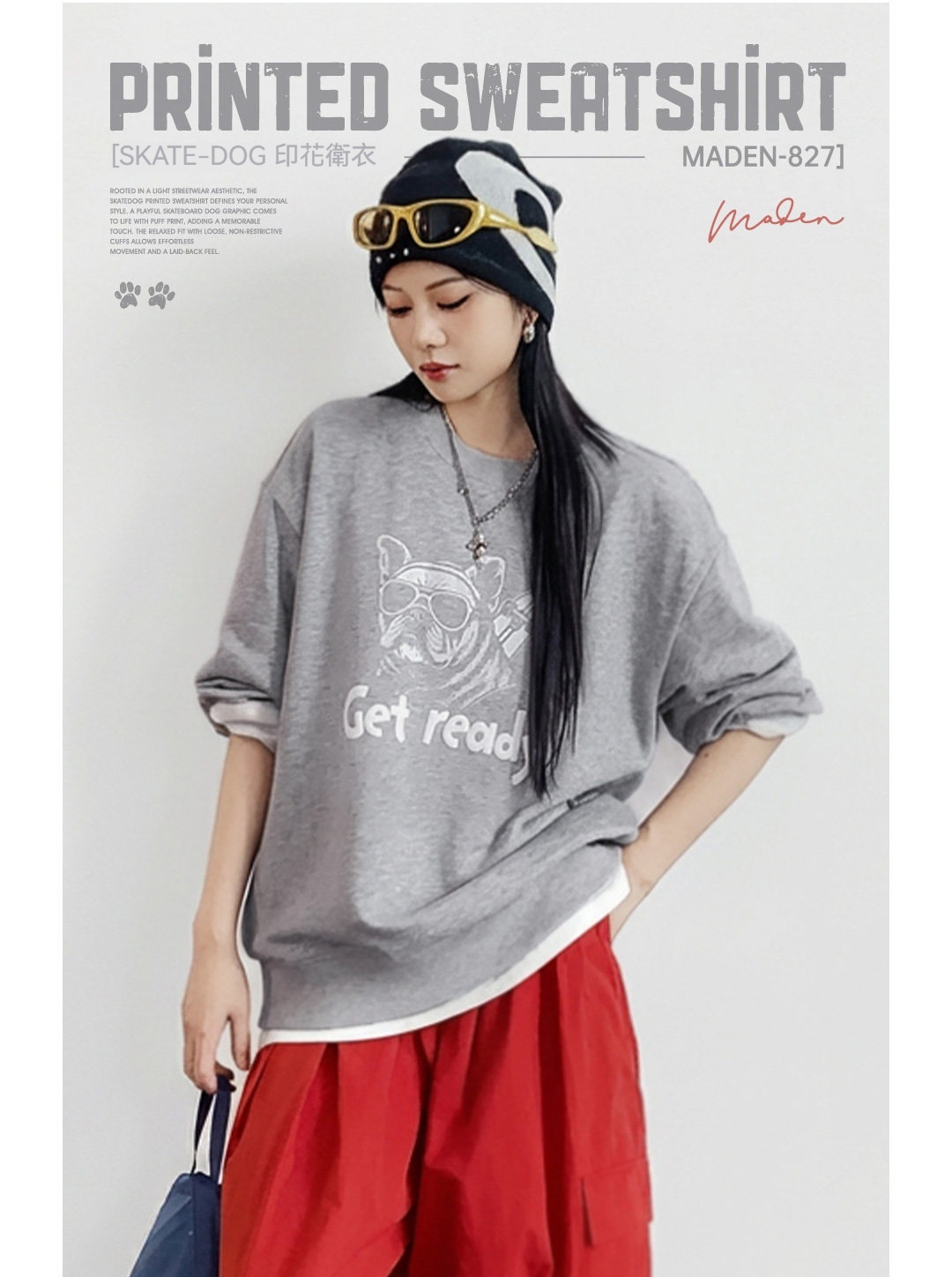 馬登女裝 美式復古灰色重磅套頭寬鬆印花衛衣長袖T恤上衣春秋