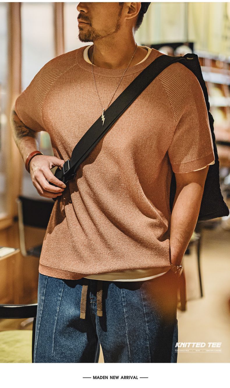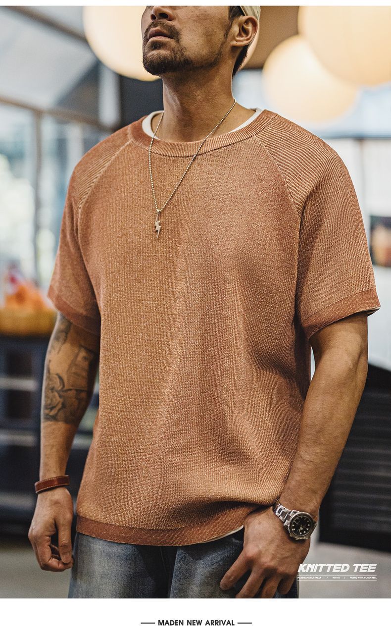 馬登工裝 美式復古橙色針織衫短袖休閒寬鬆圓領薄款透氣T恤春夏