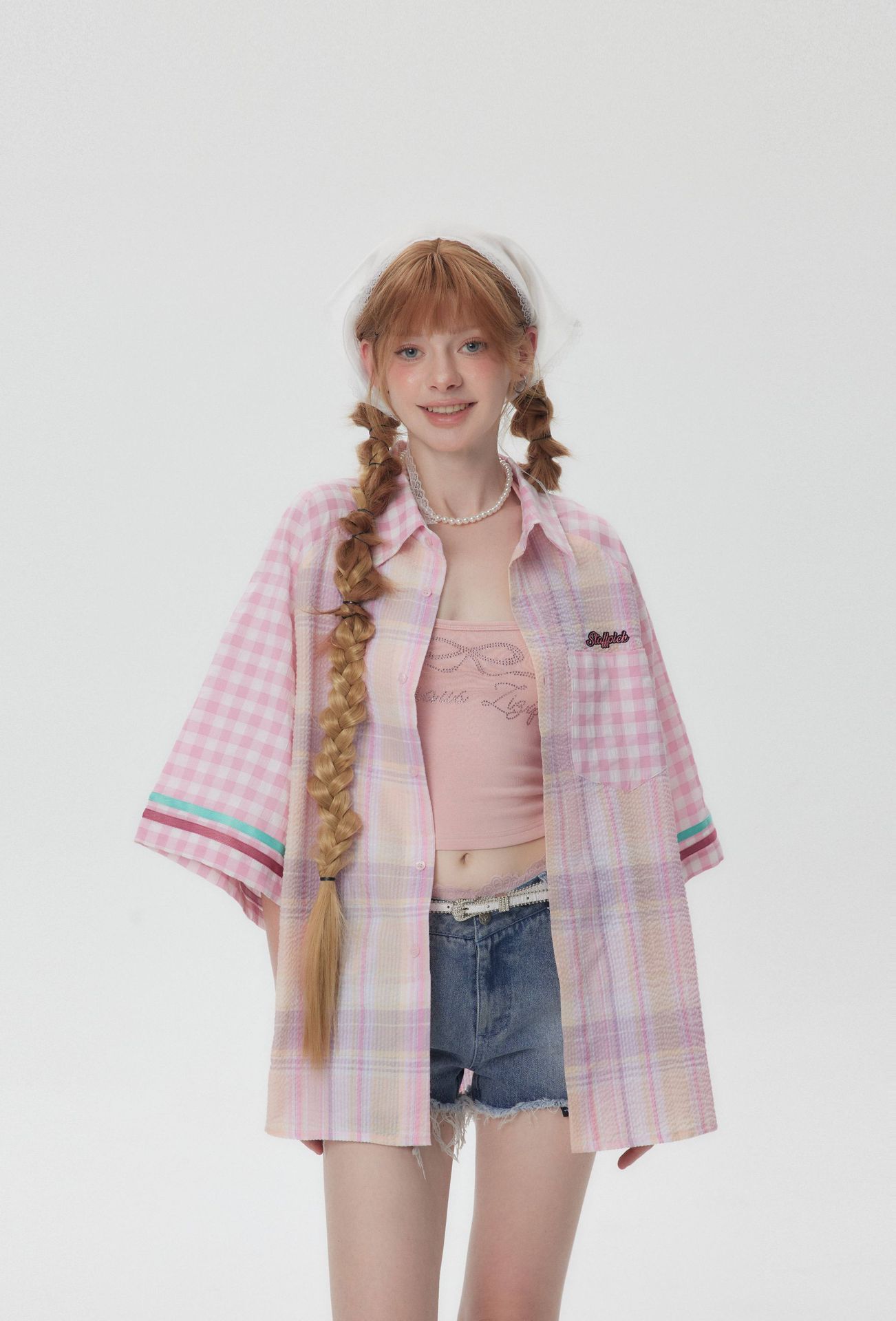 美式復古拼接粉色格子設計感短袖襯衫女寬鬆襯衣外套