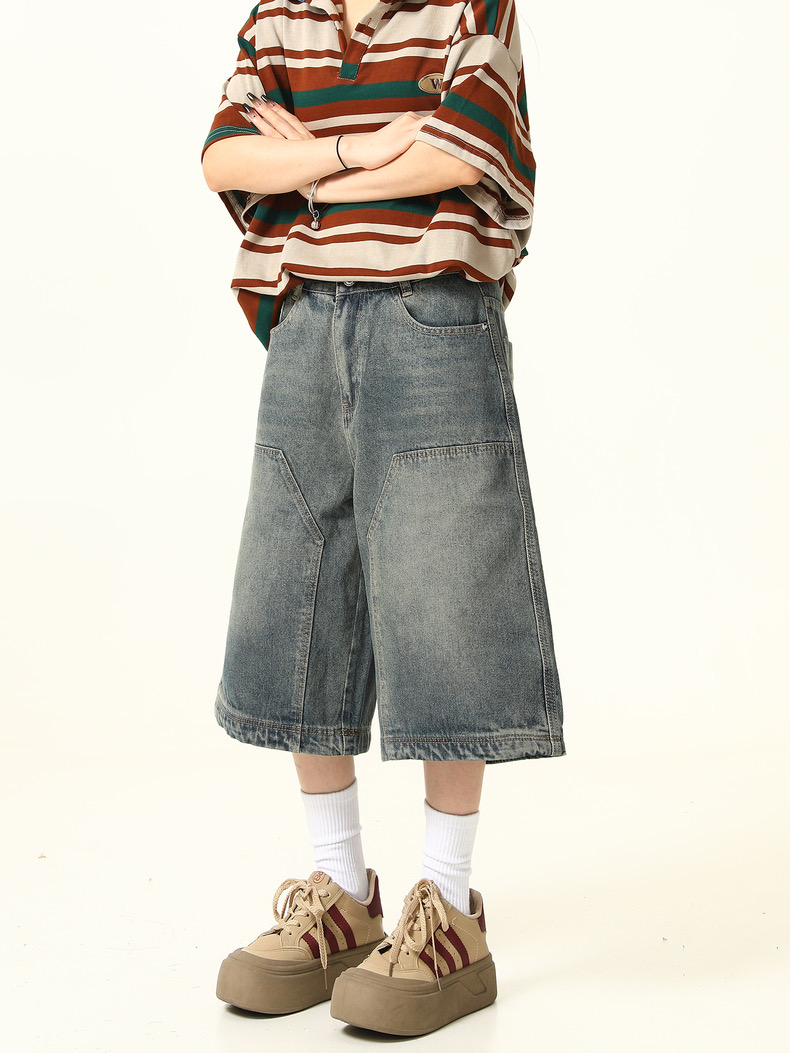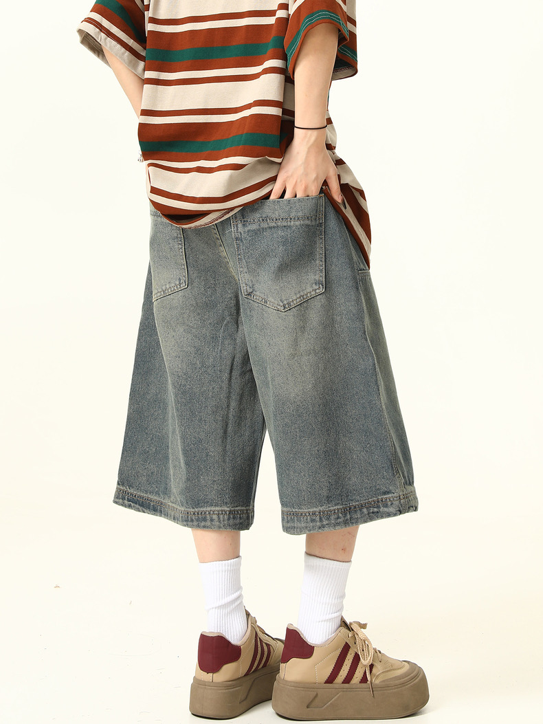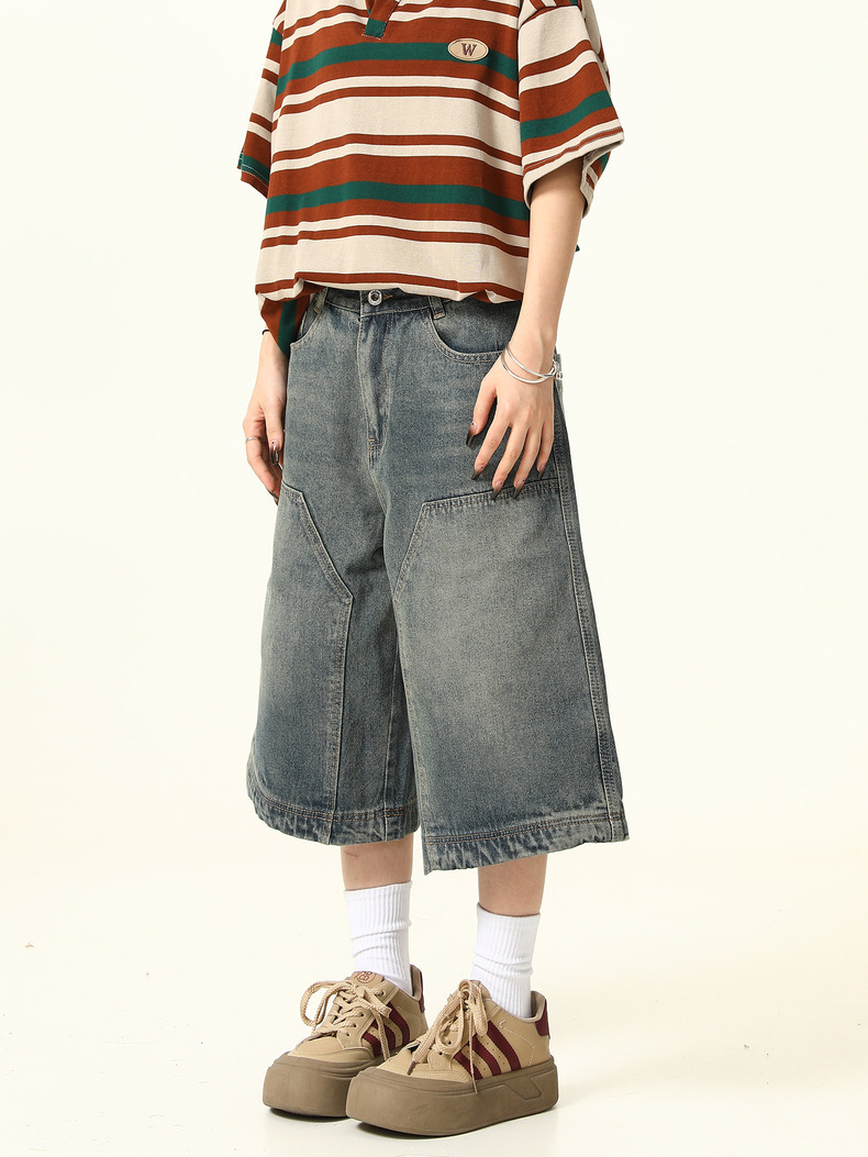 美式復古街頭水洗牛仔短褲女闊腿褲寬鬆百搭七分褲
