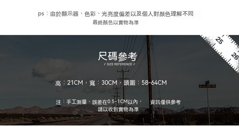 可調節帽圍: 58-64cm(22.8-25.2")