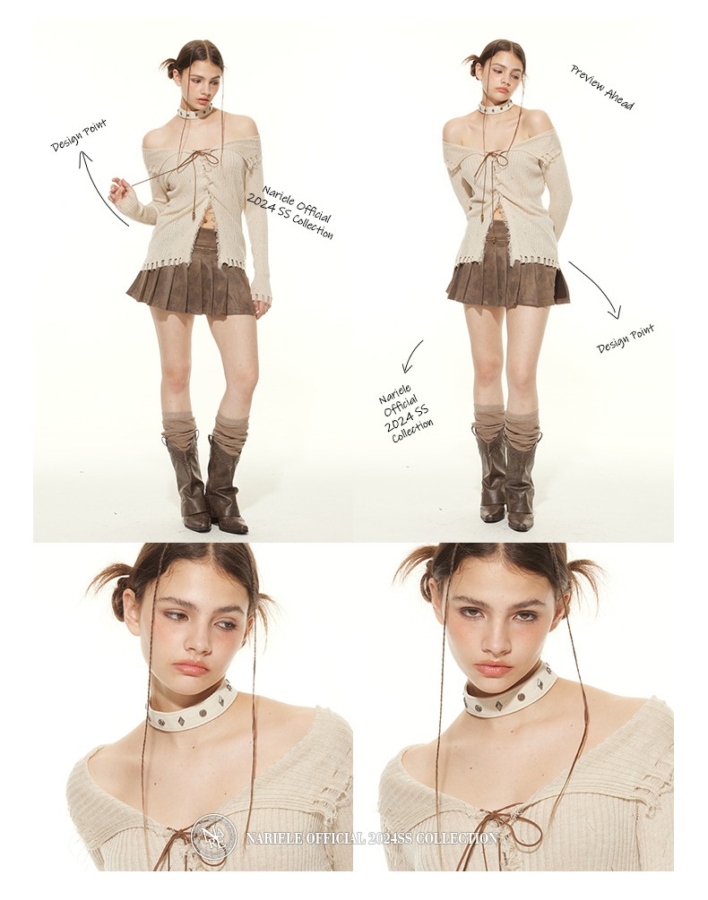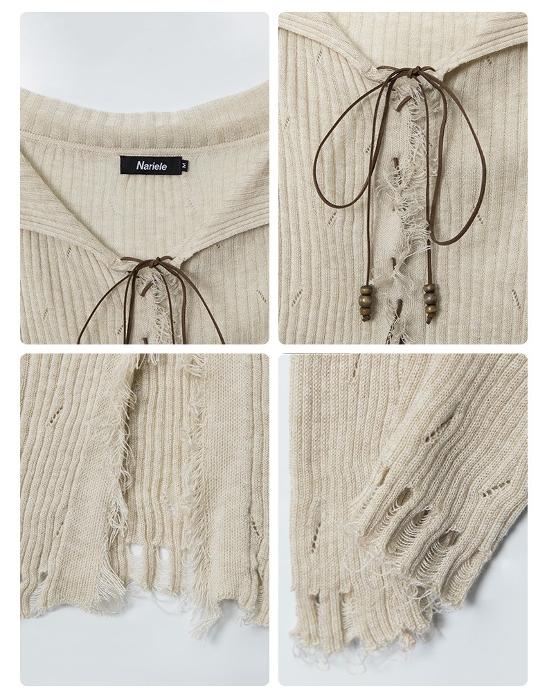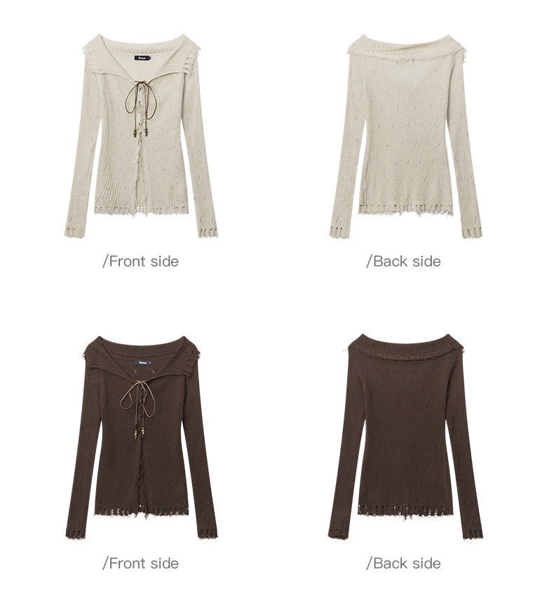 美式辣妹風破洞時尚設計感綁帶修身顯瘦長袖針織衫女秋季