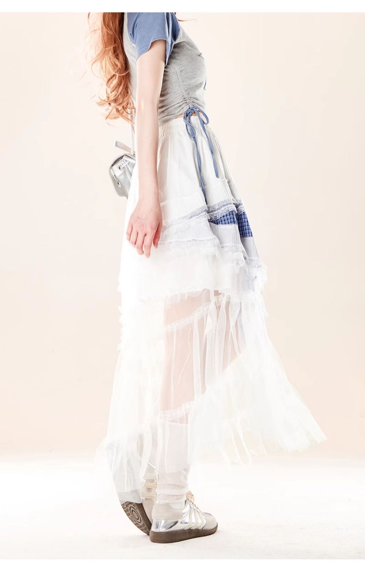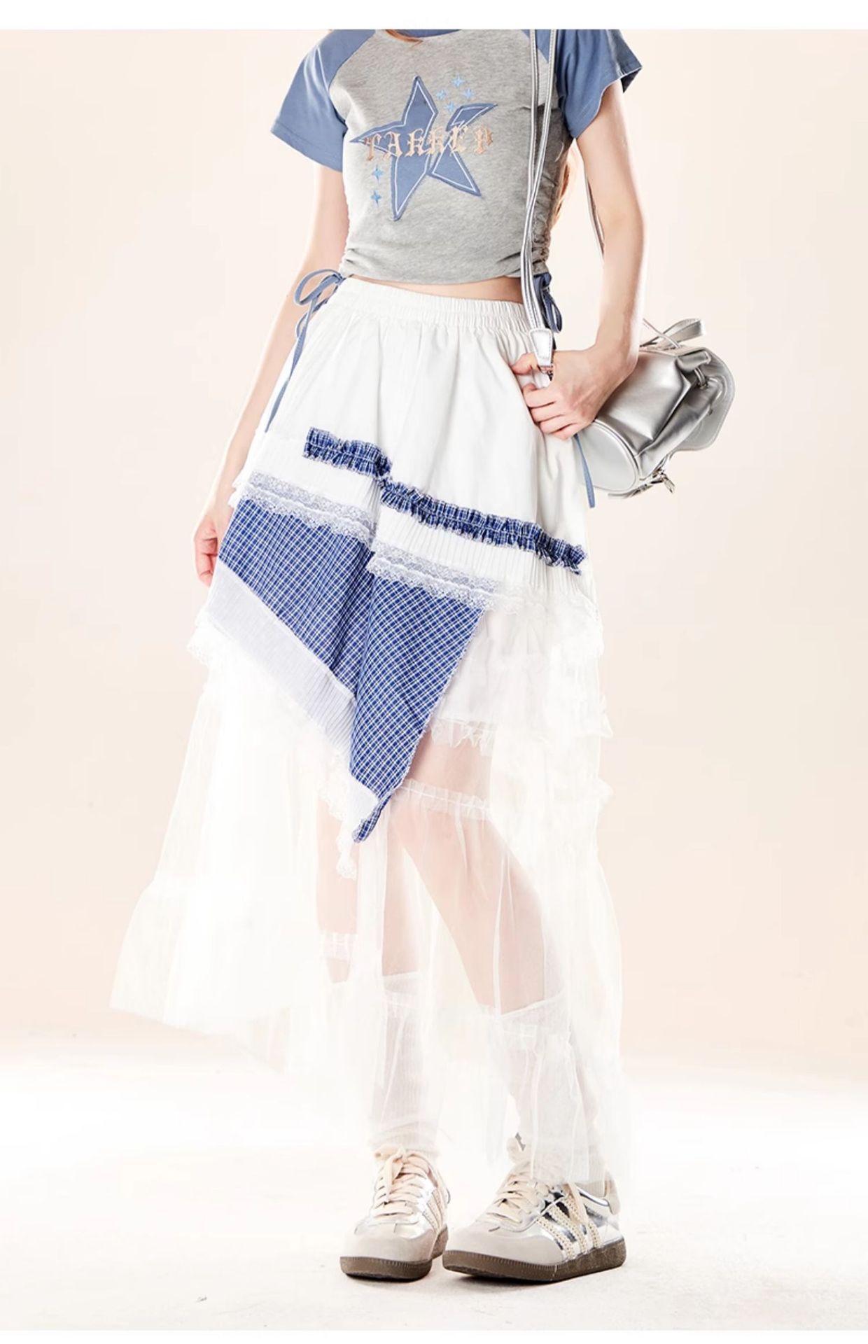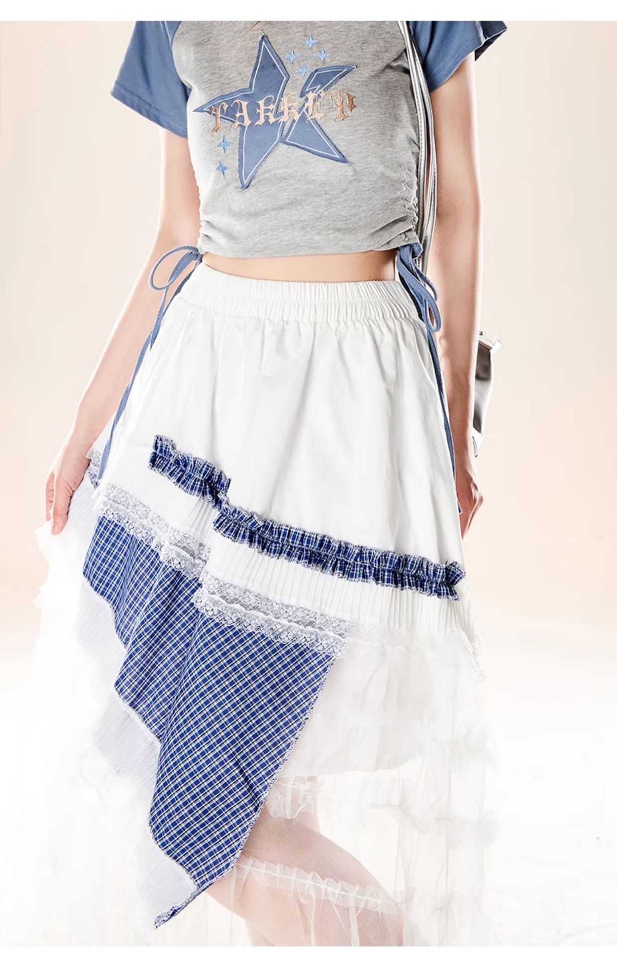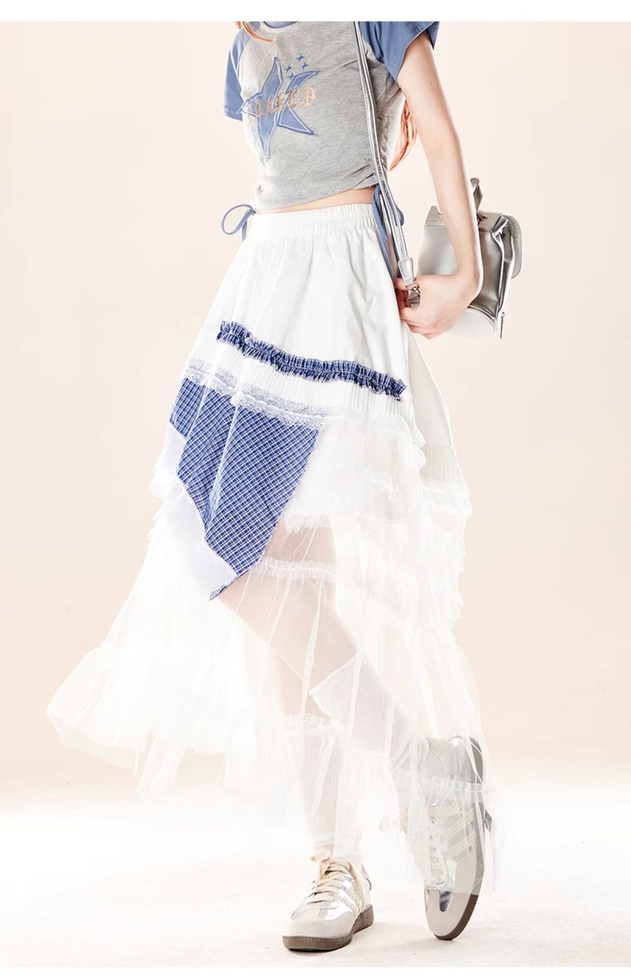 設計感花邊拼接格紋拼色長裙女夏季層疊荷葉邊不規則半身裙