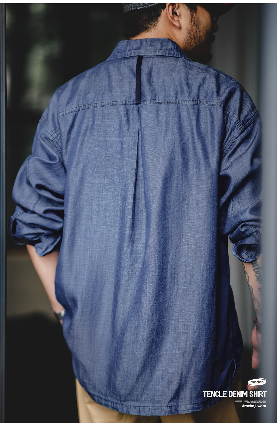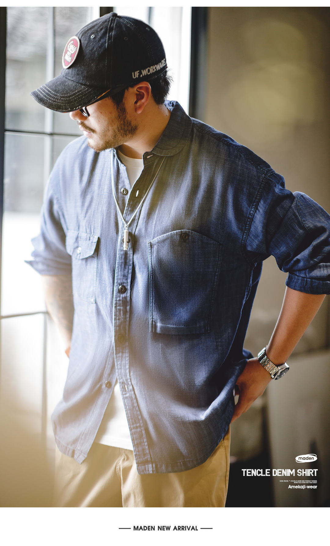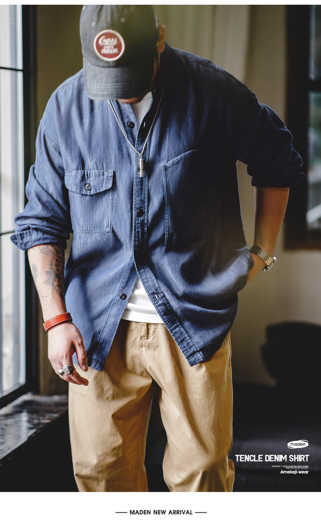 馬登工裝 美式復古天絲牛仔襯衫丹寧萊賽爾長袖襯衣外套