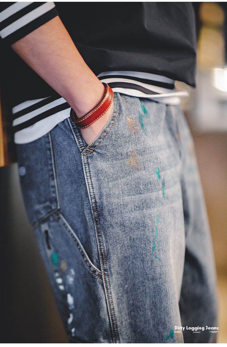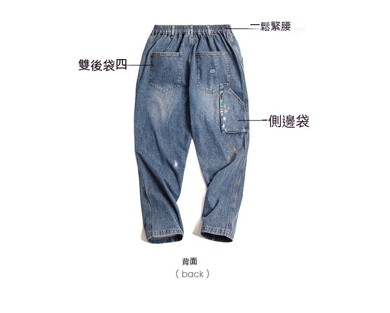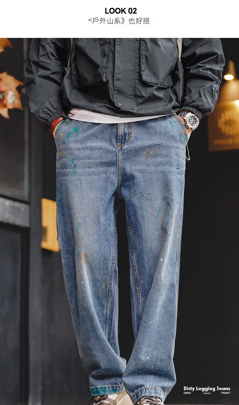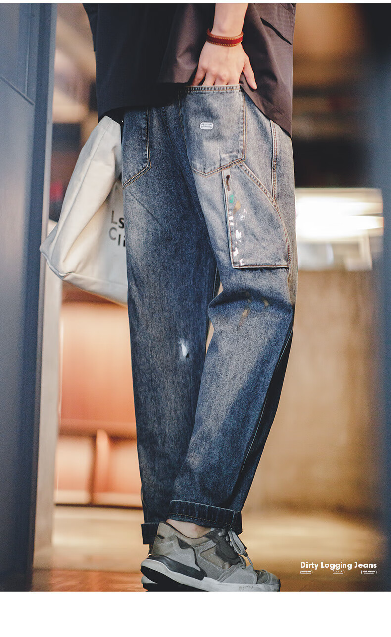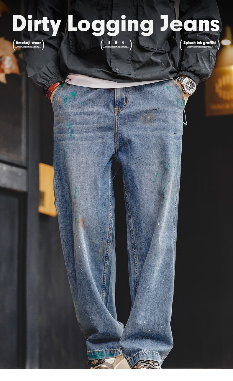 馬登工裝 美式復古潑墨塗鴉牛仔褲竹節紋水洗直筒長褲伐木褲