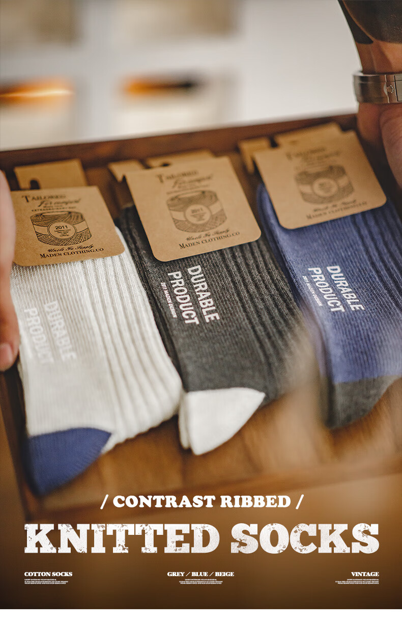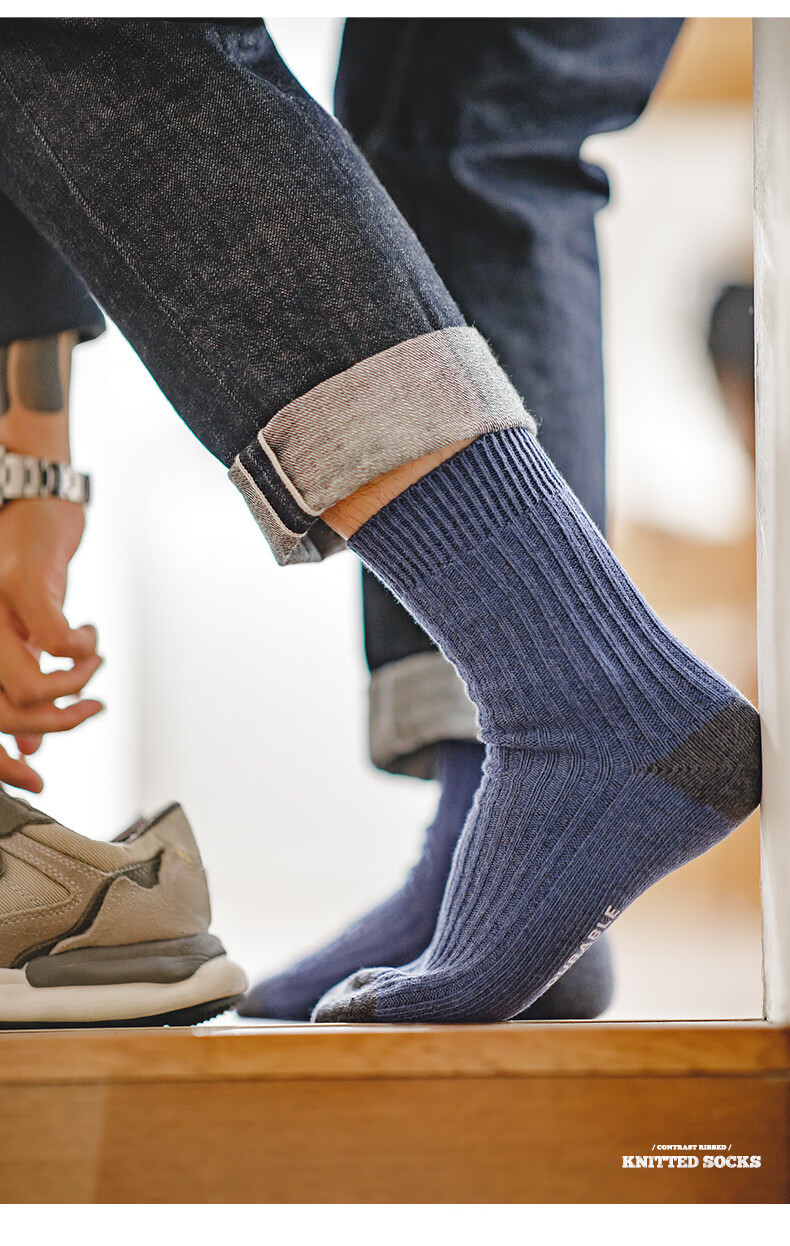 馬登工裝 美式休閒撞色羅紋針織襪子三色坑條粗線長襪