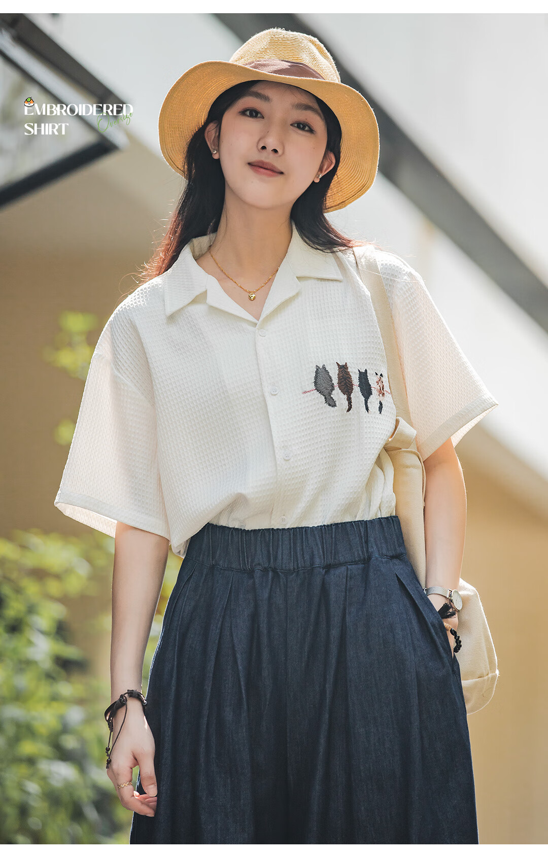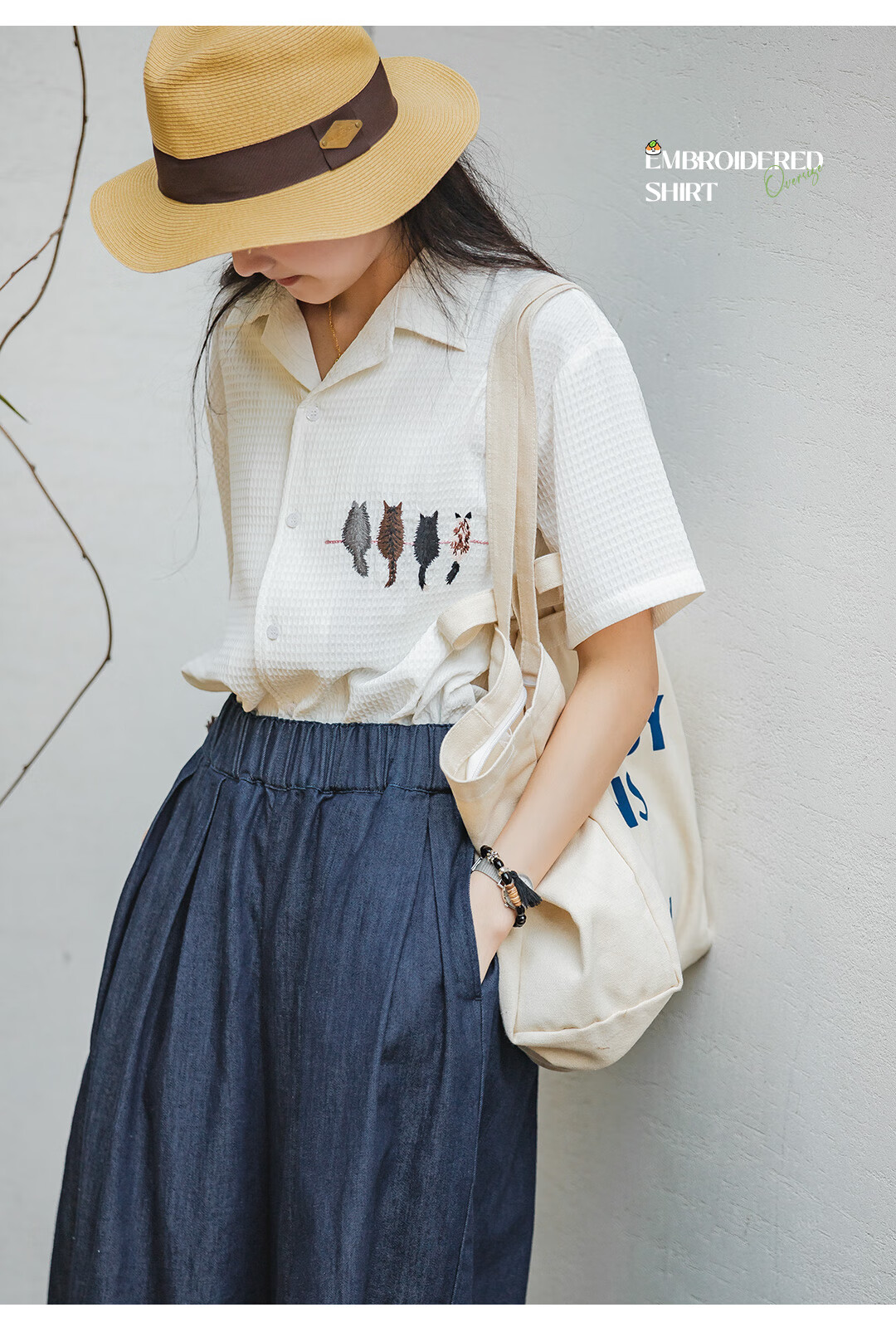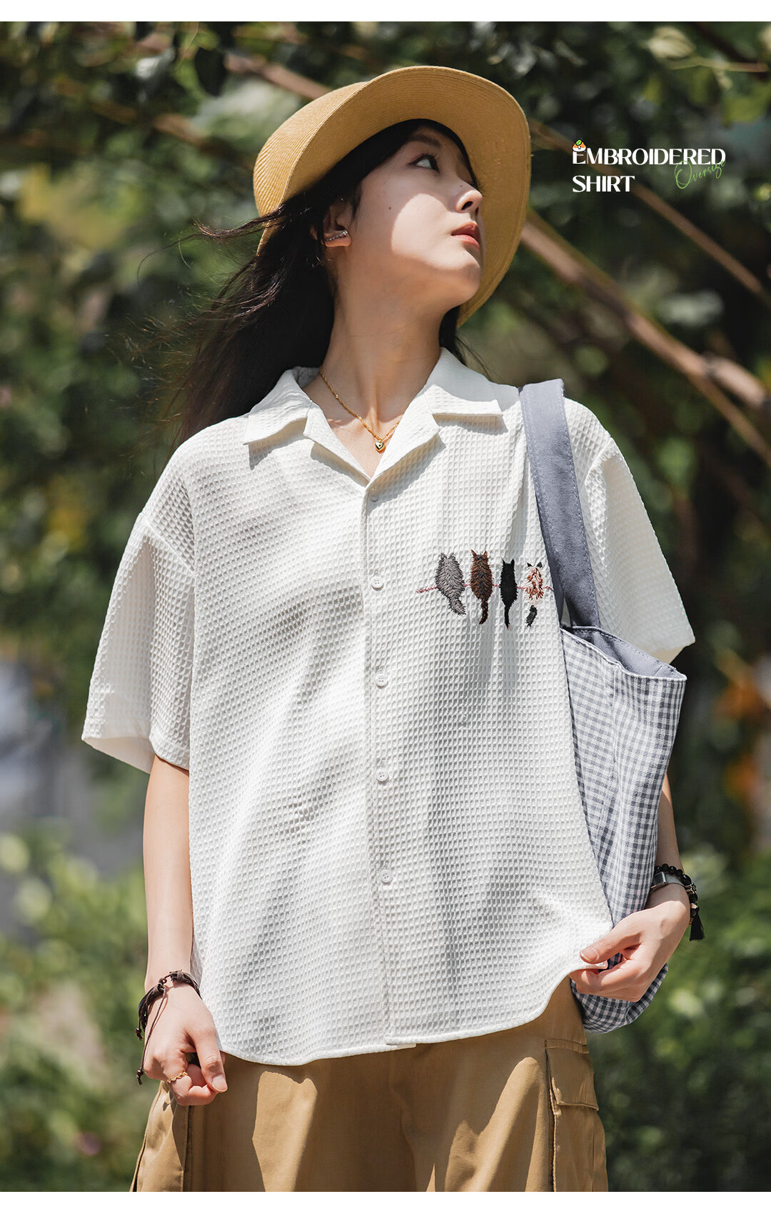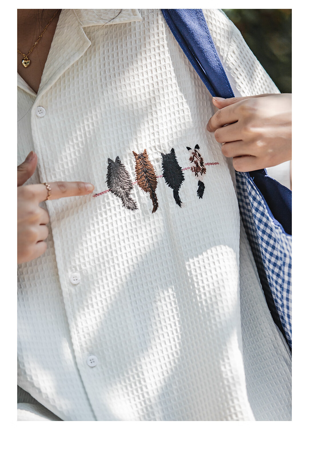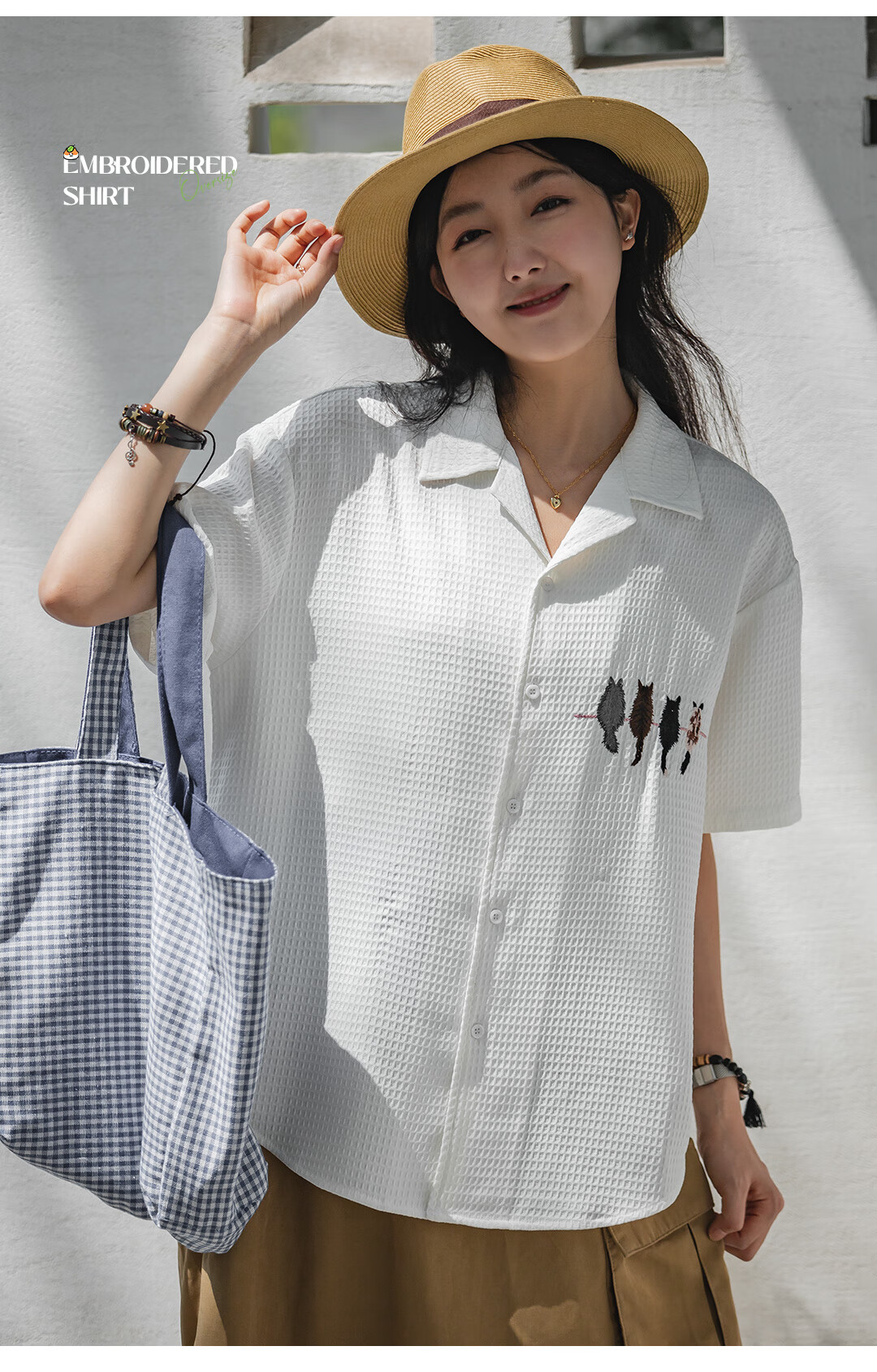 馬登女裝 休閒貓咪刺繡短袖襯衫寬鬆落肩袖華夫格襯衣