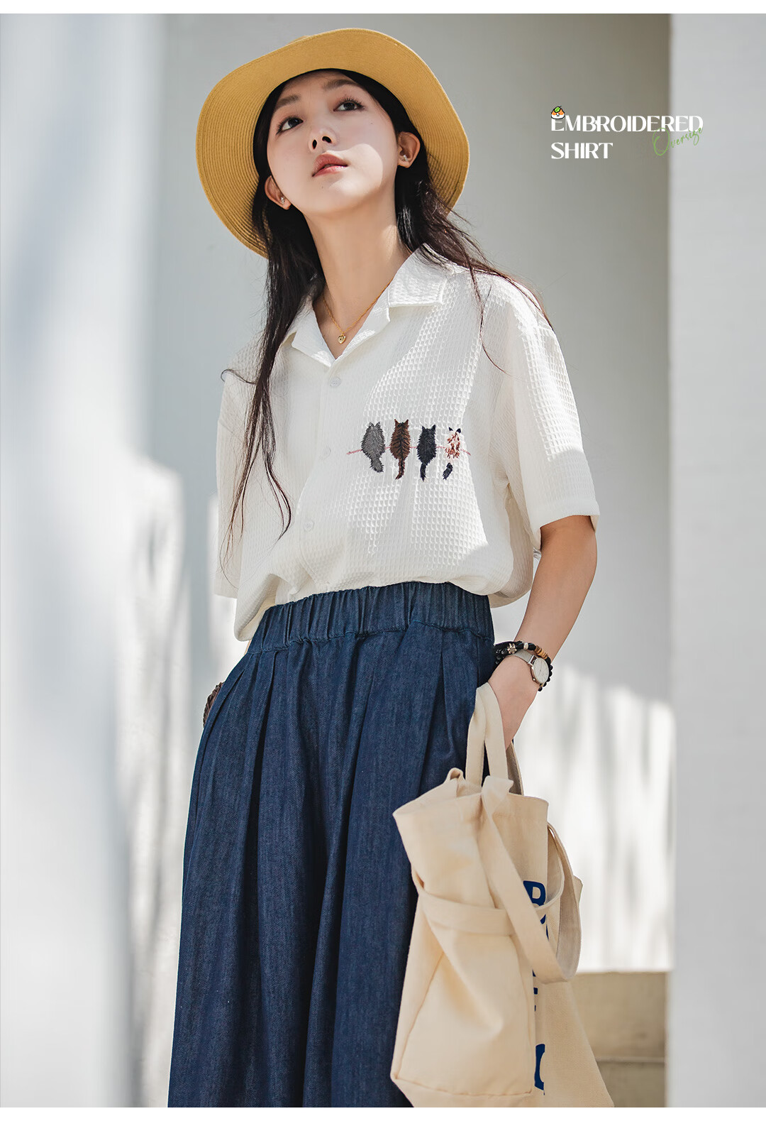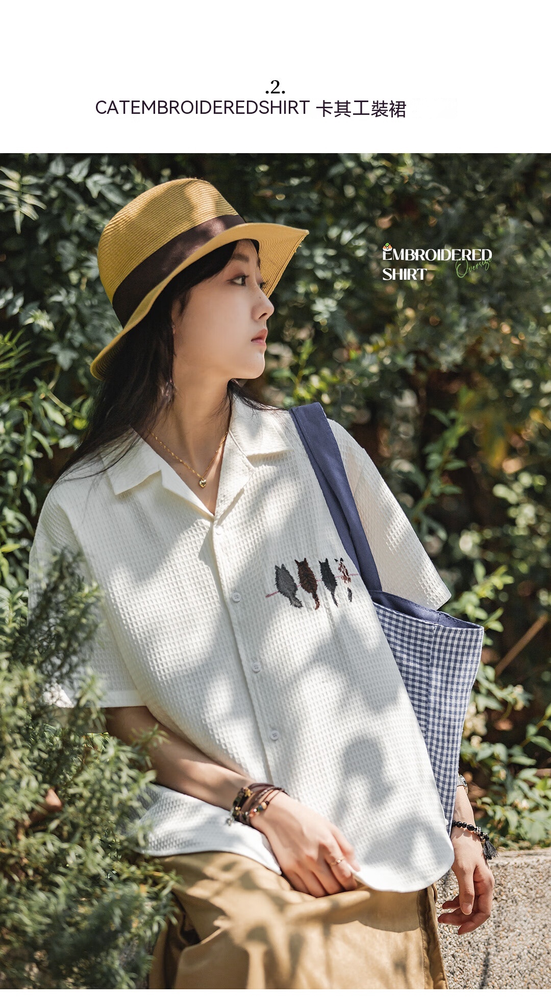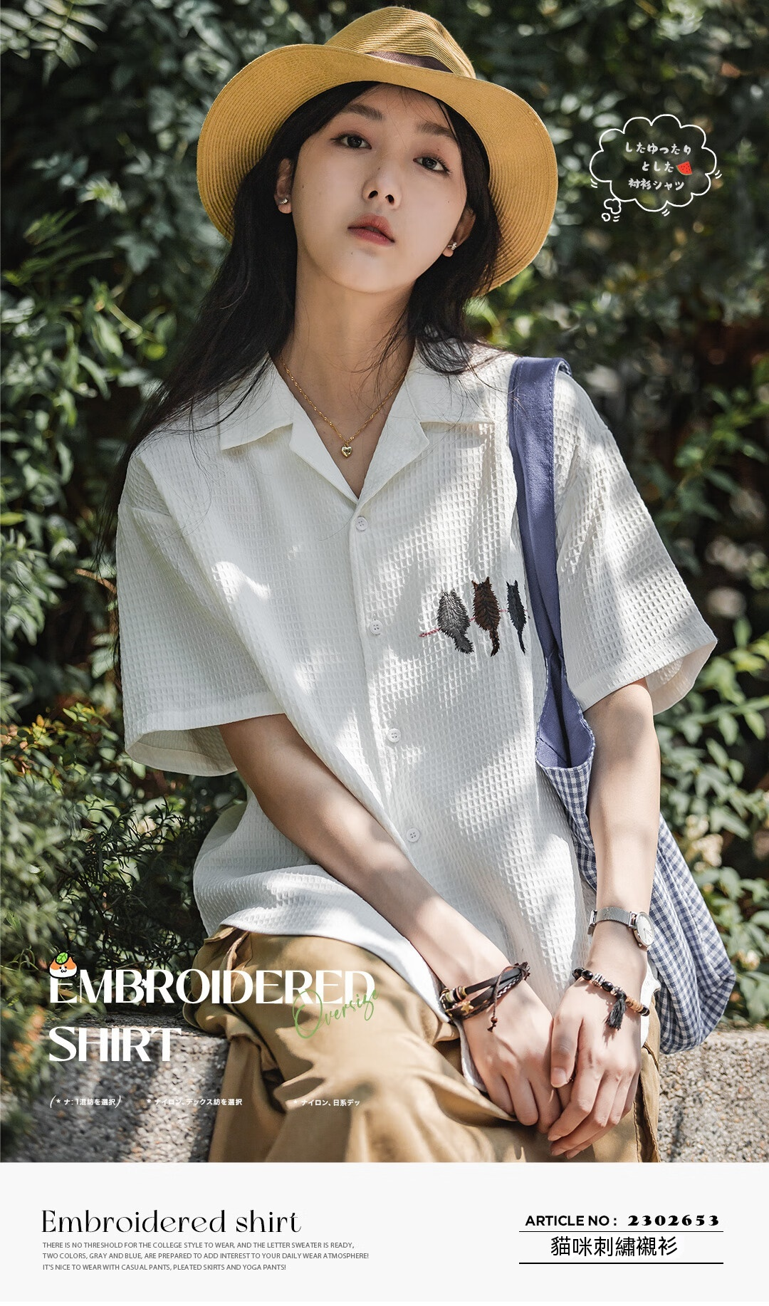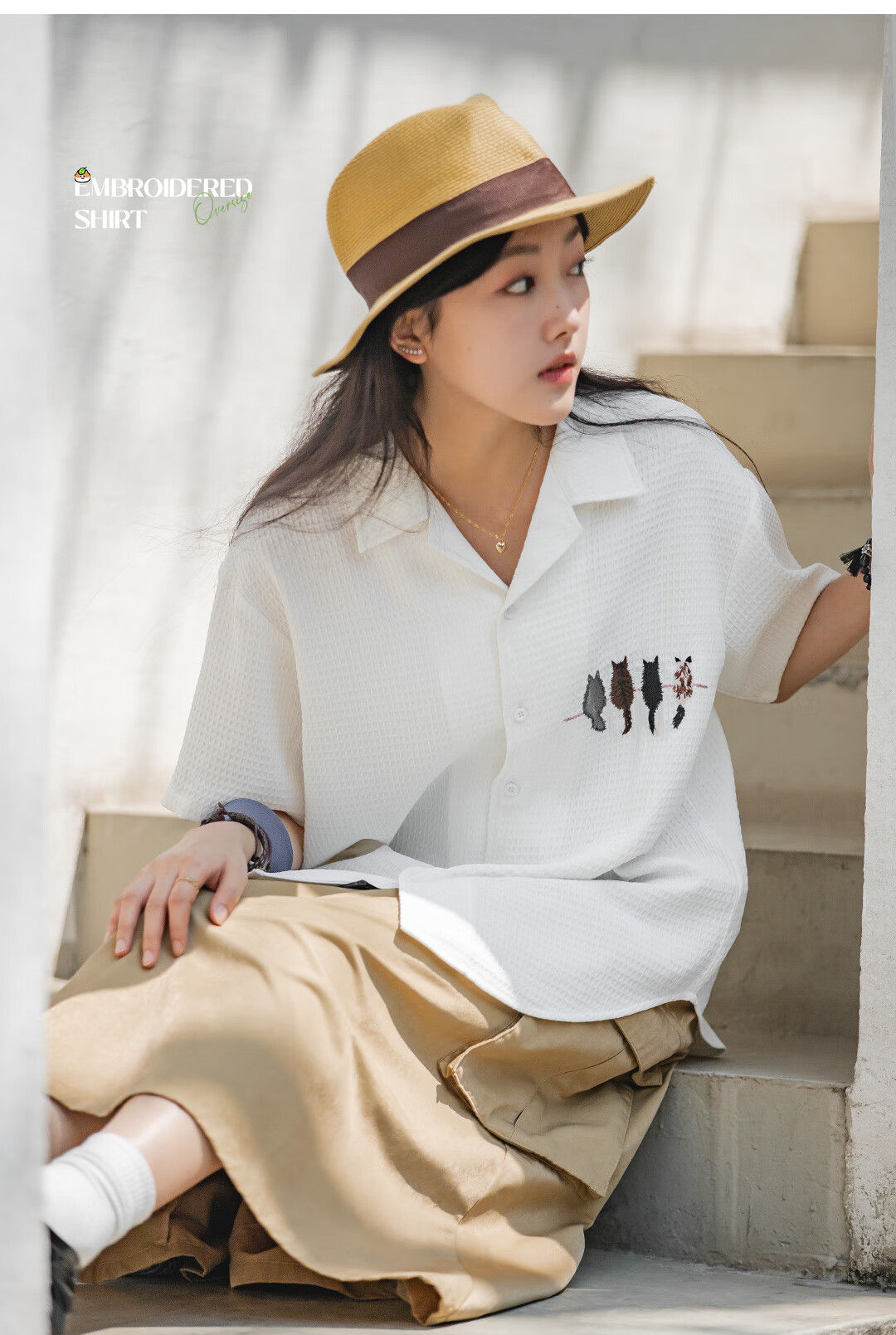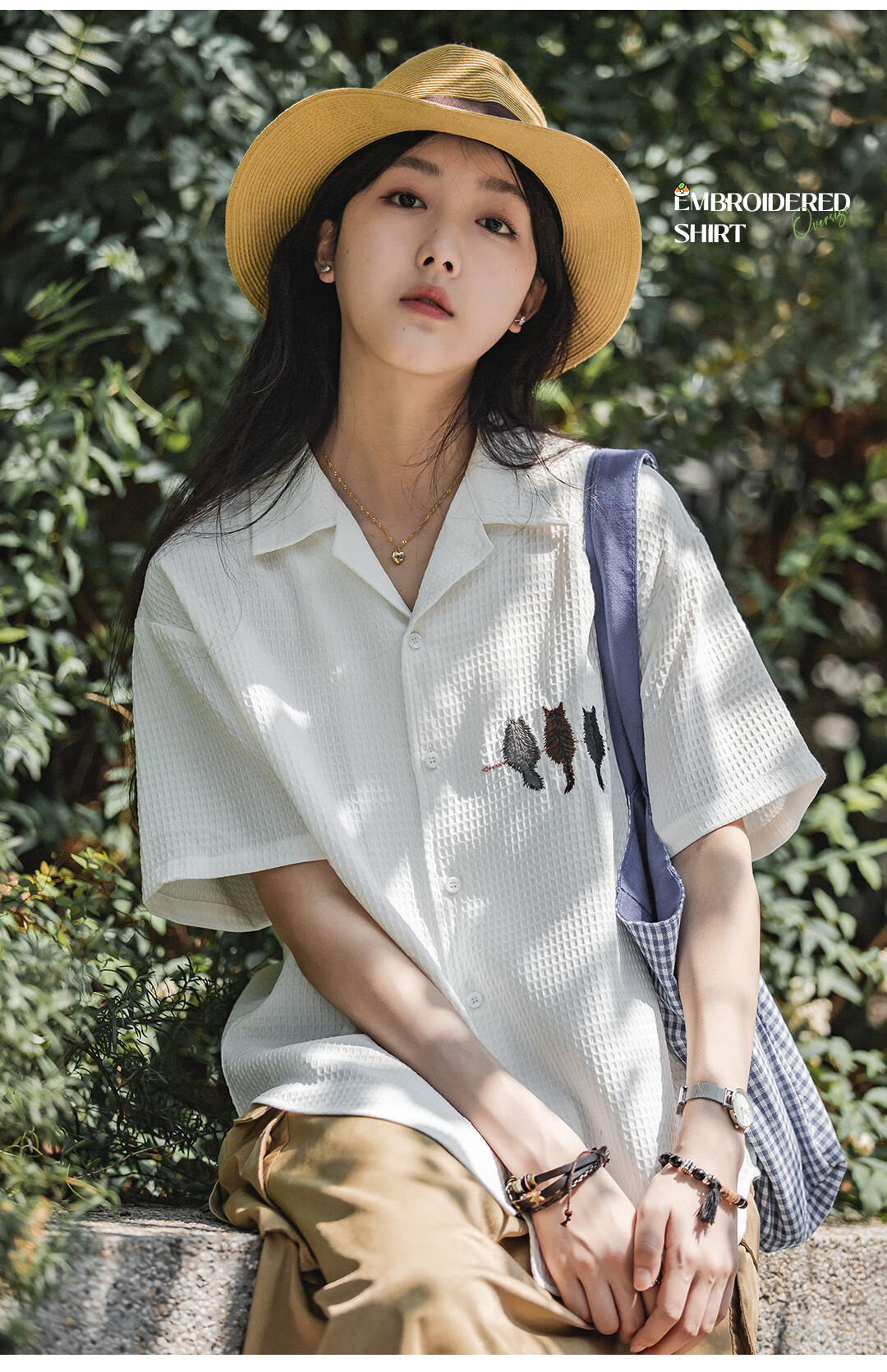 馬登女裝 休閒貓咪刺繡短袖襯衫寬鬆落肩袖華夫格襯衣
