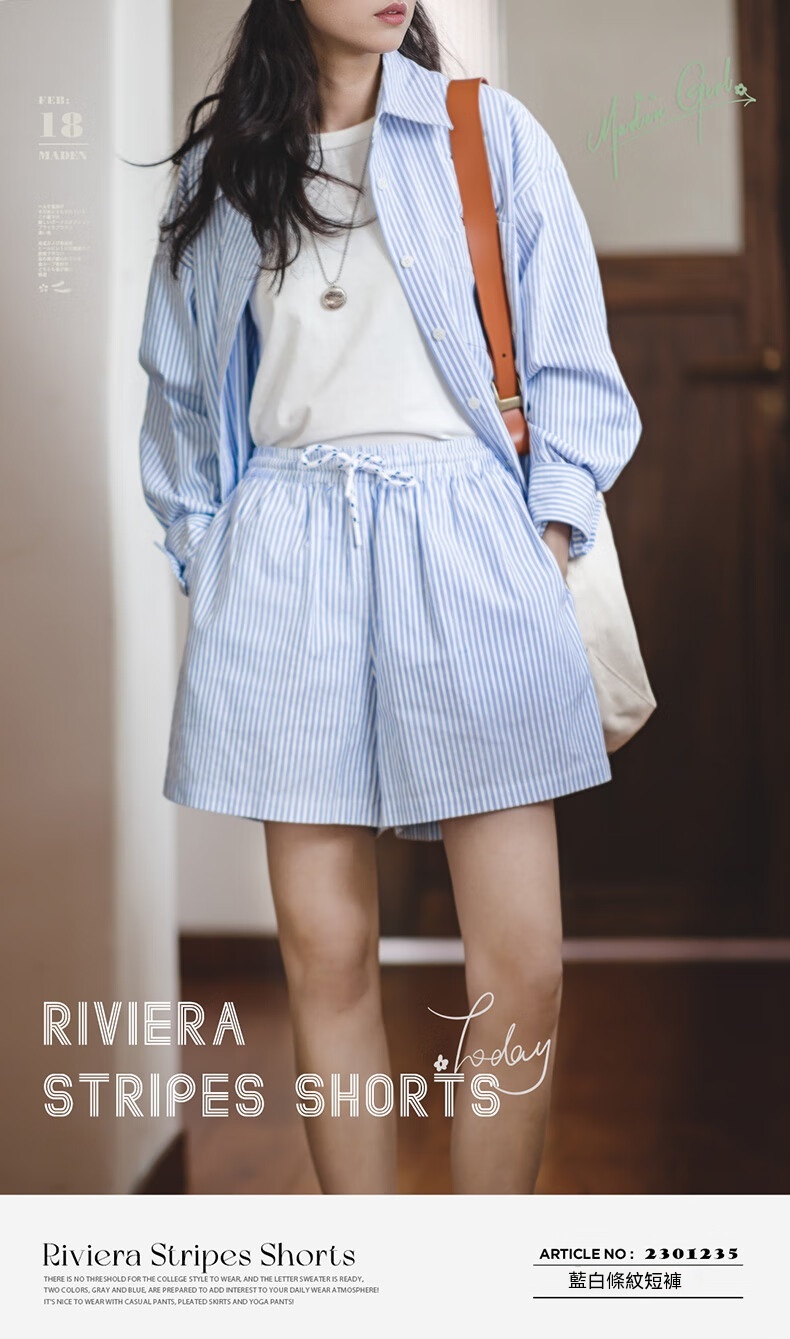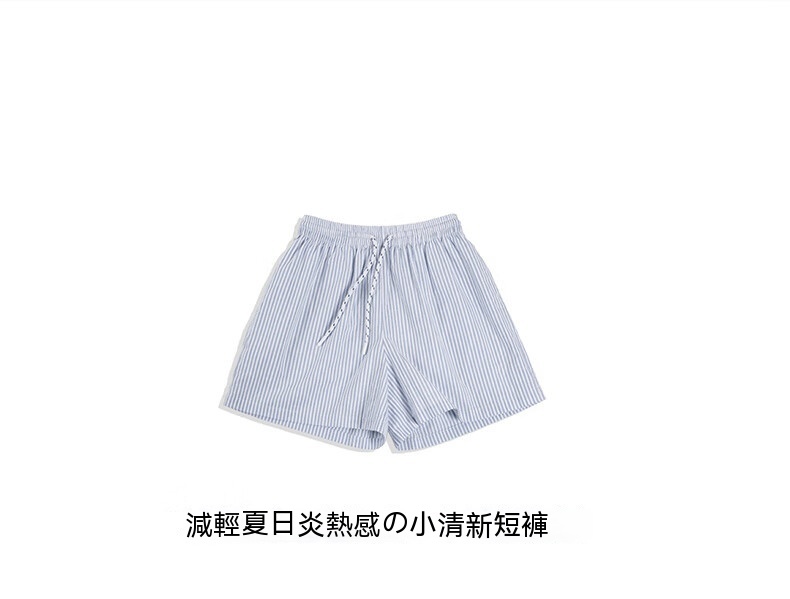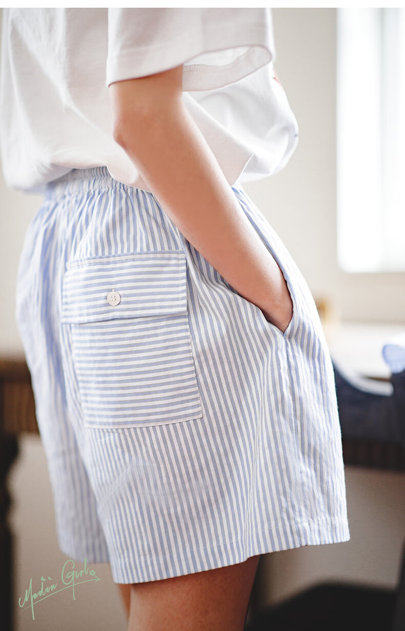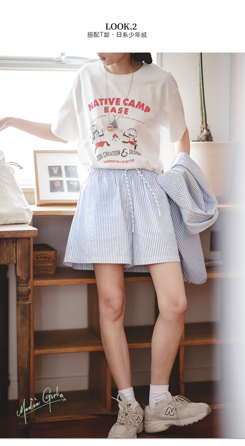 馬登女裝 藍白條紋休閒A字短褲純棉寬鬆顯瘦高腰運動闊腿短褲