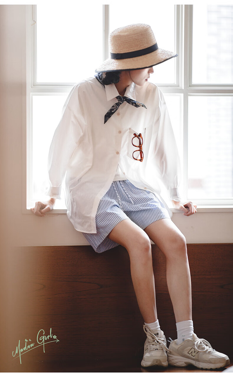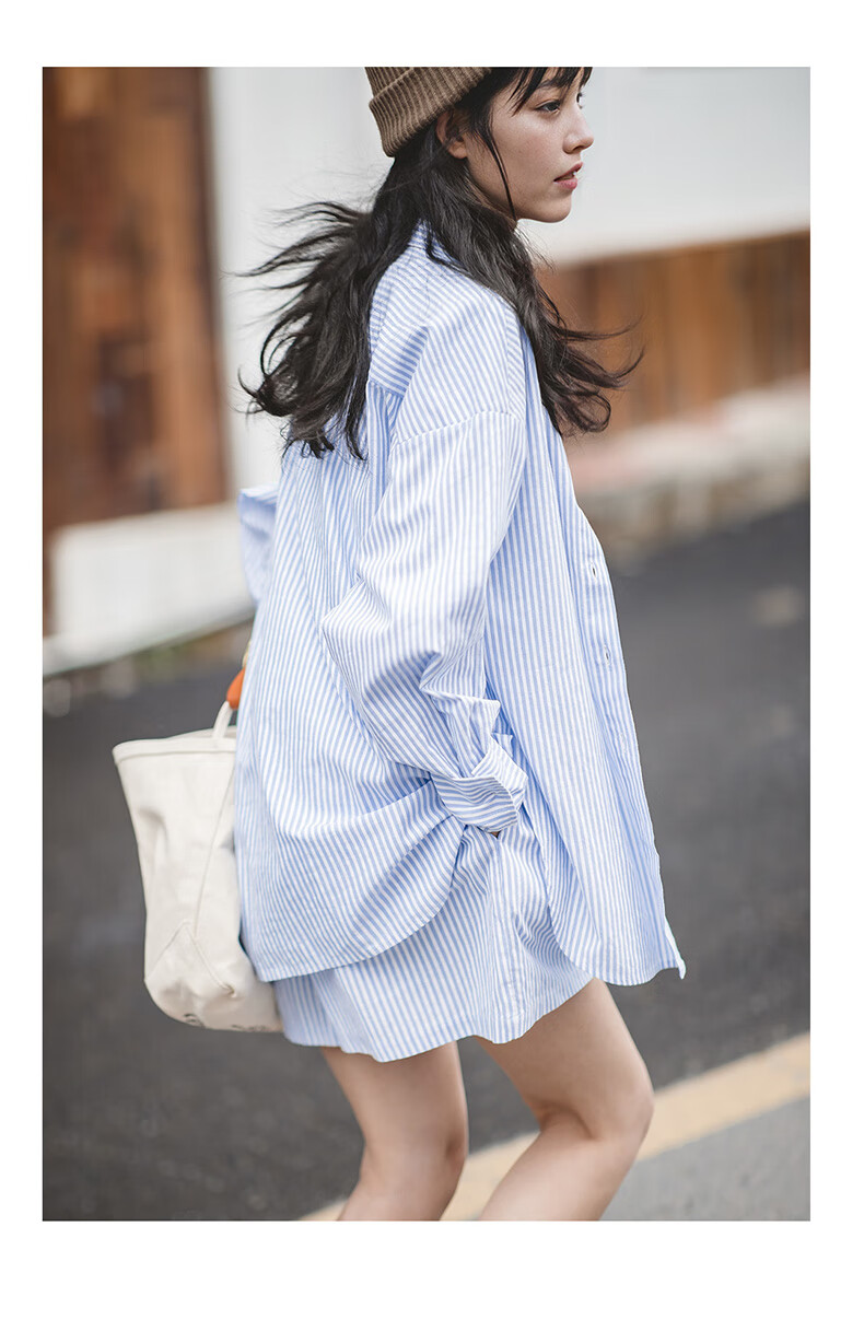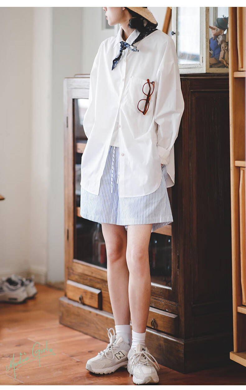馬登女裝 藍白條紋休閒A字短褲純棉寬鬆顯瘦高腰運動闊腿短褲