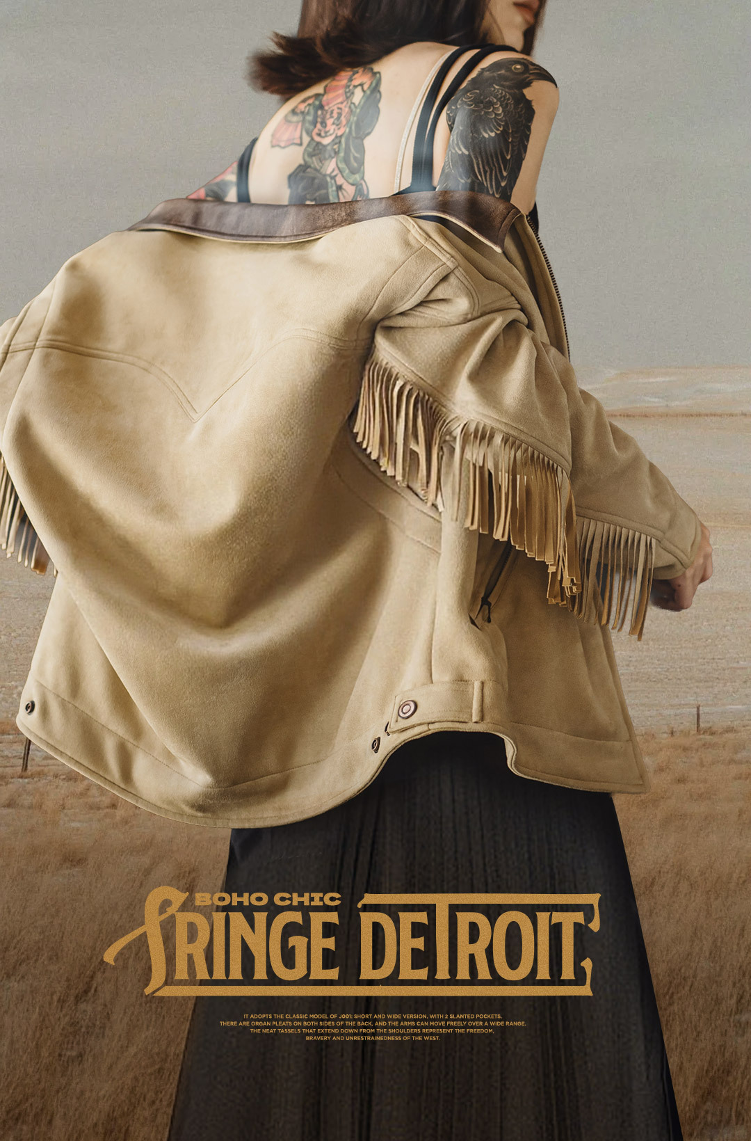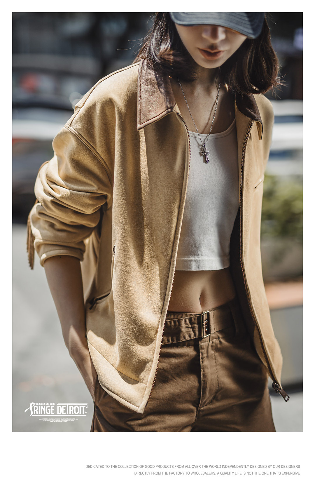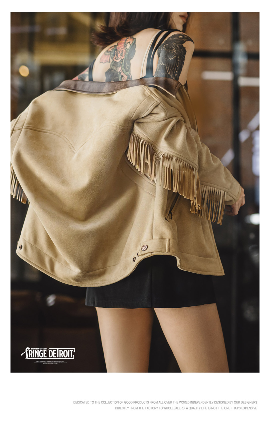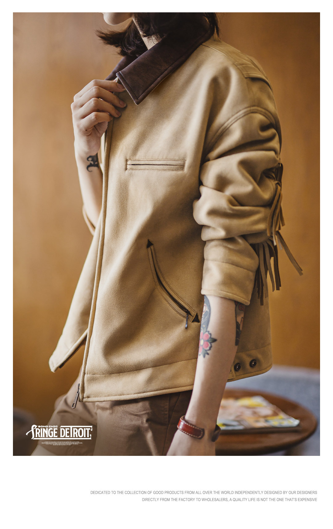 馬登女裝 巴恩風卡其撞色翻領絨面麂皮流蘇底特律工裝夾克外套女士秋冬