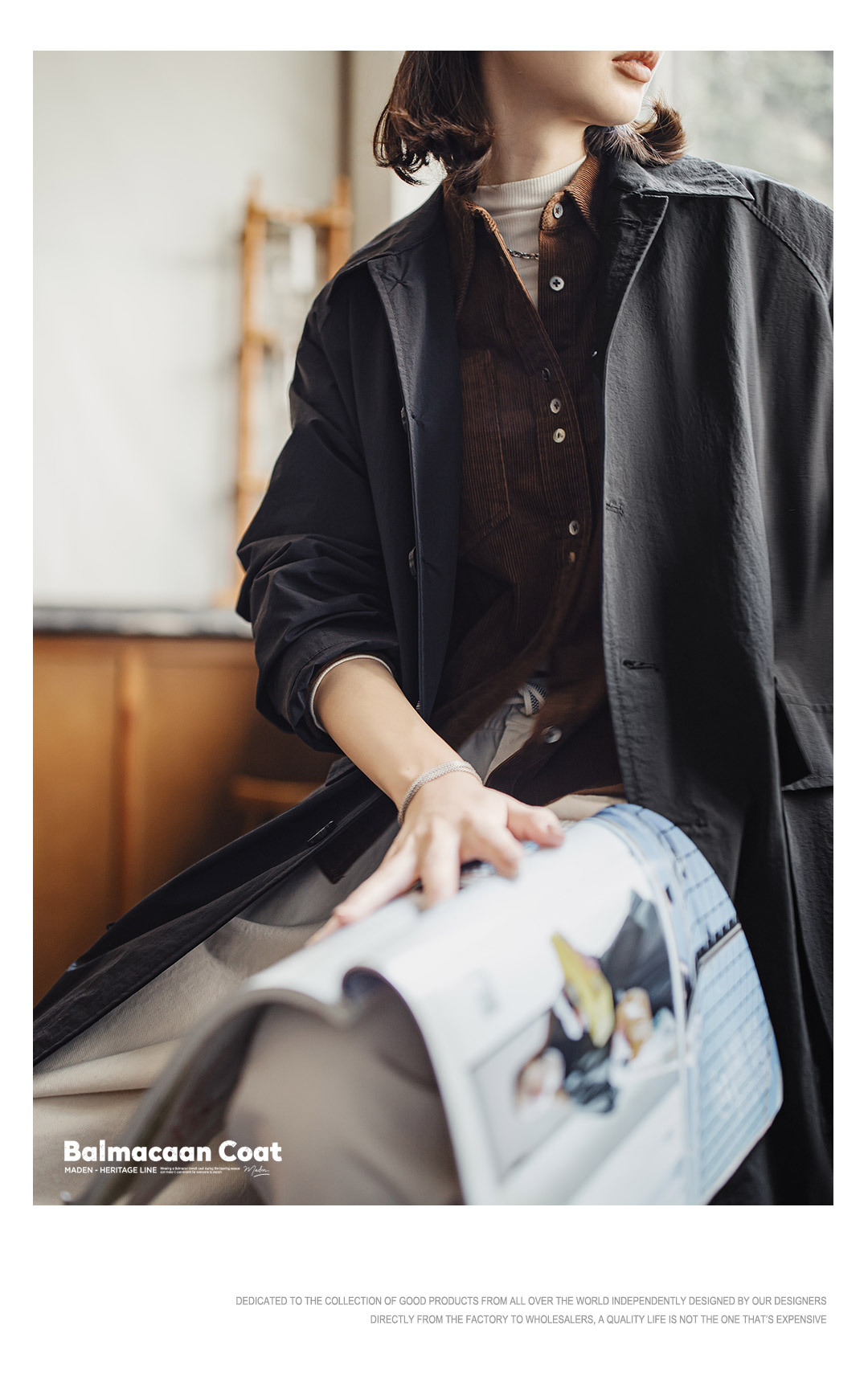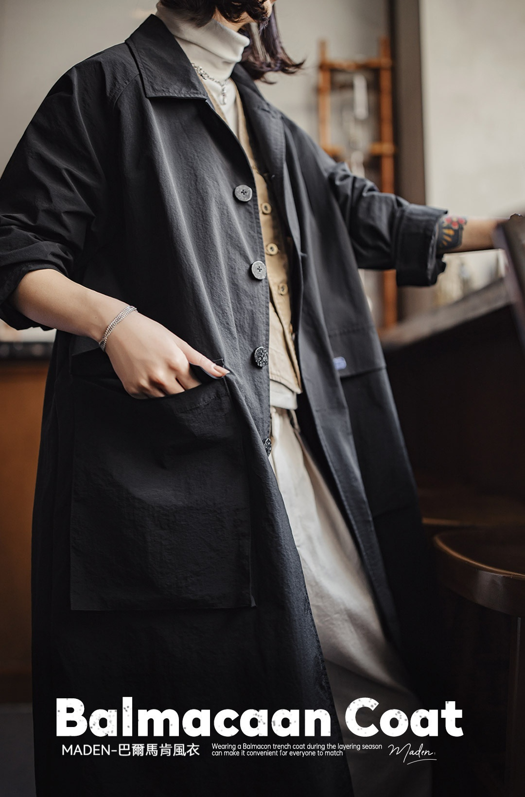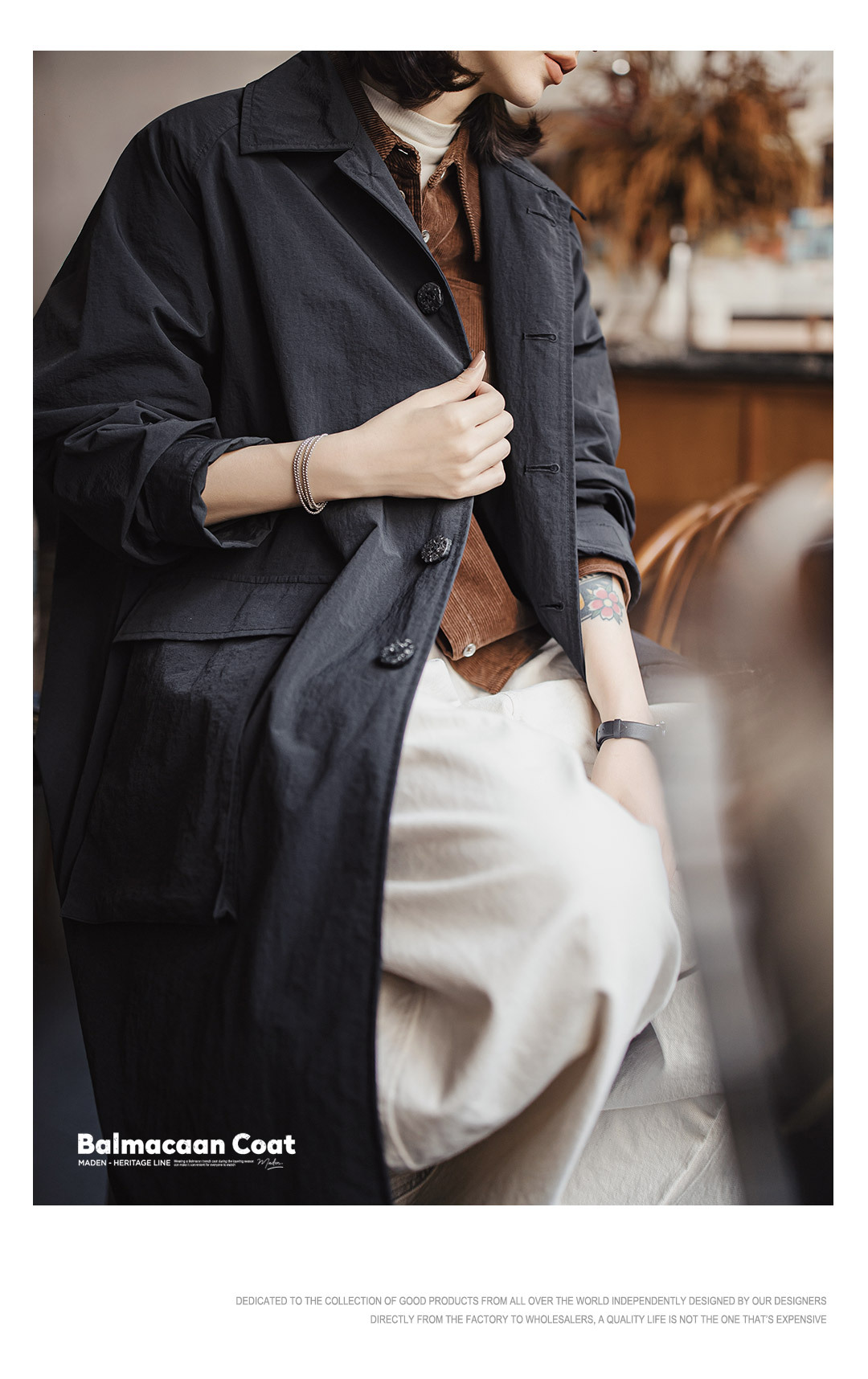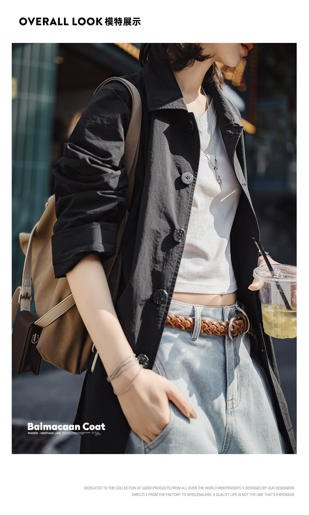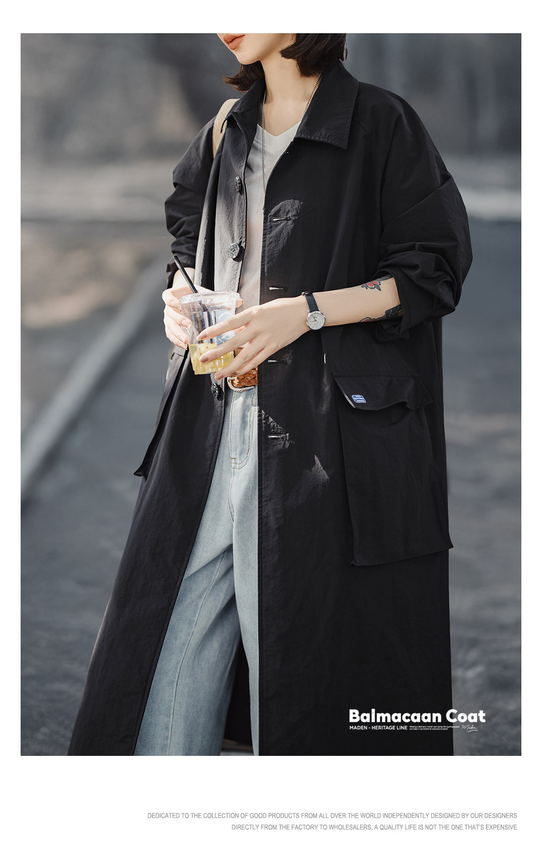 馬登女裝 黑色翻領寬鬆中長薄款大衣高個子休閒工裝風衣外套女士早秋季