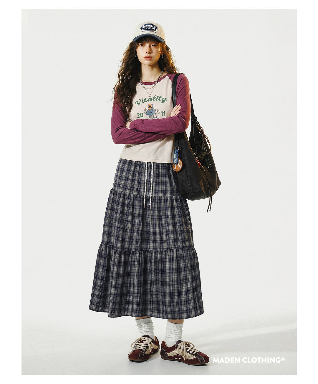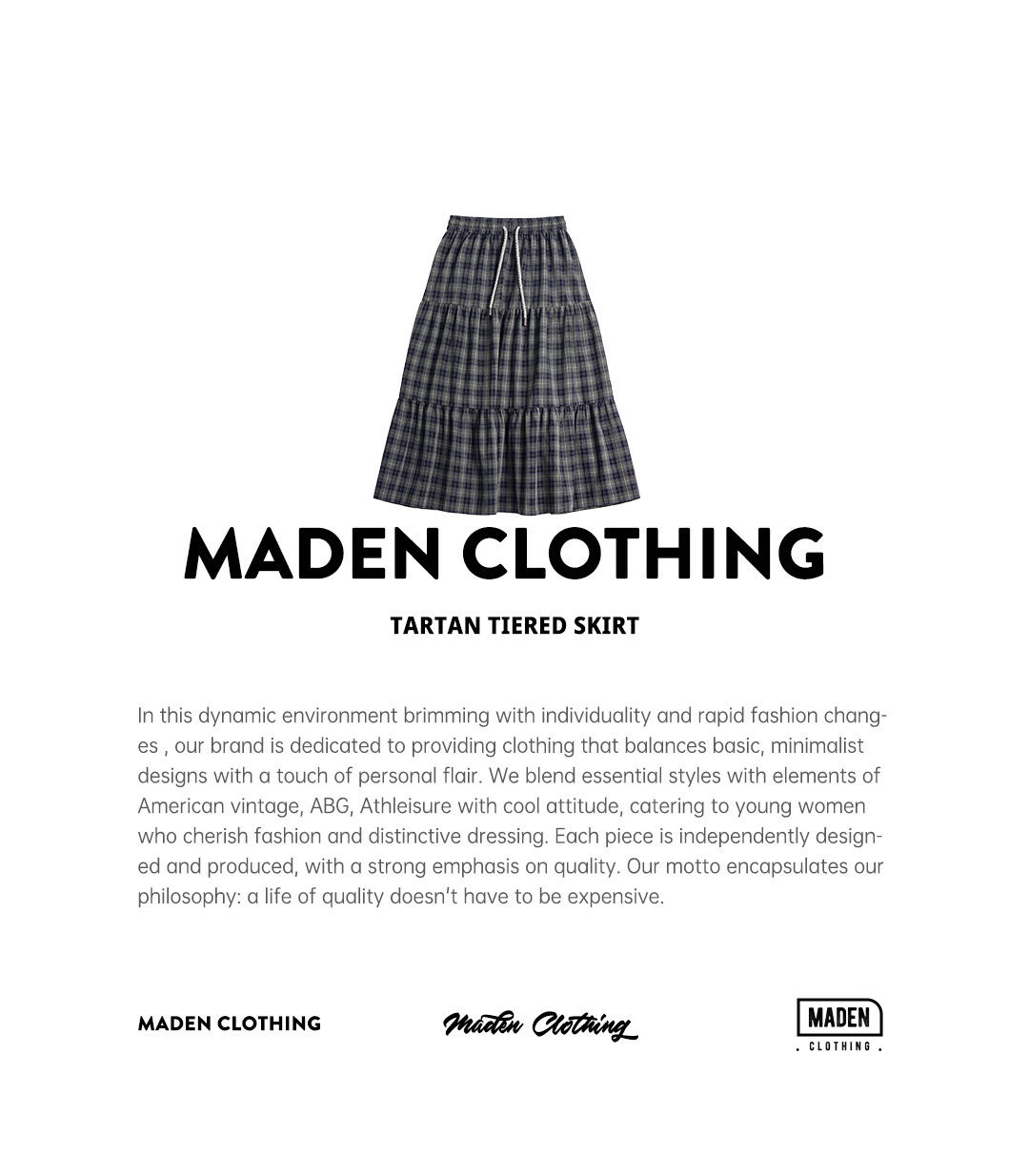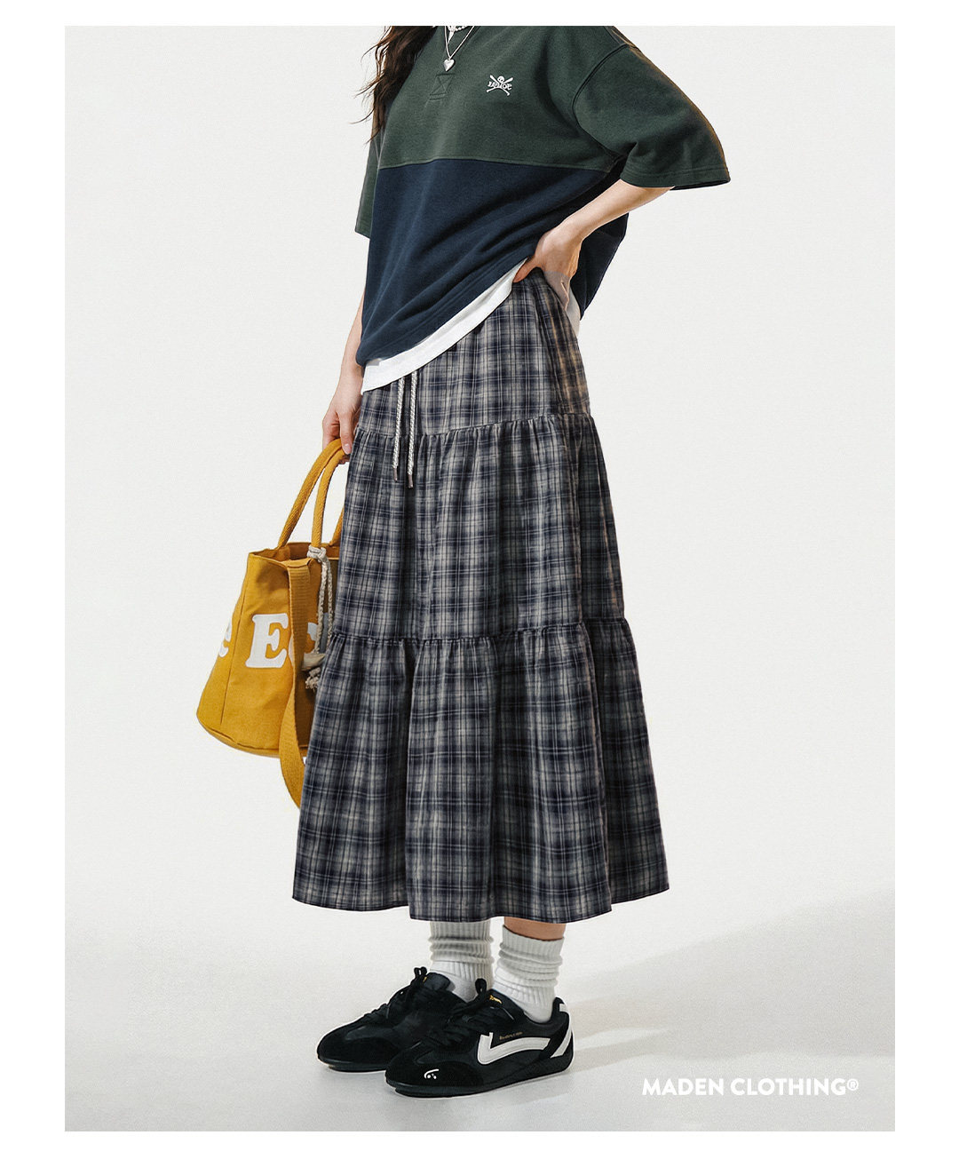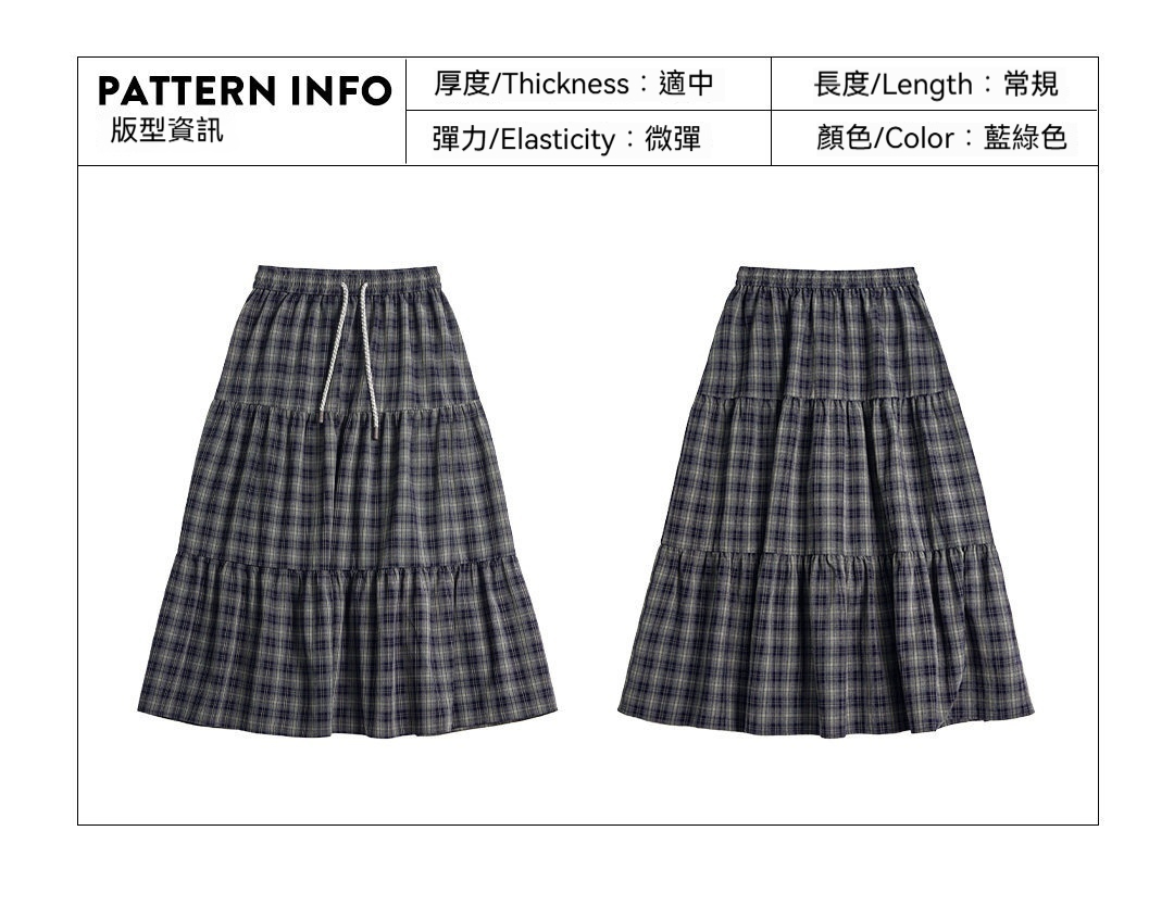 馬登女裝 藍綠色復古鬆緊腰A字蛋糕裙日系百褶拼接格子紋半身長裙春季