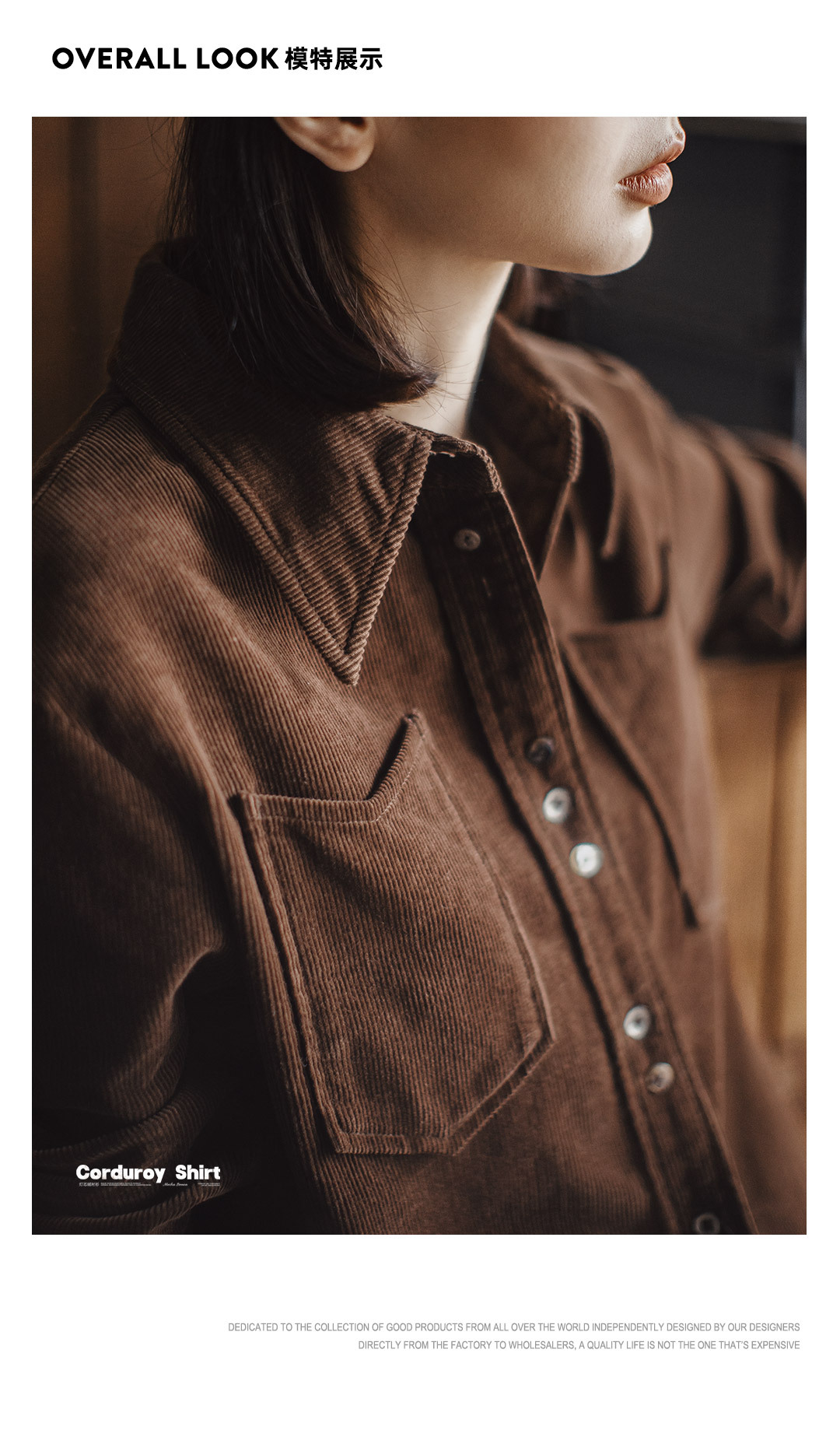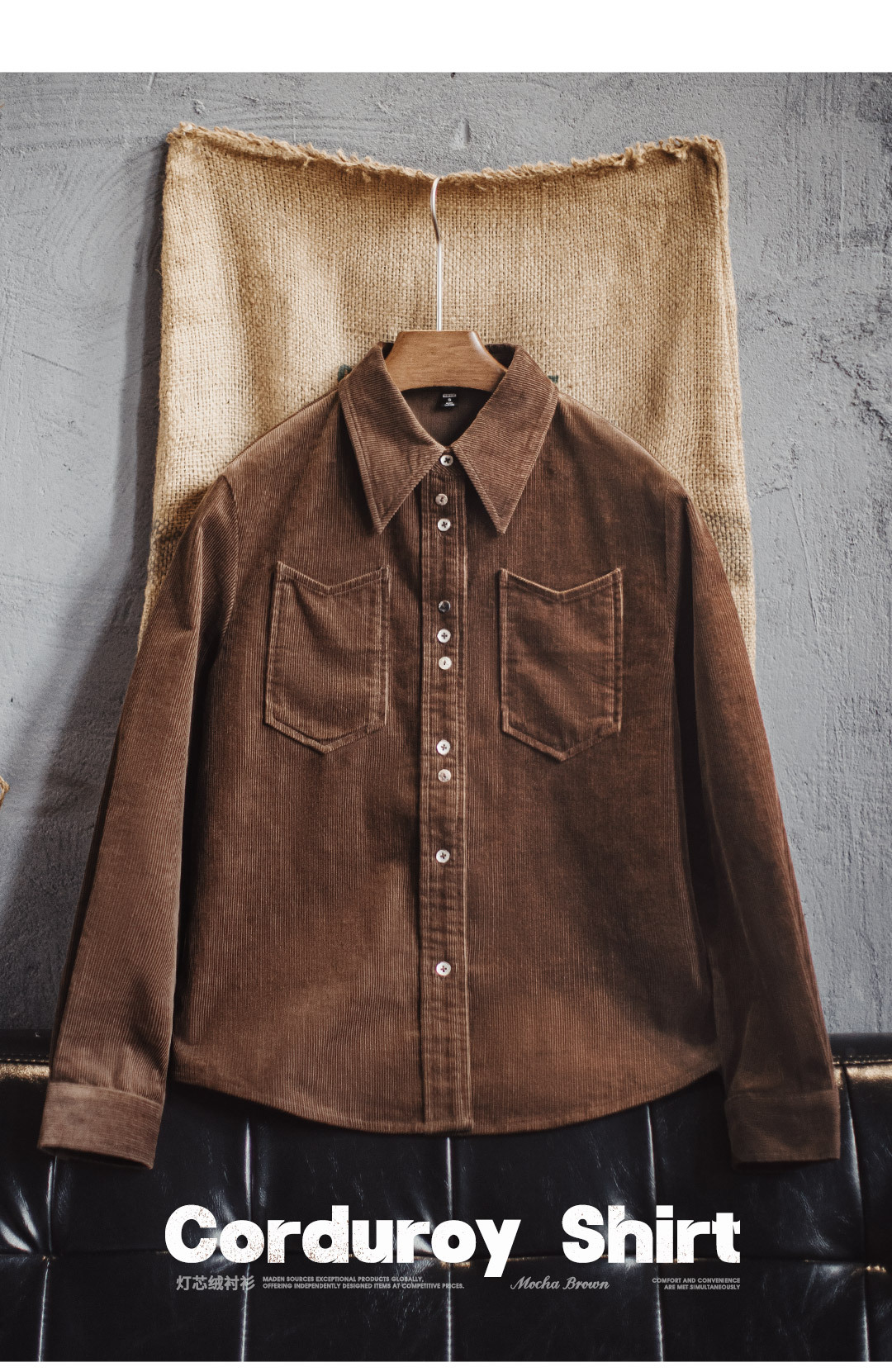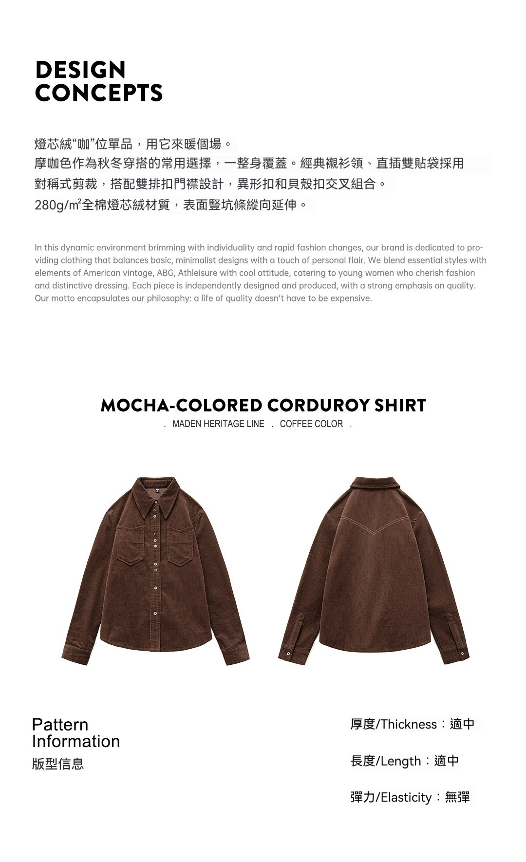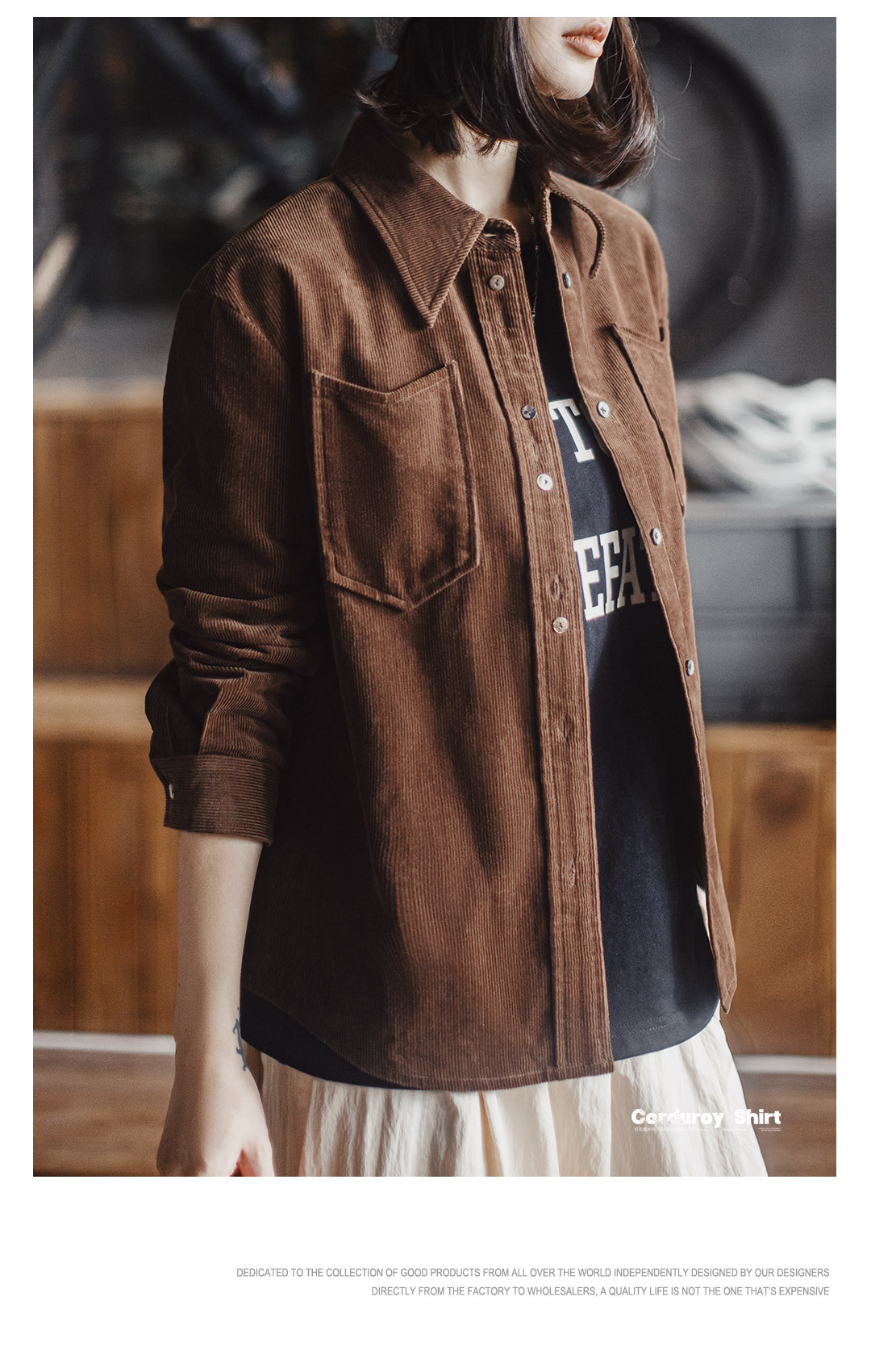 馬登女裝 美拉德咖色純棉燈芯絨上衣雙排扣肌理感長袖襯衫外套秋冬