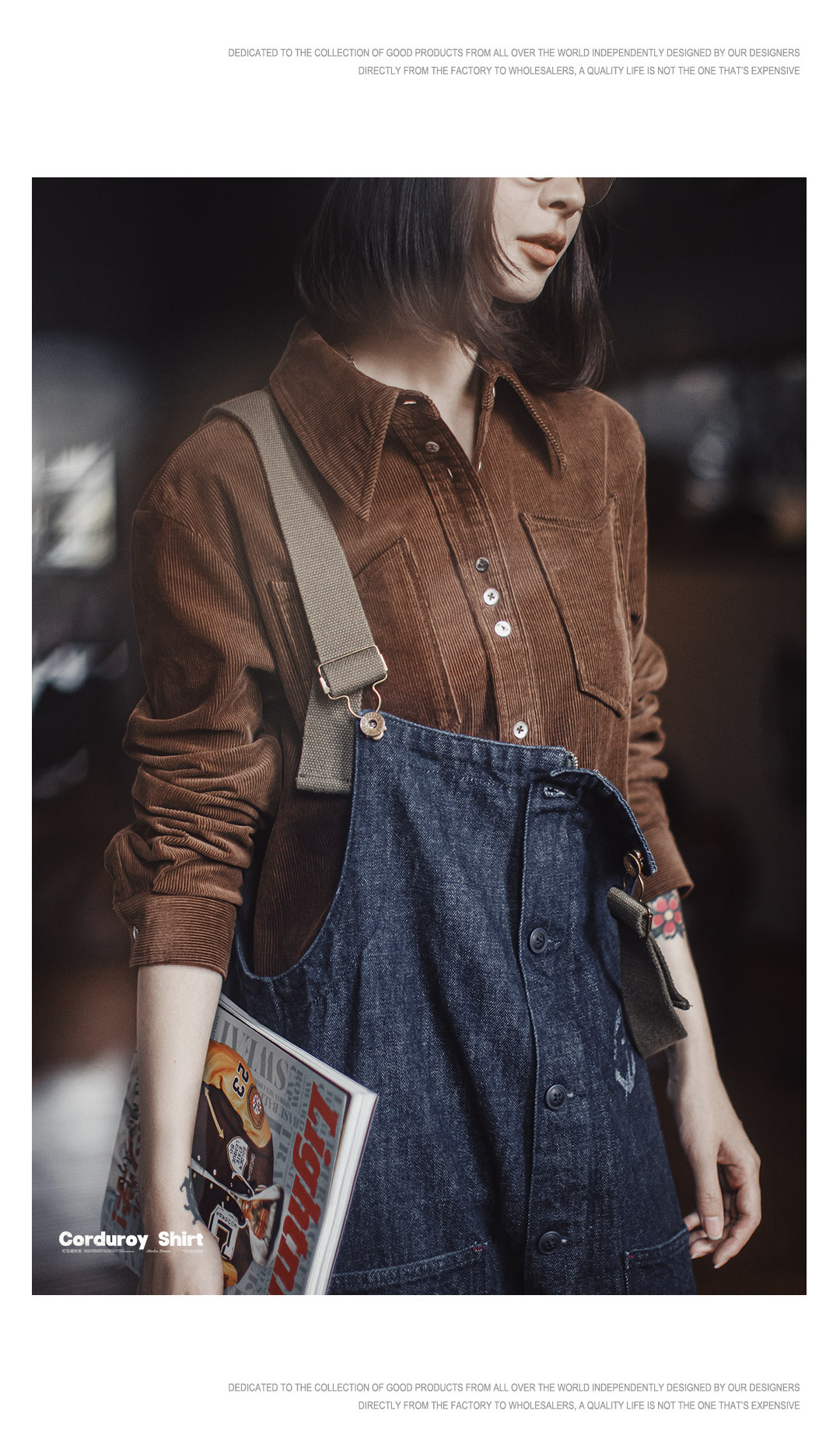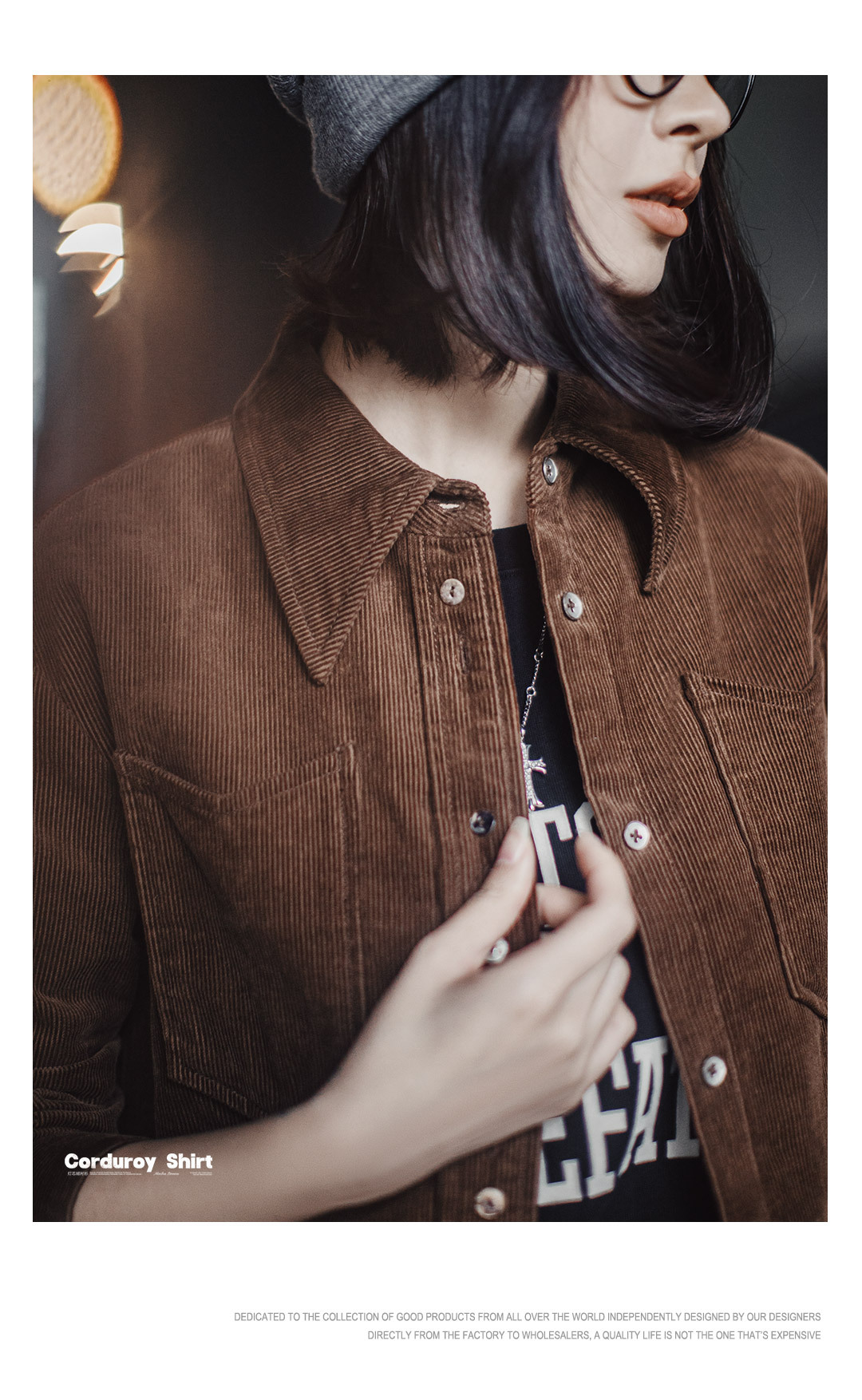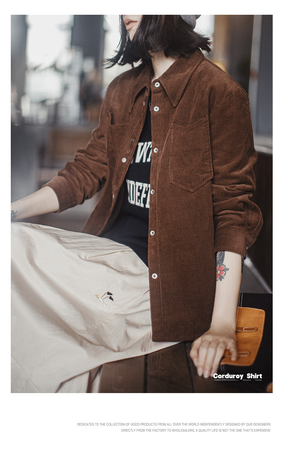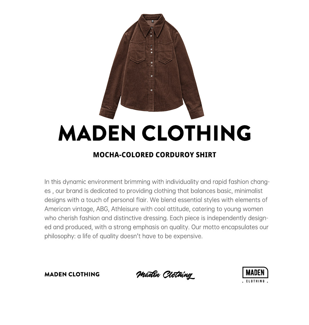 馬登女裝 美拉德咖色純棉燈芯絨上衣雙排扣肌理感長袖襯衫外套秋冬