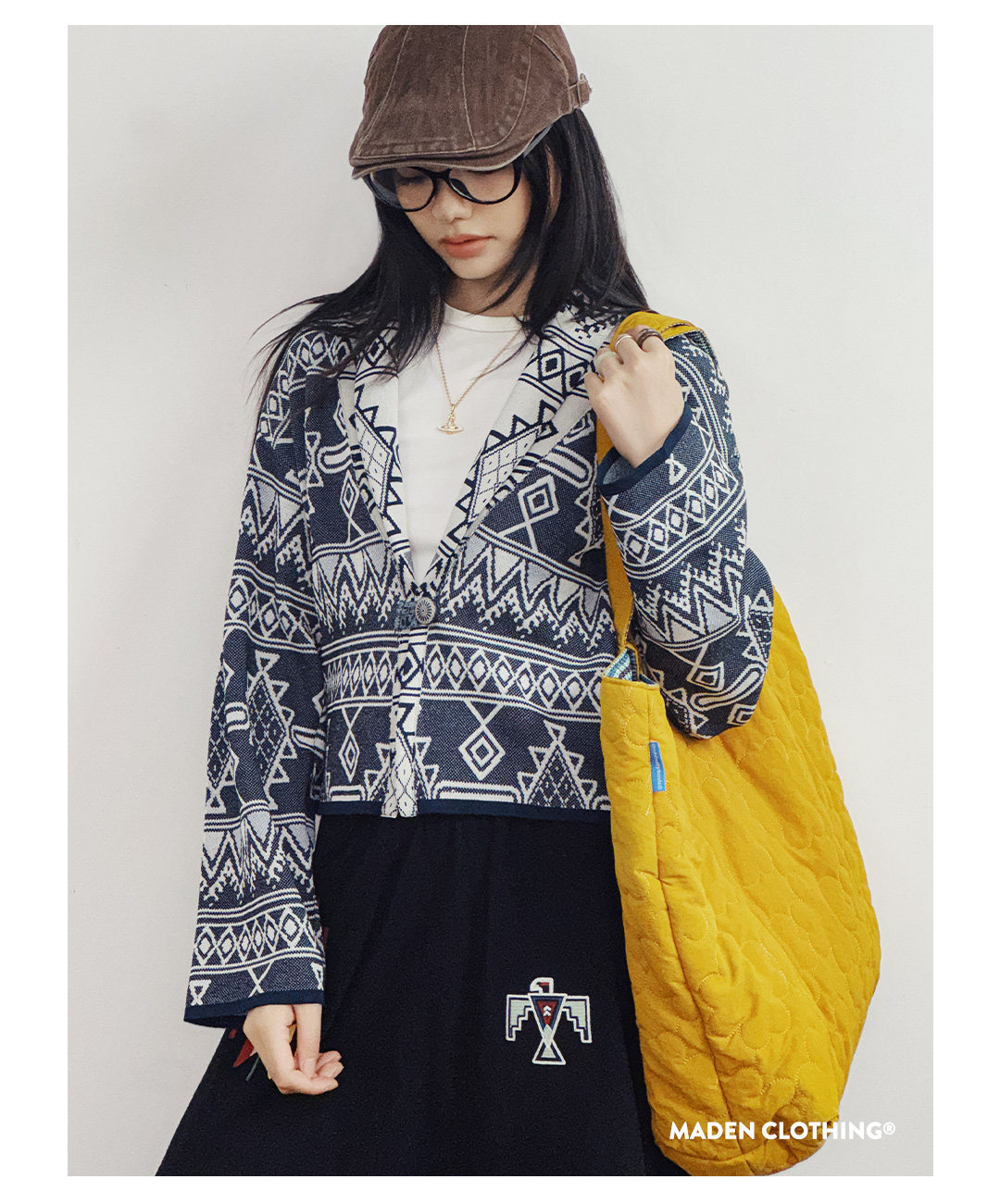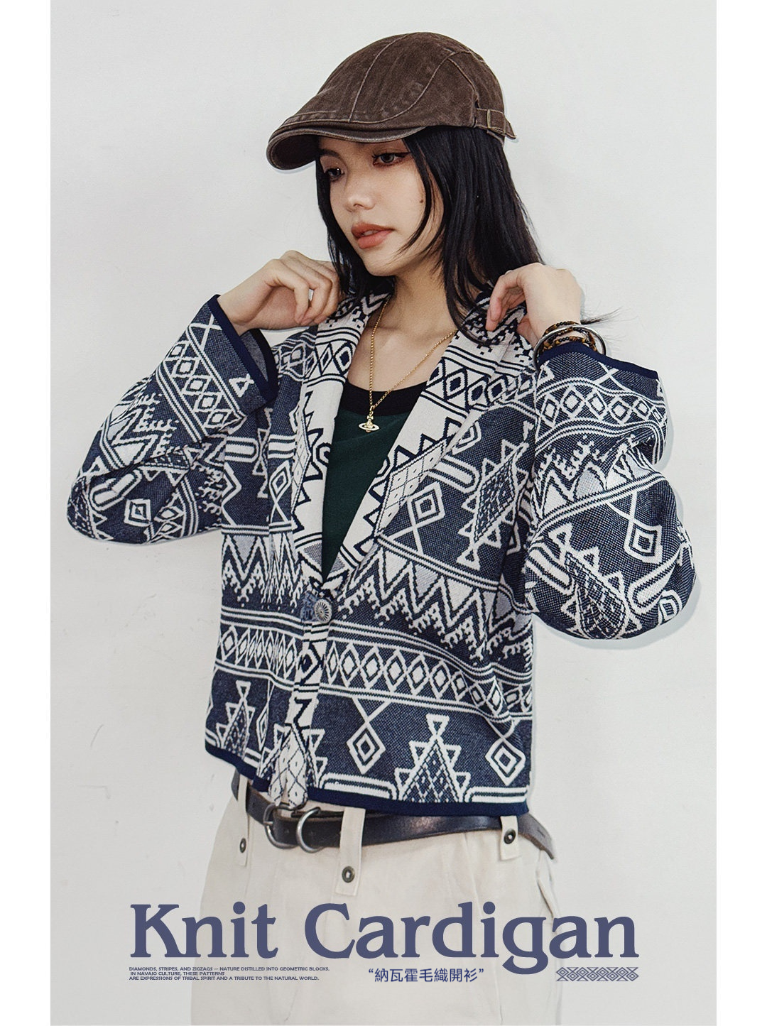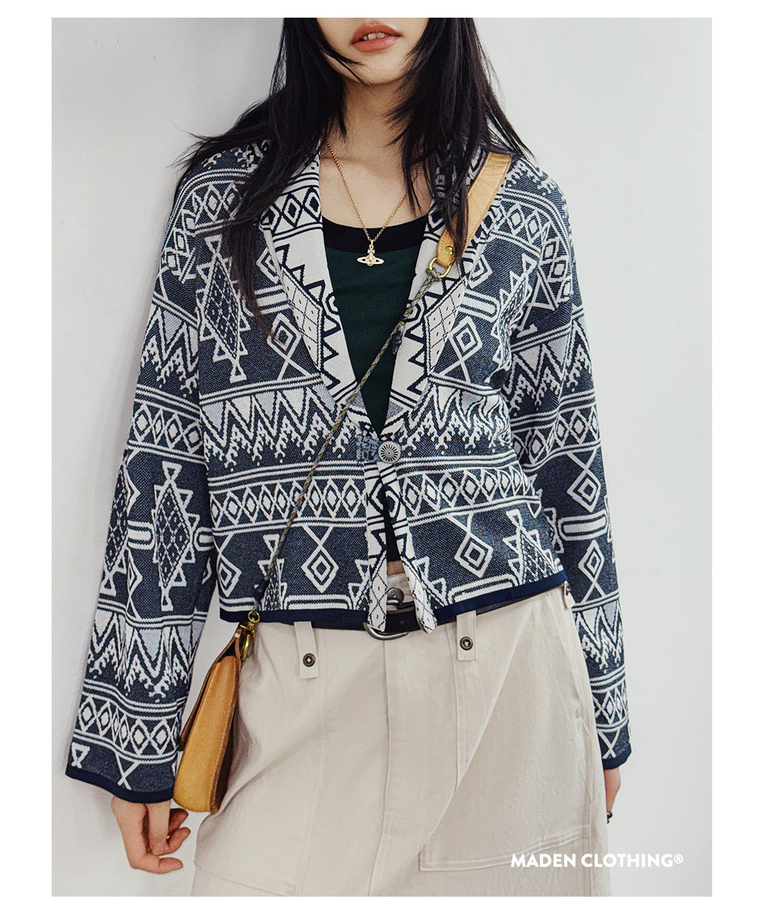 馬登女裝 復古納瓦霍西裝翻V領老錢風提花針織毛衣開衫薄短款外套春秋