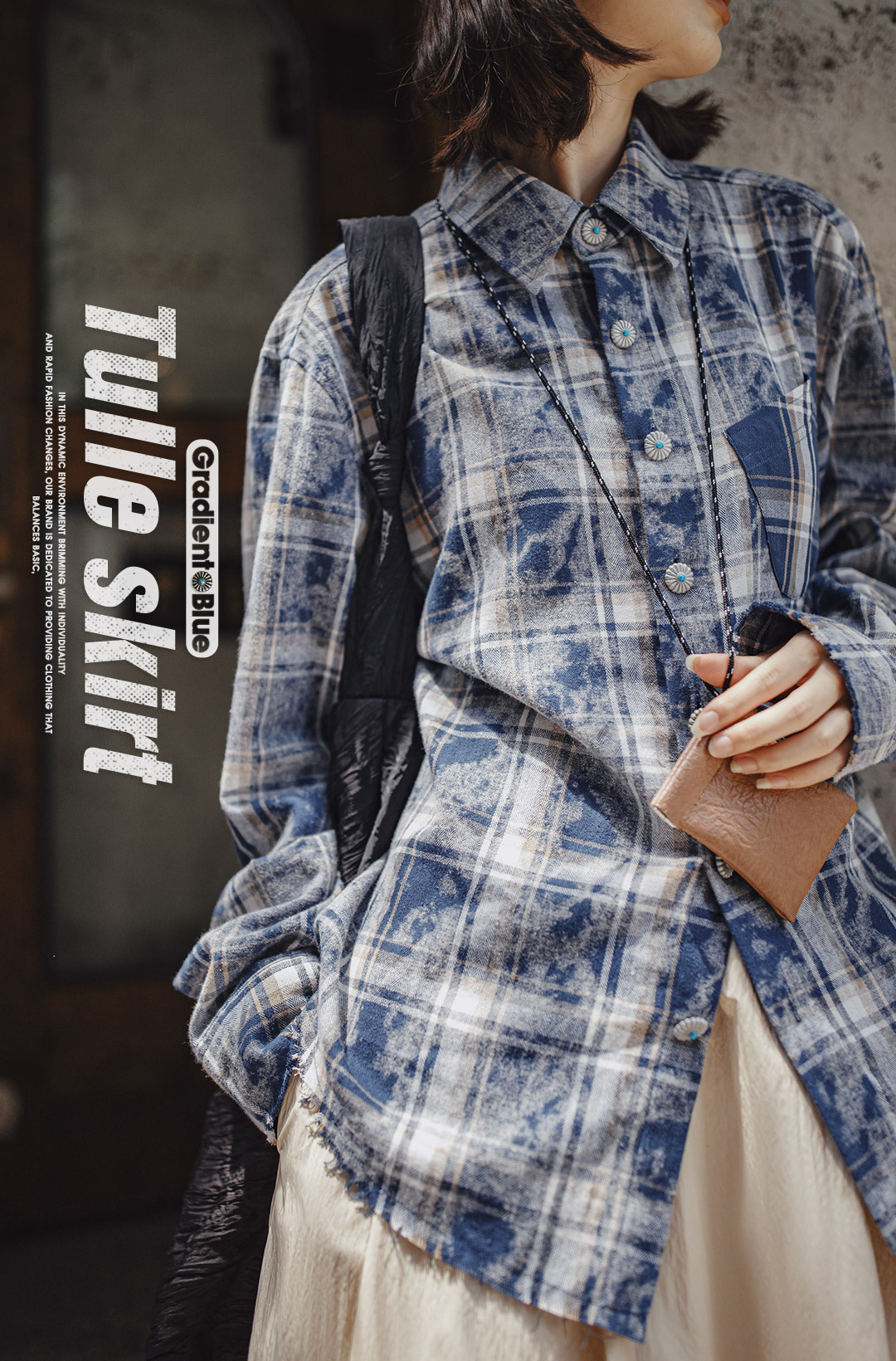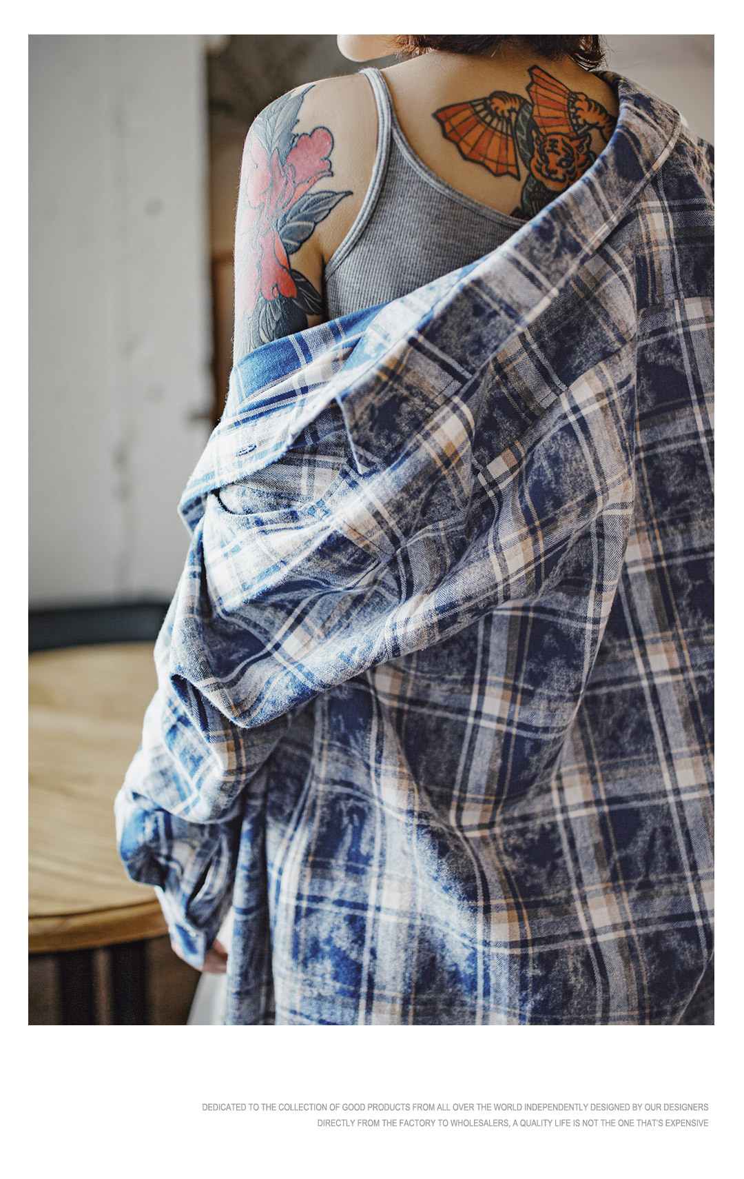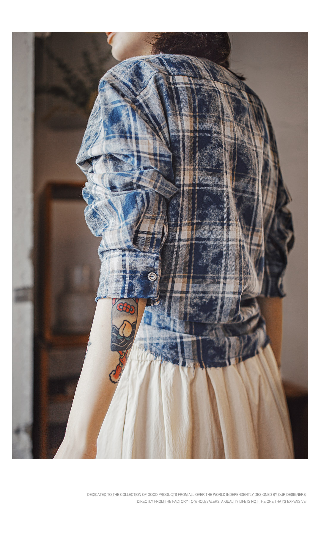 馬登女裝 美式復古藏青色格子紋翻領寬鬆磨毛長袖休閒襯衫上衣外套秋季
