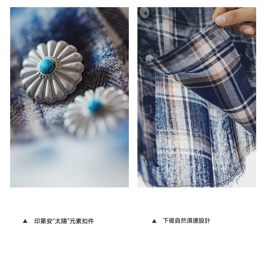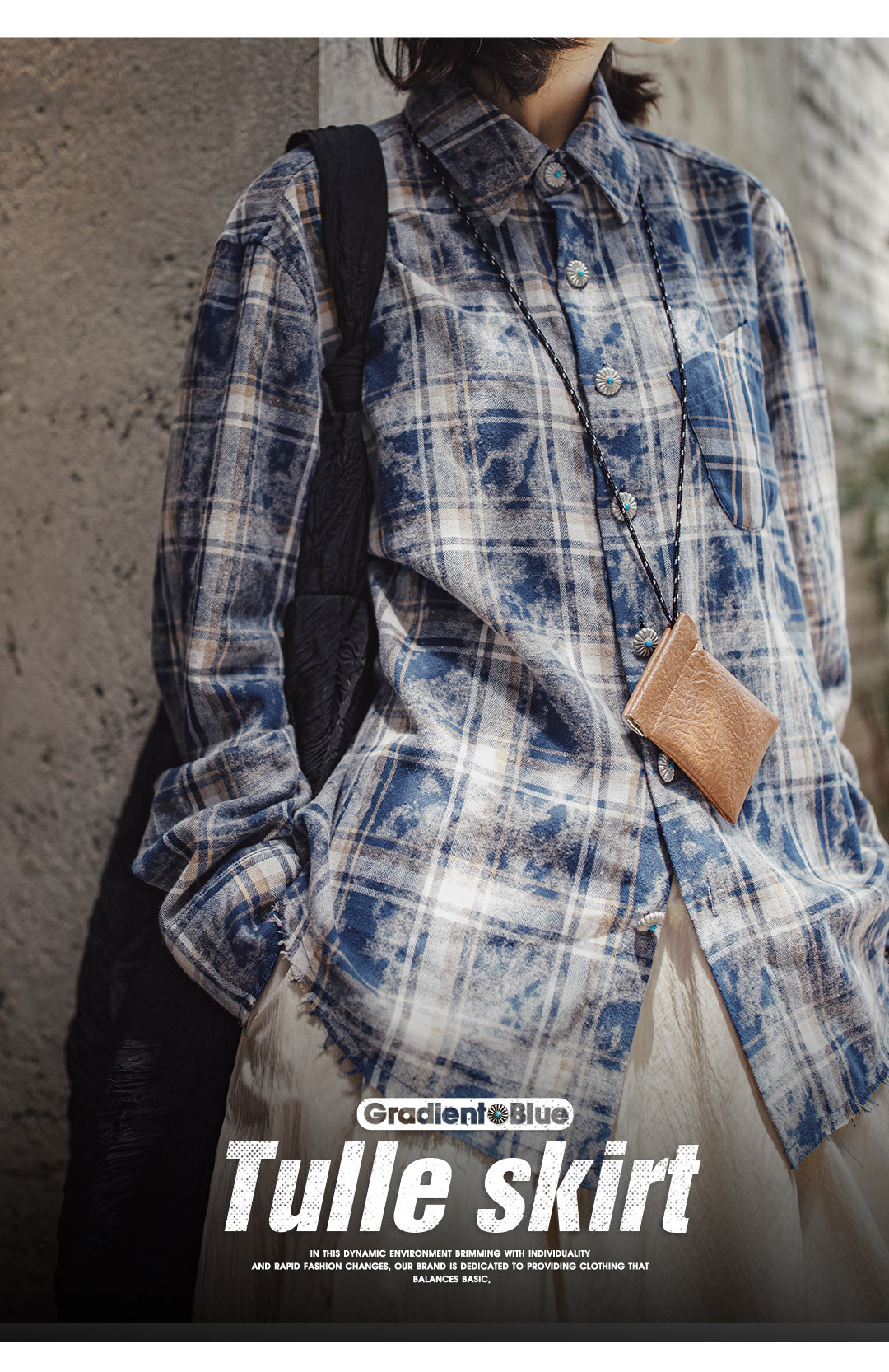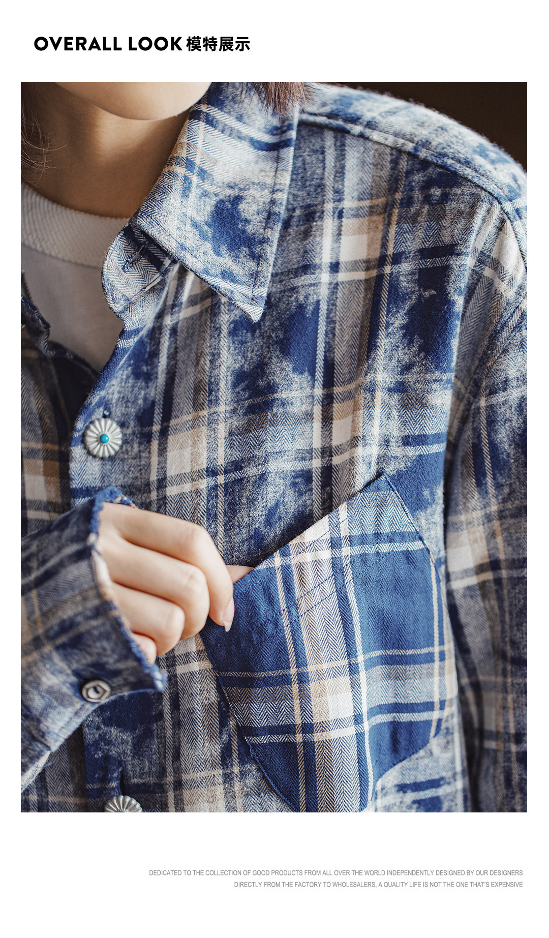 馬登女裝 美式復古藏青色格子紋翻領寬鬆磨毛長袖休閒襯衫上衣外套秋季