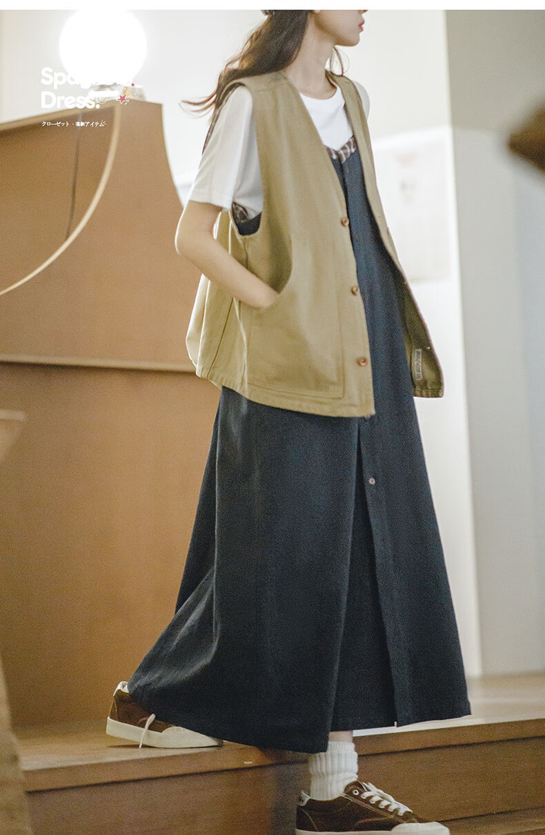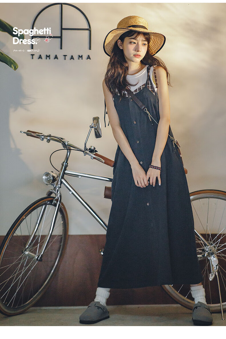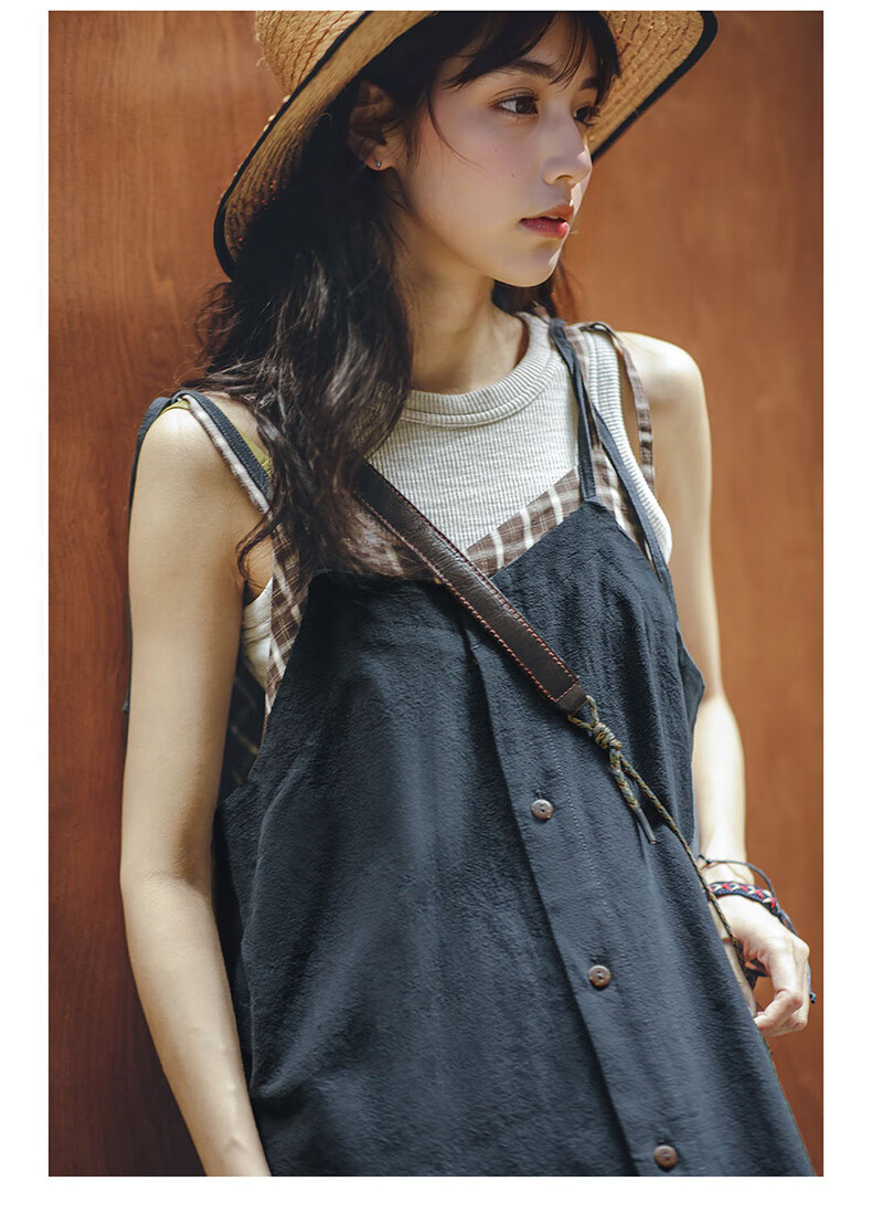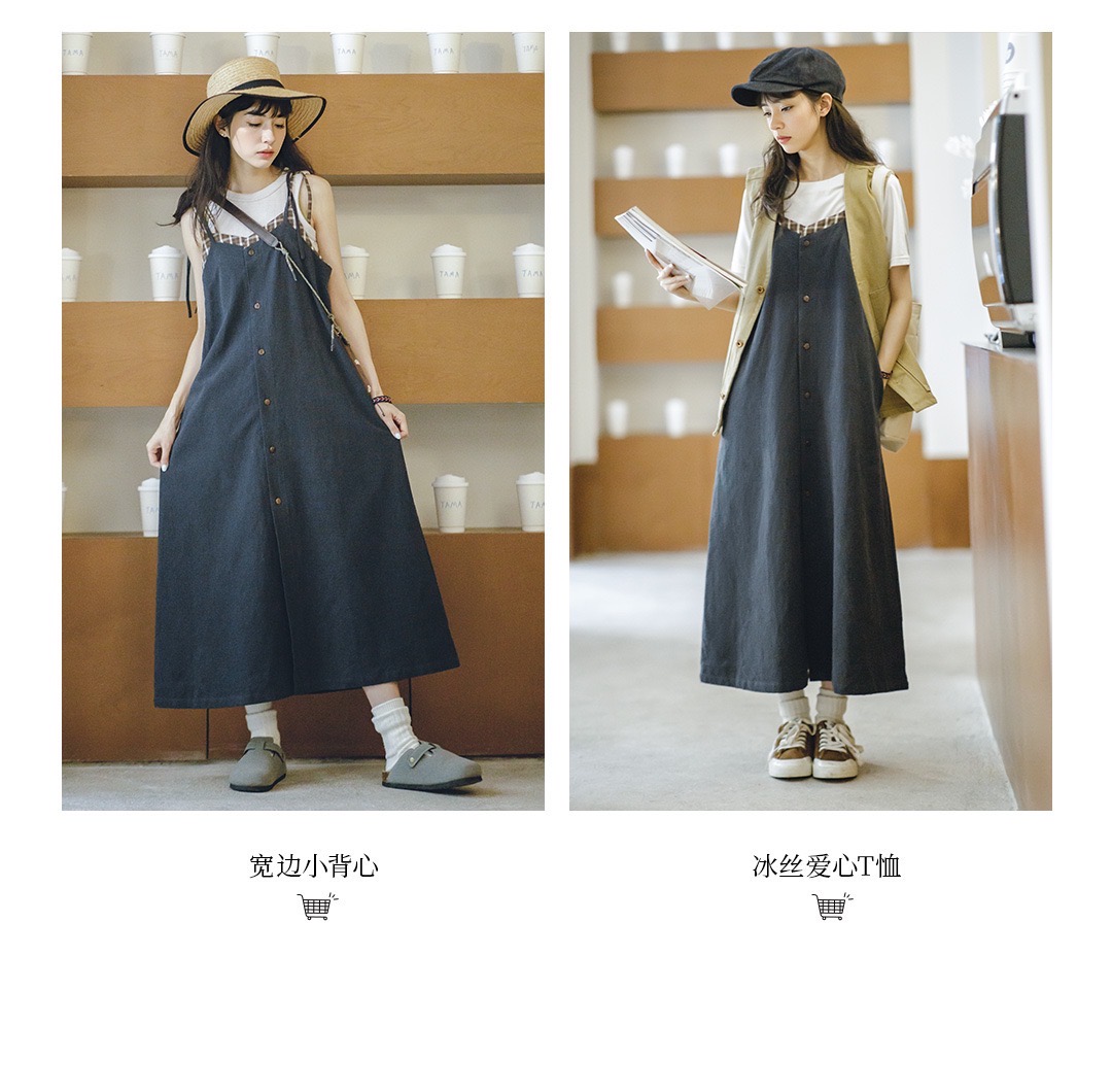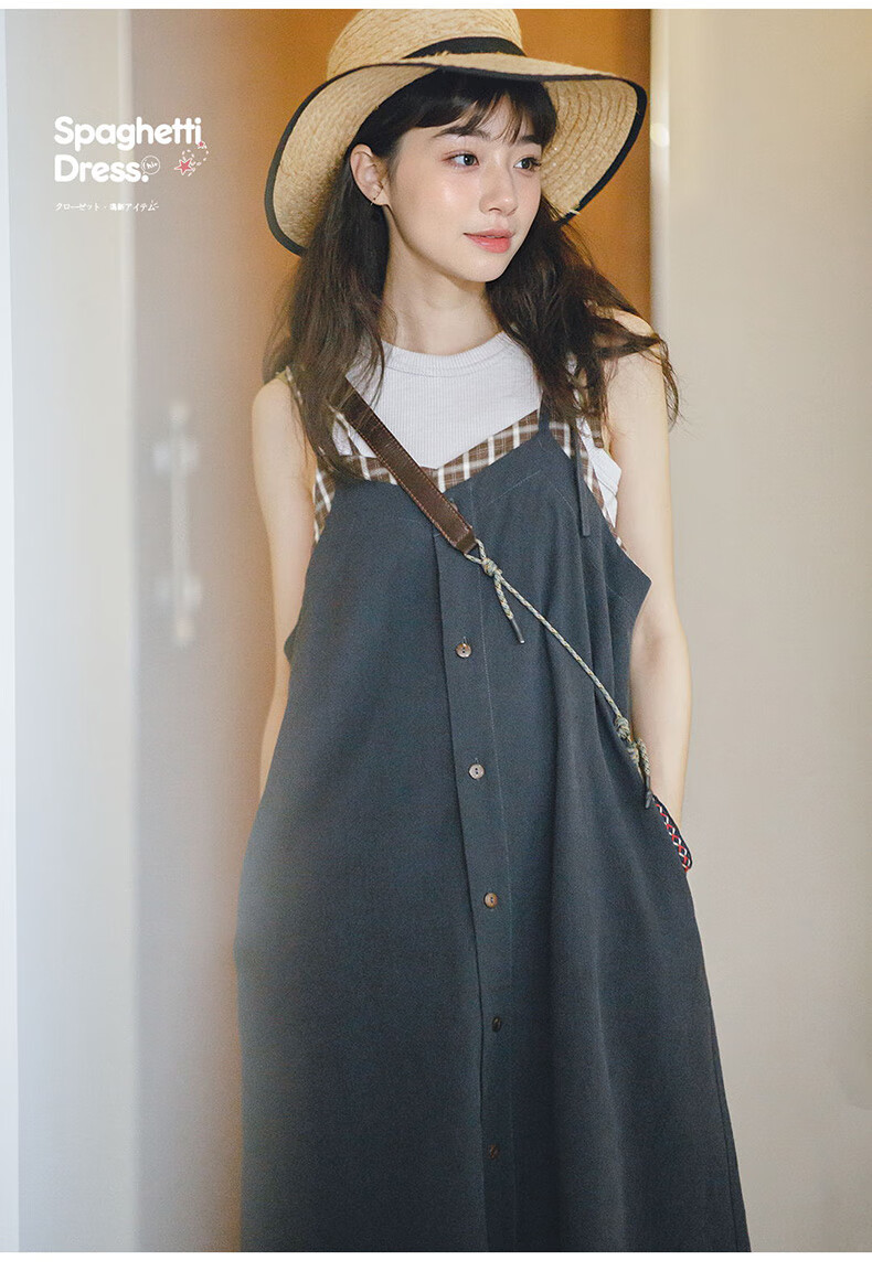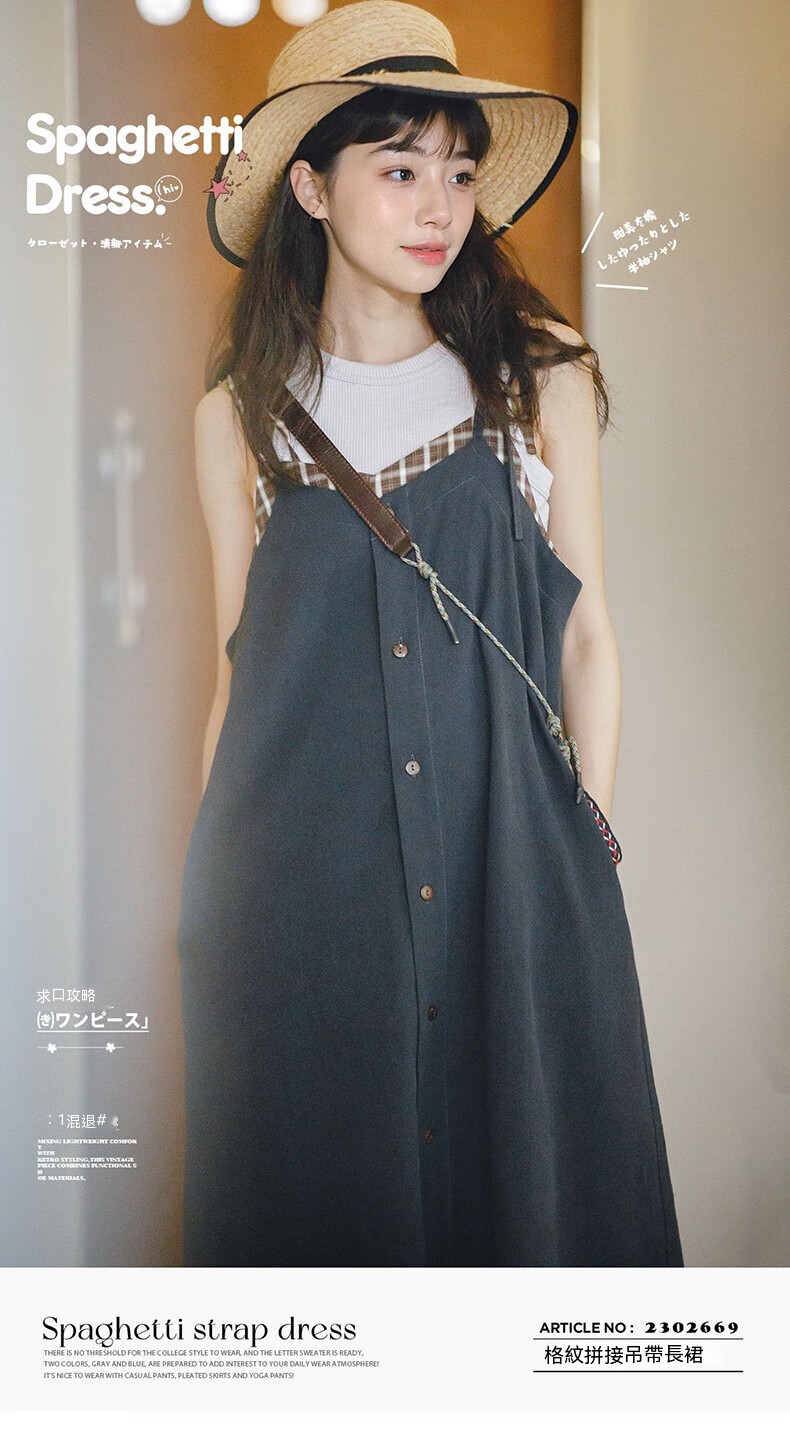 馬登女裝 復古格紋拼接背帶裙寬鬆顯瘦吊帶A字連衣長裙