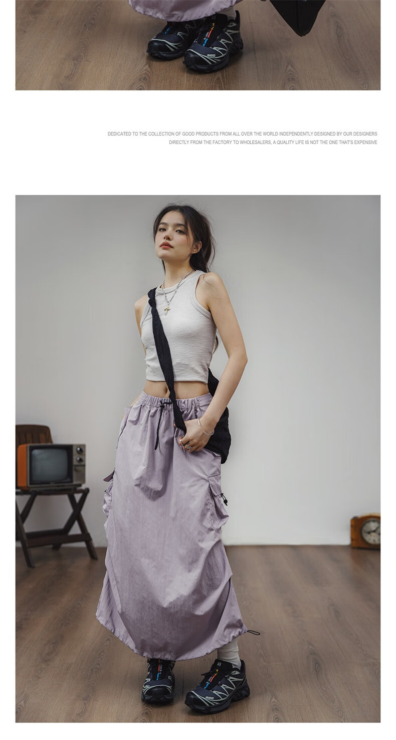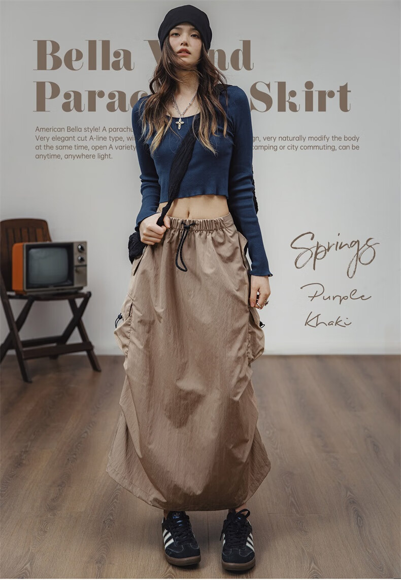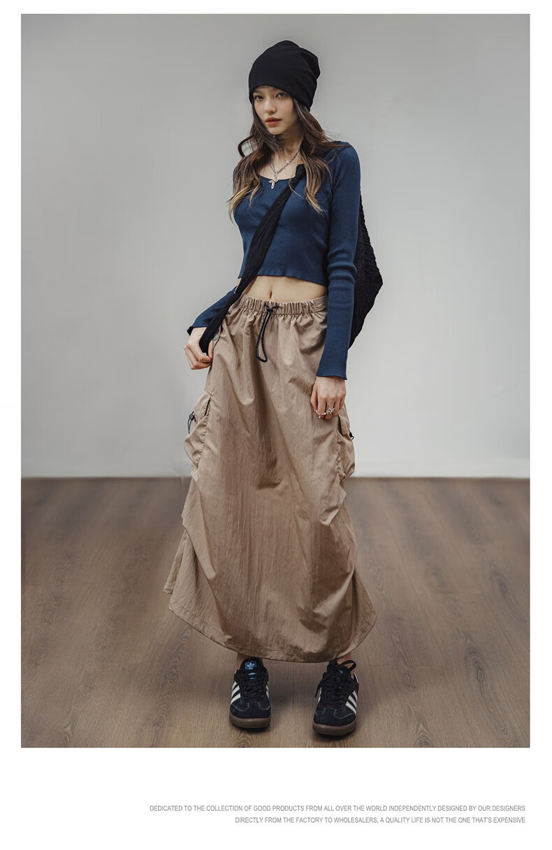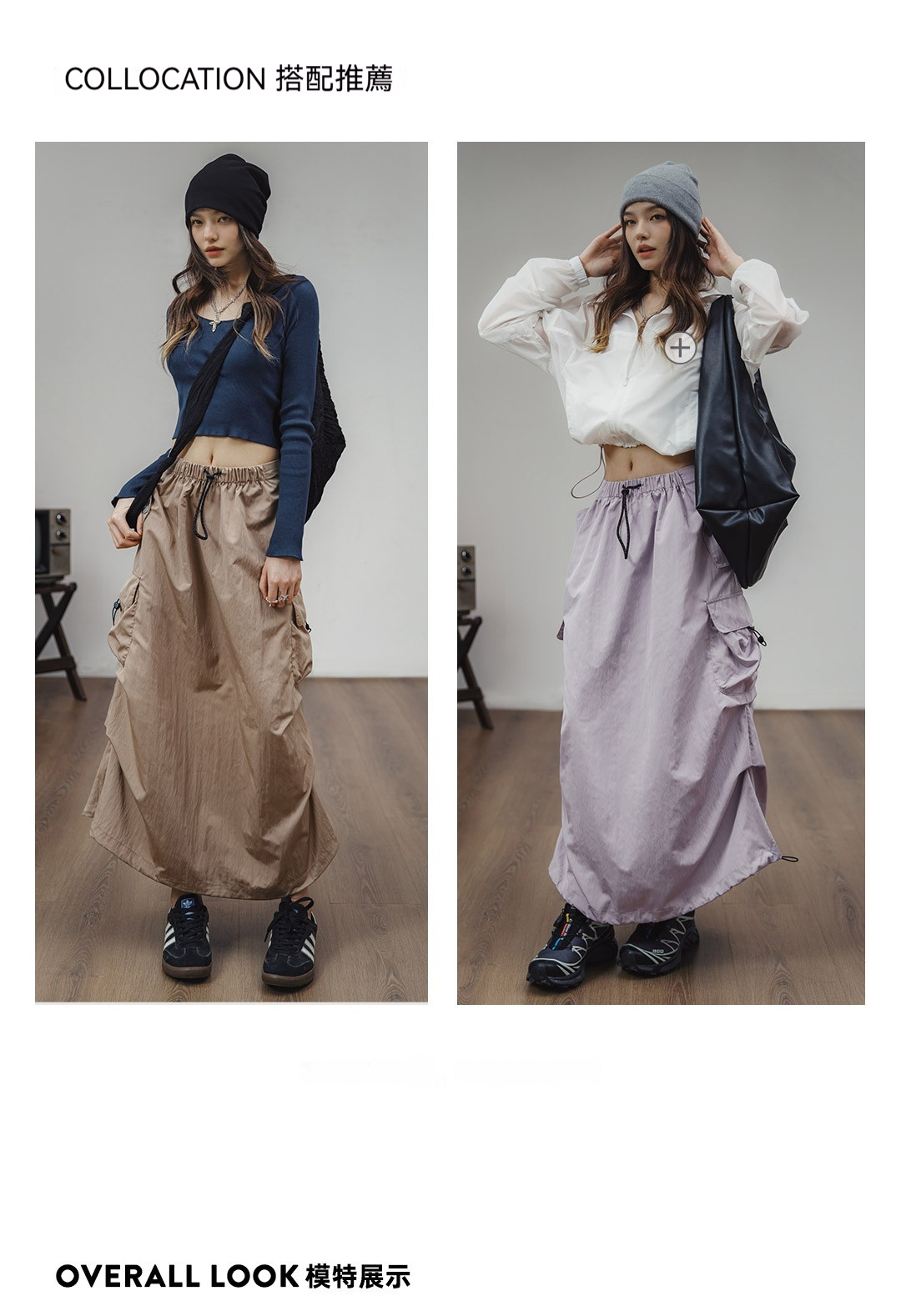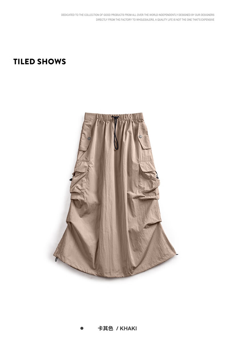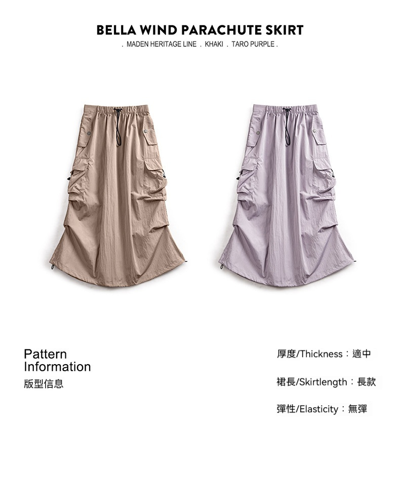 馬登女裝 復古工裝A字裙多口袋綁帶抽褶裙子顯瘦中腰半身長裙