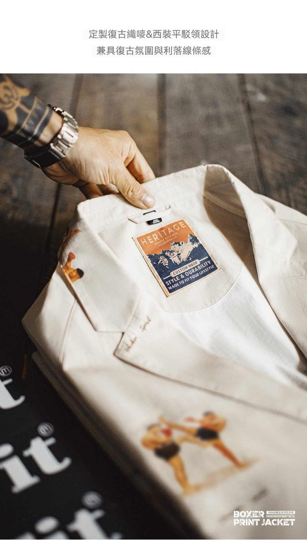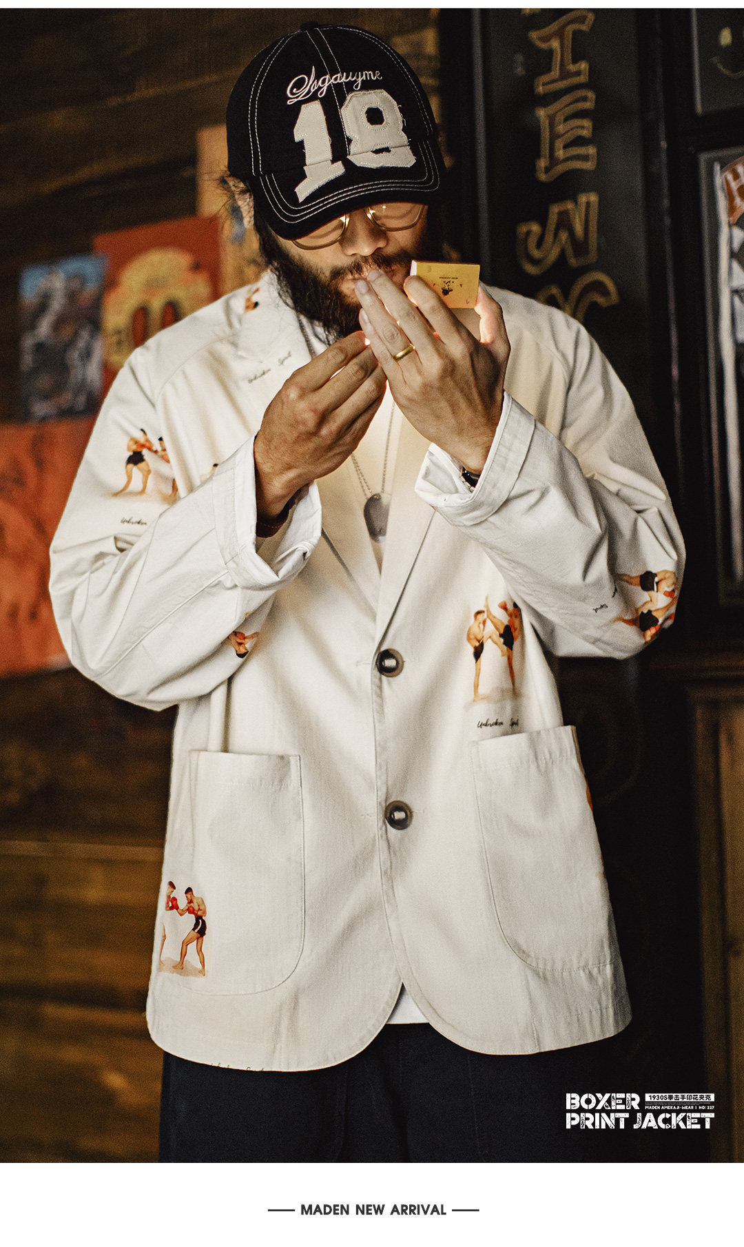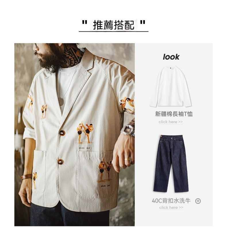 馬登工裝 美式休閒平駁領西裝印花外套白色西服純棉長袖襯衫外套男春