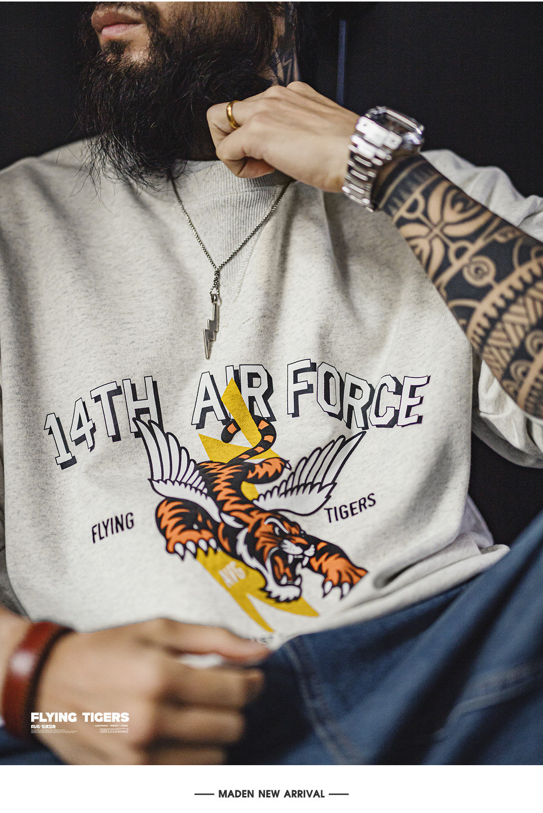 馬登工裝 美式印花灰色圓領衛衣橫須賀寬松落肩套頭長袖上衣男款春