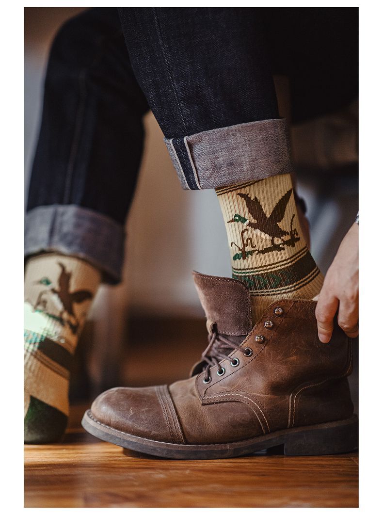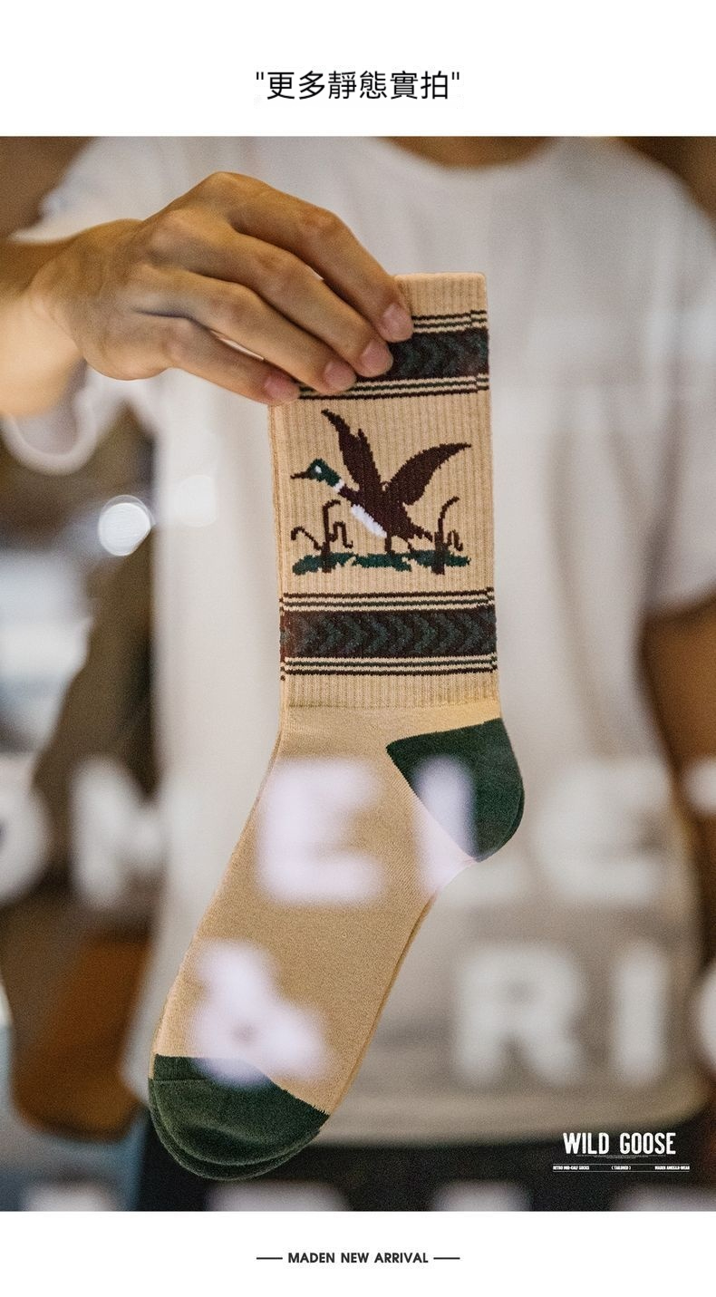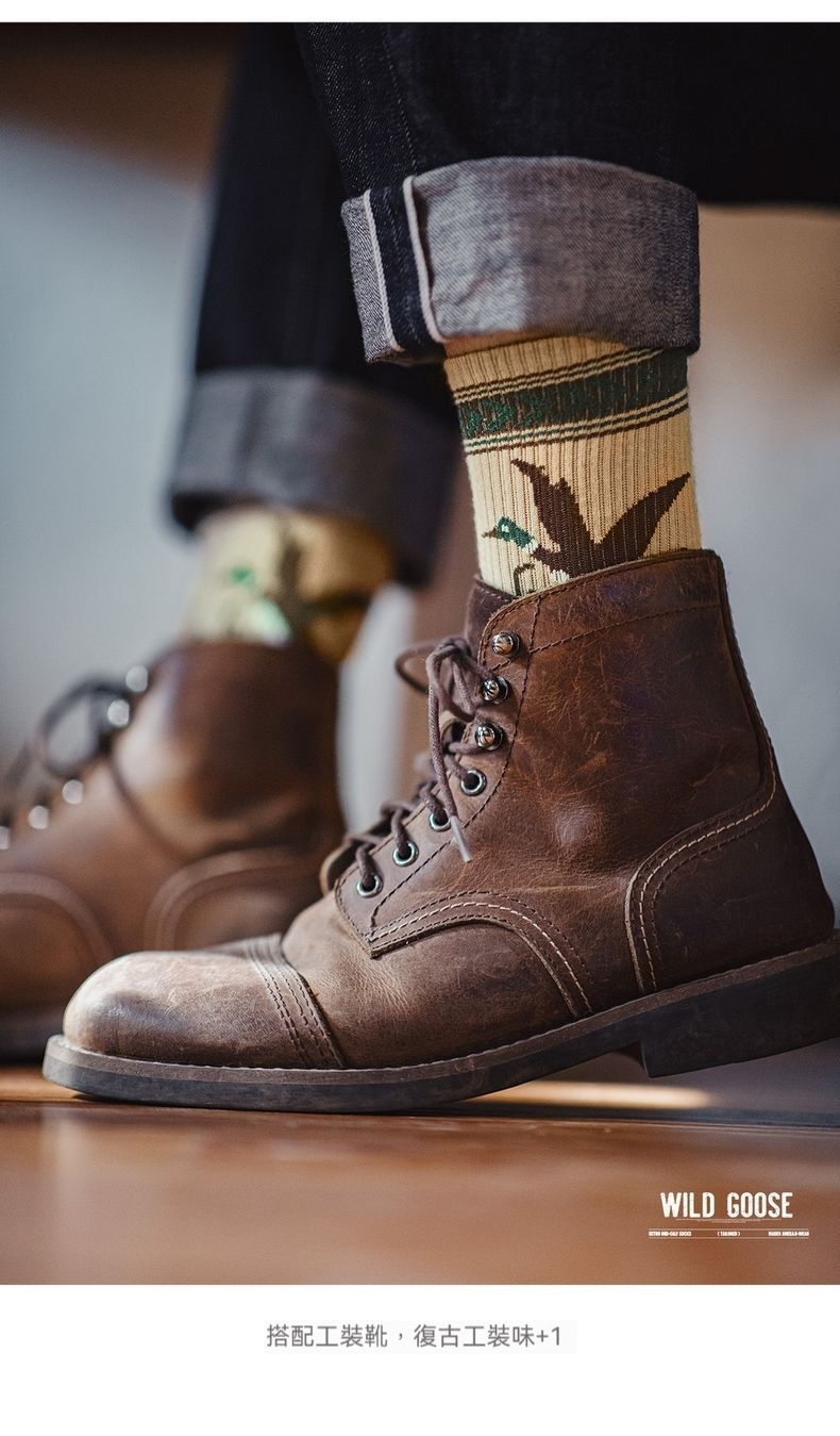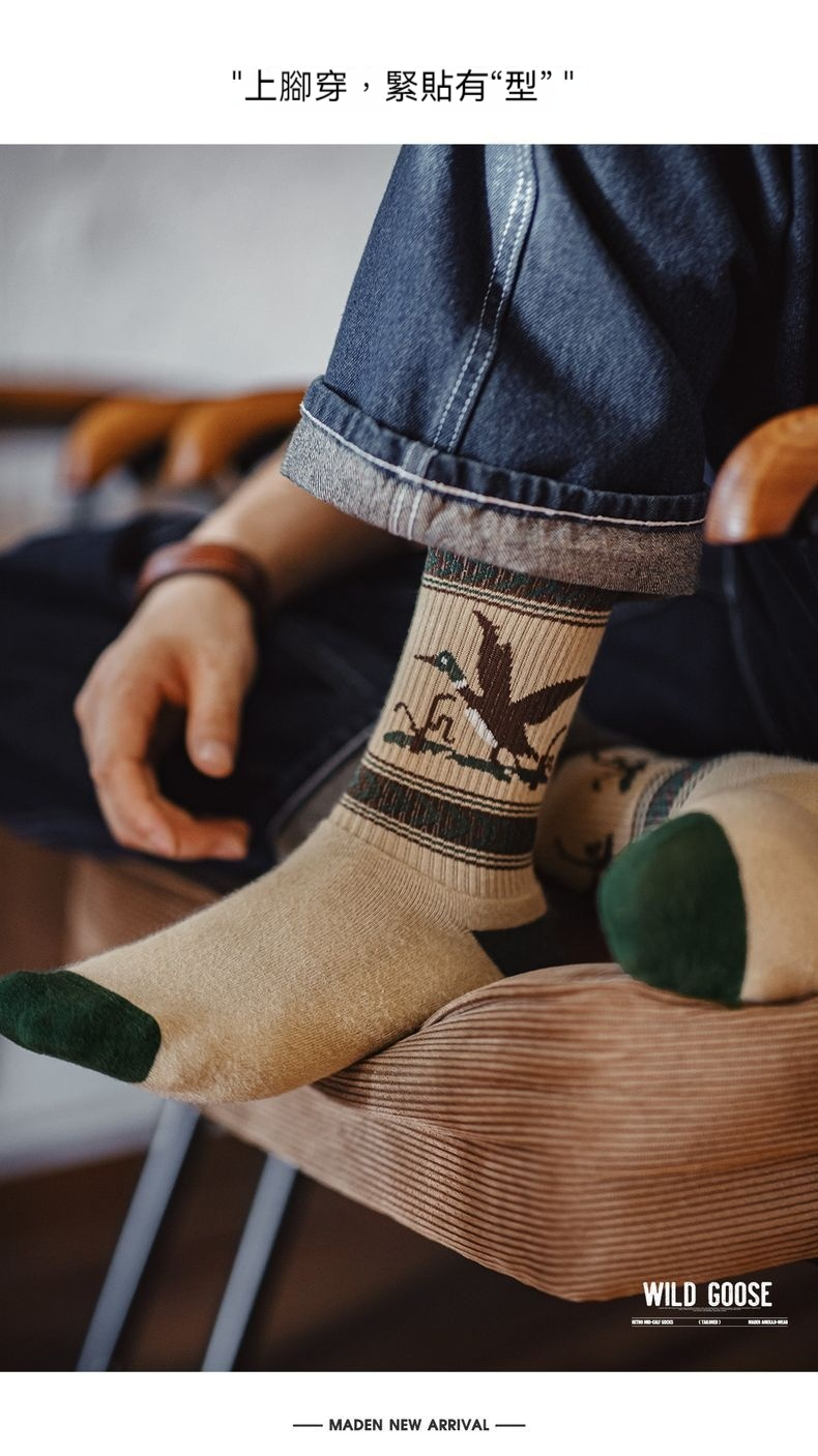 馬登工裝 復古卡通撞色針織中筒襪彈力毛圈棉襪透氣耐磨長襪子秋冬