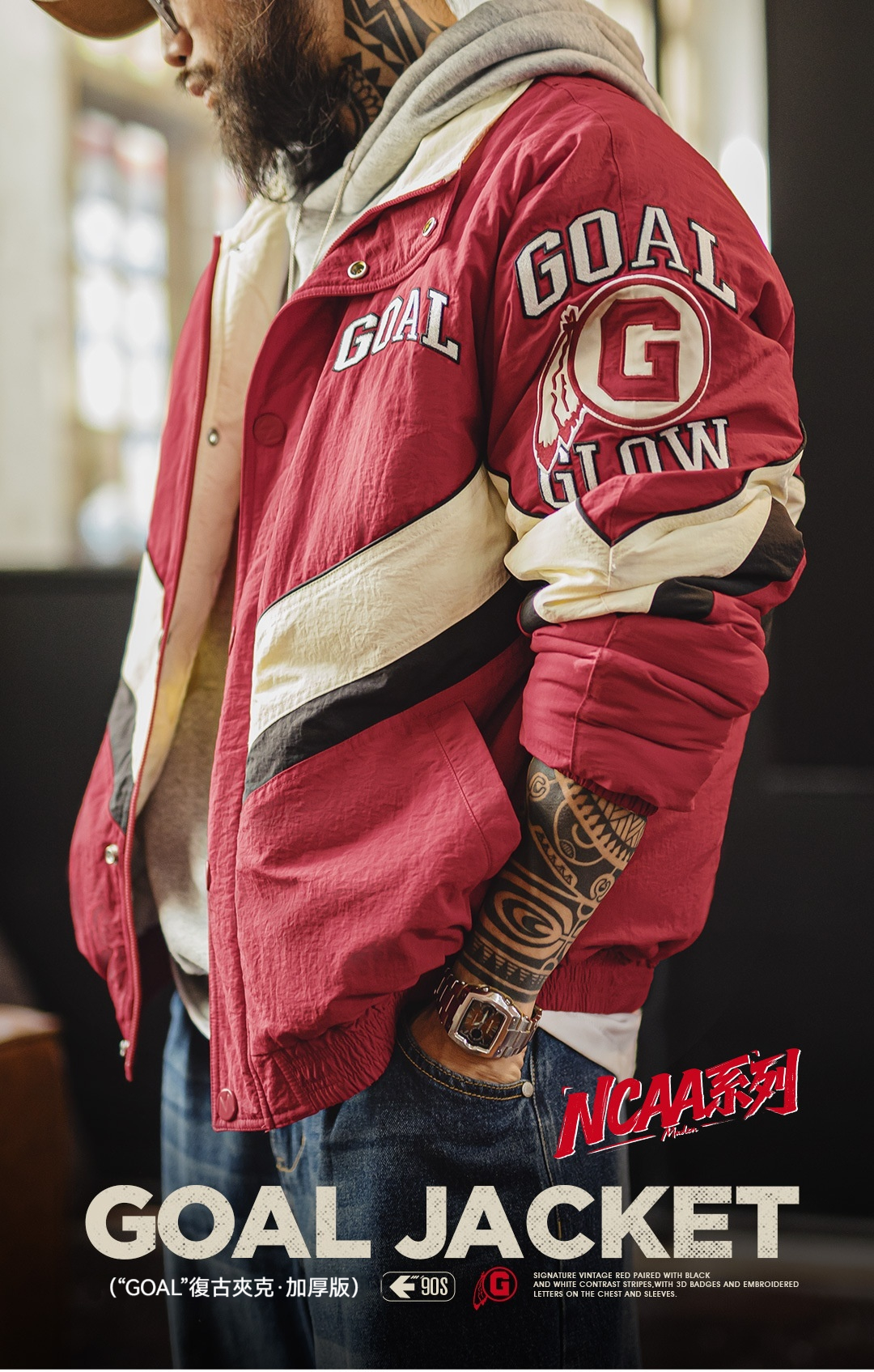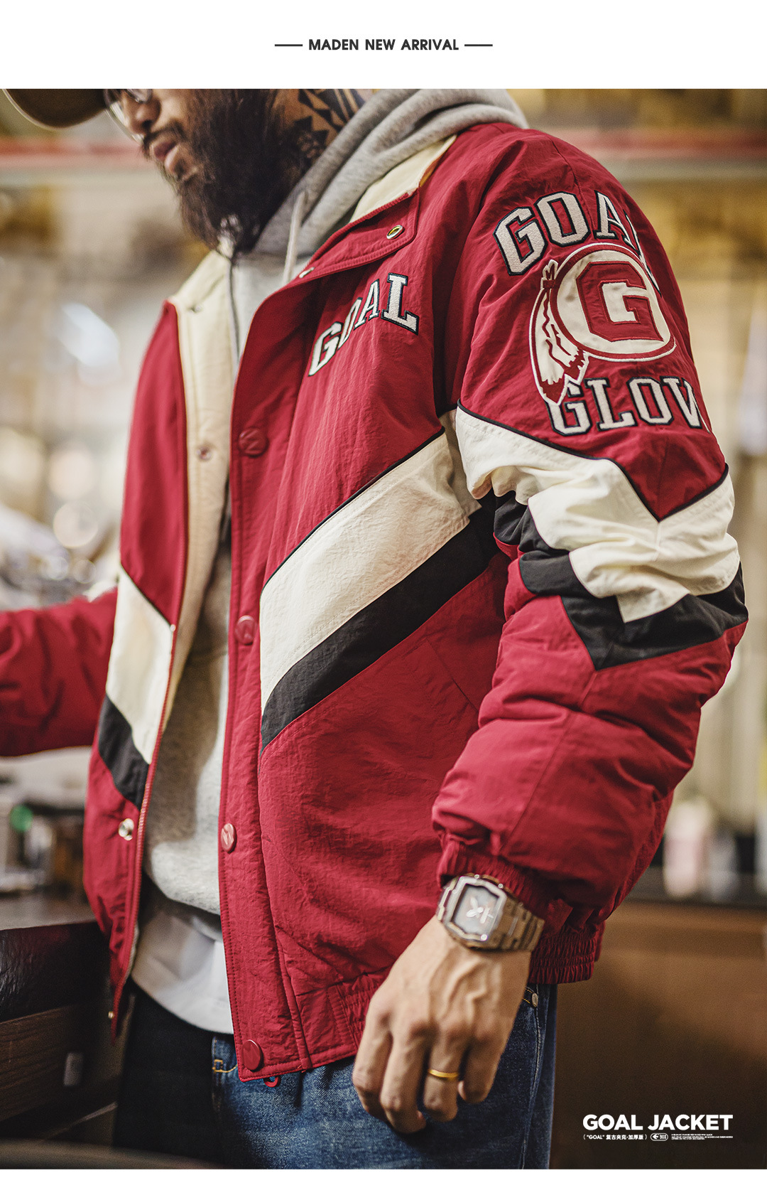 馬登工裝 美式復古拼接撞色賽車夾克紅色翻領加厚保暖棉服外套男冬