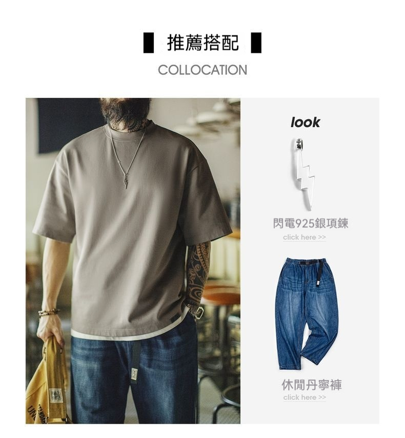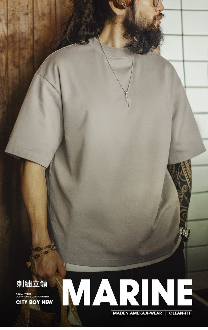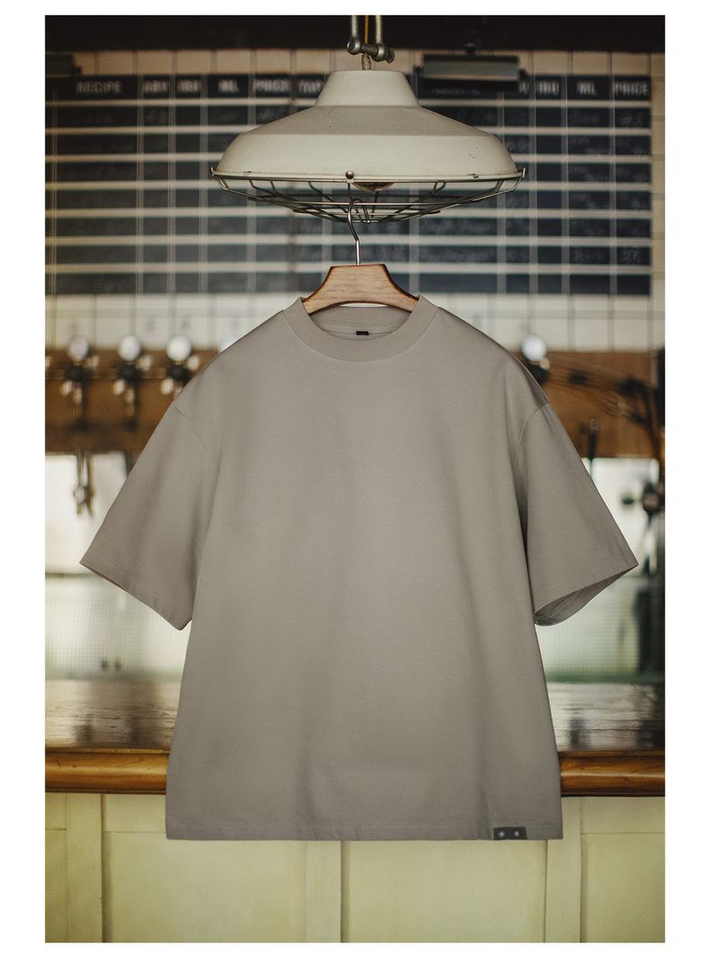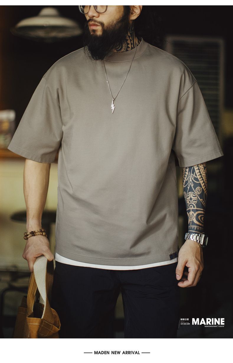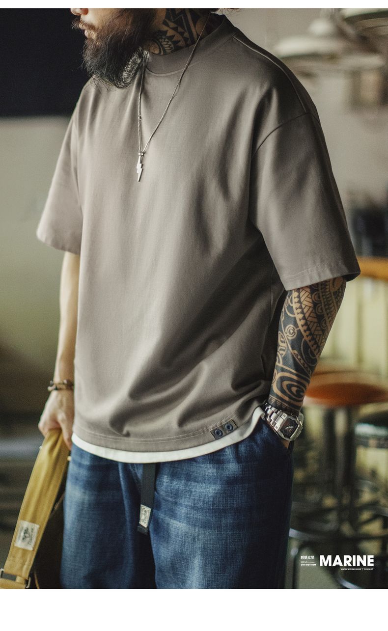 馬登工裝 美式半高小領口落肩短袖老錢風重磅寬鬆半袖T恤男春夏