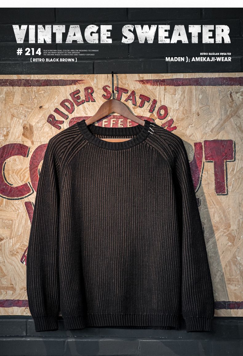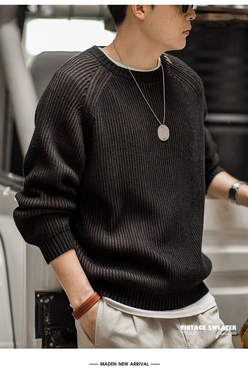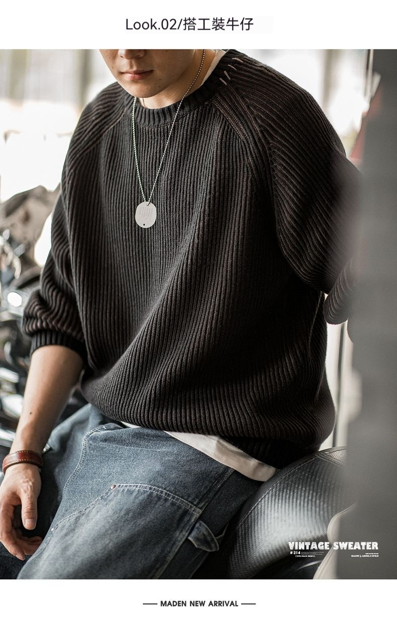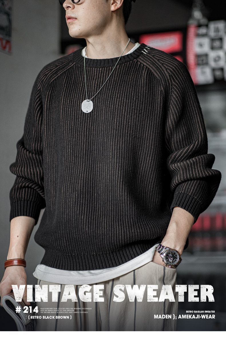 馬登工裝 美式復古豎條紋編織毛衣圓領加厚打底針織衫男秋冬
