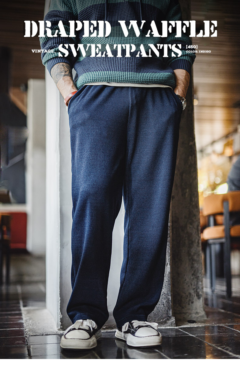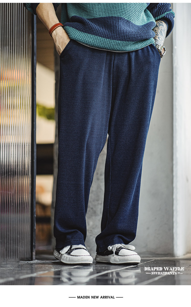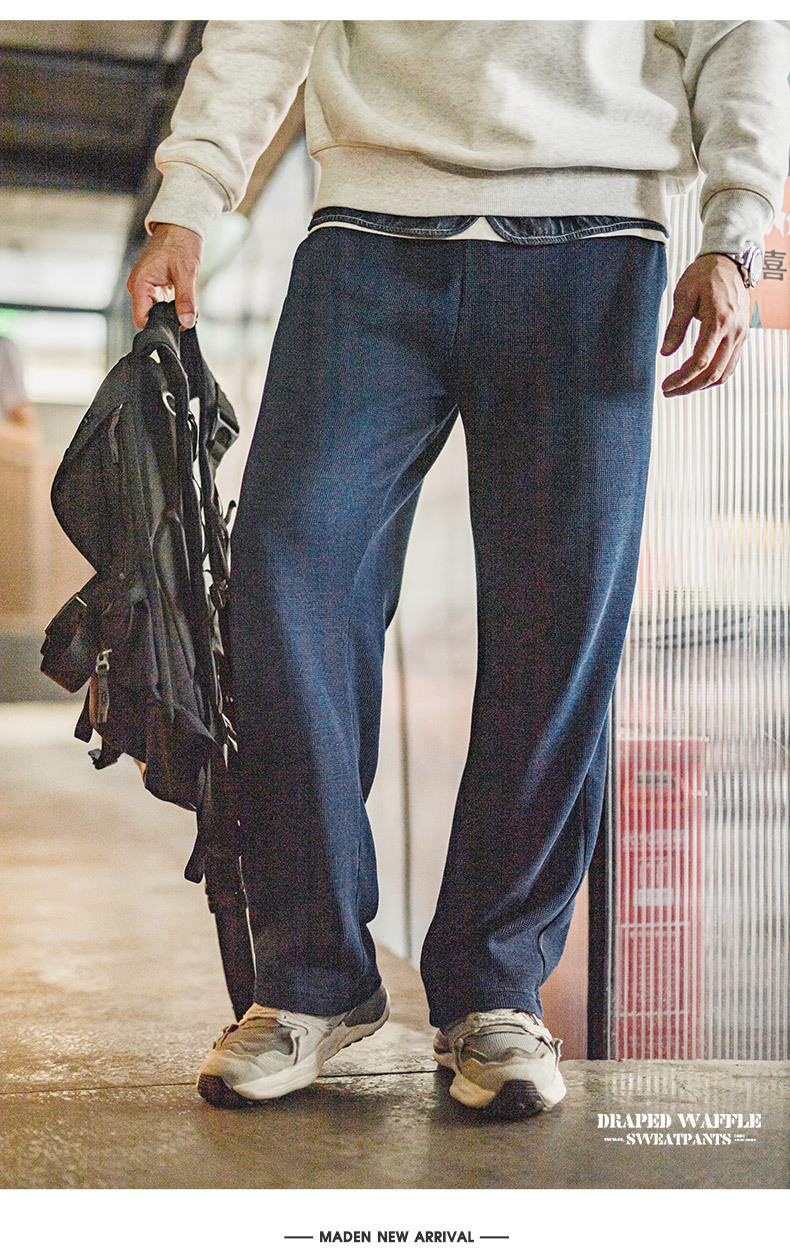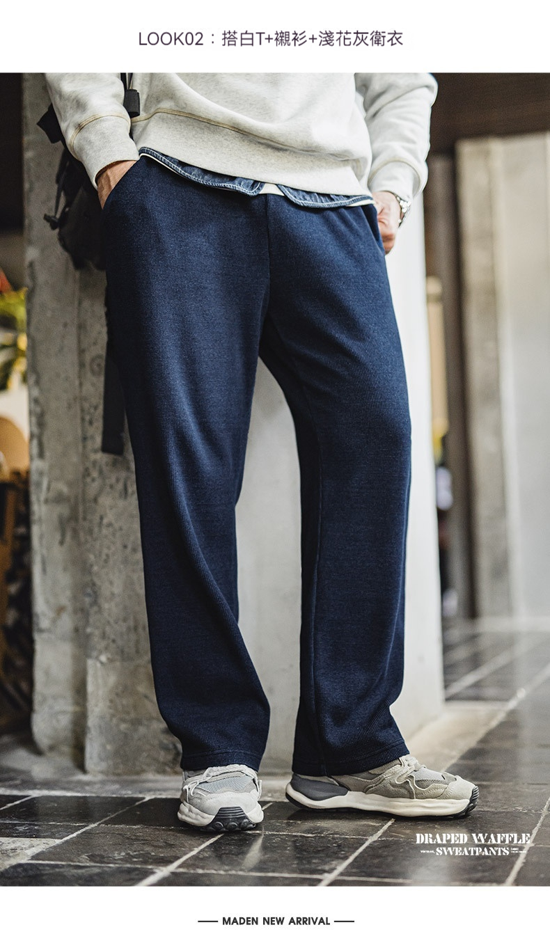 馬登工裝 美式復古針織垂感華夫格衛褲肌理感寬鬆直筒休閒褲子男秋