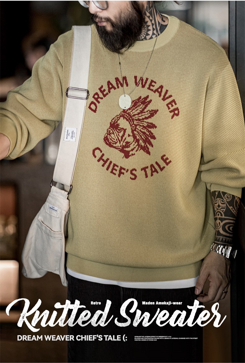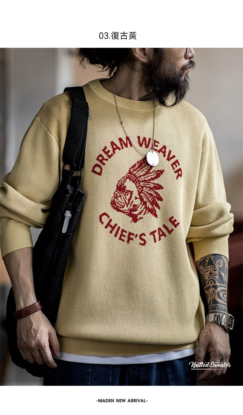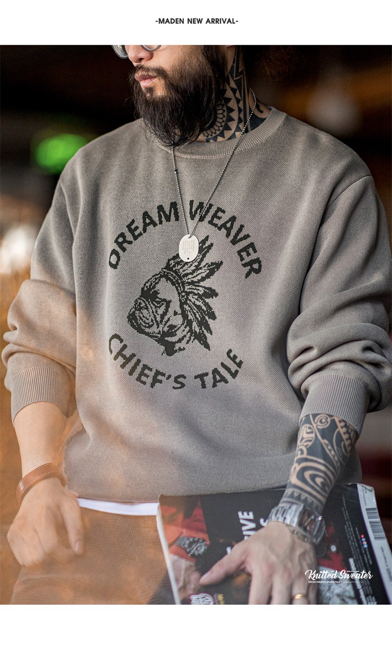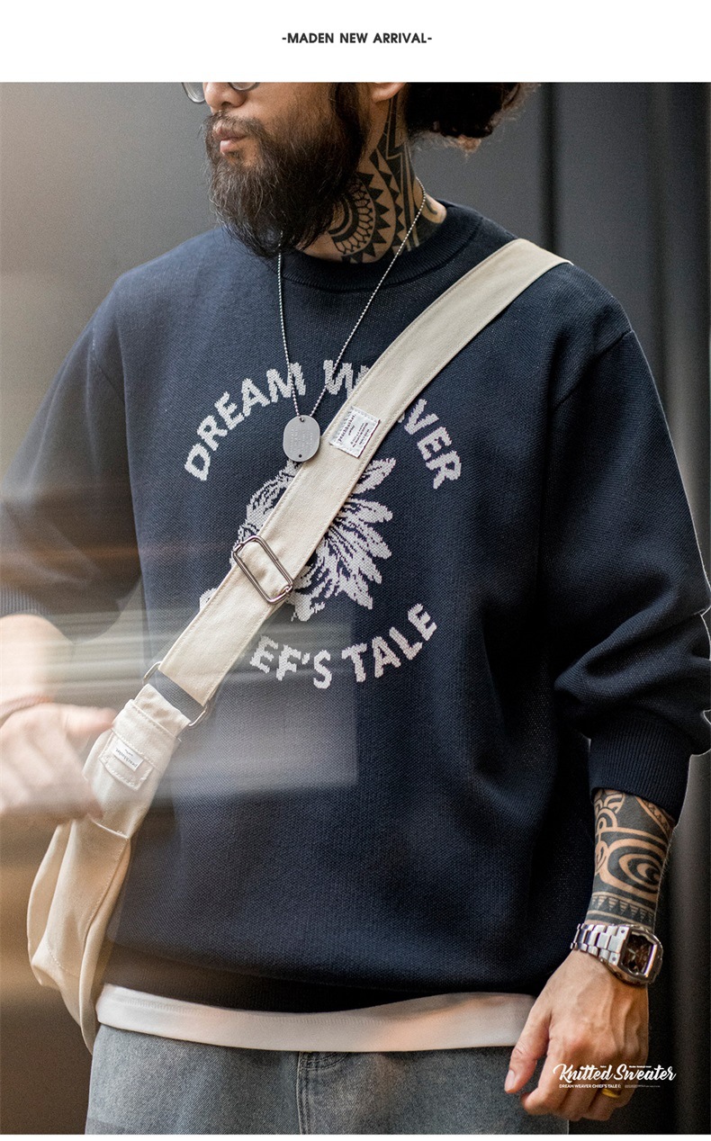 馬登工裝 美式復古仿亞麻字母撞色毛衣阿美哢嘰套頭圓領針織衫男秋冬