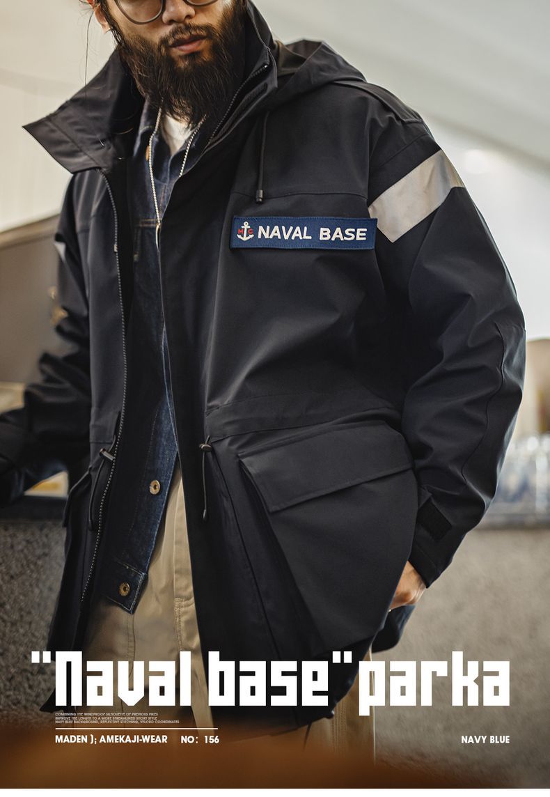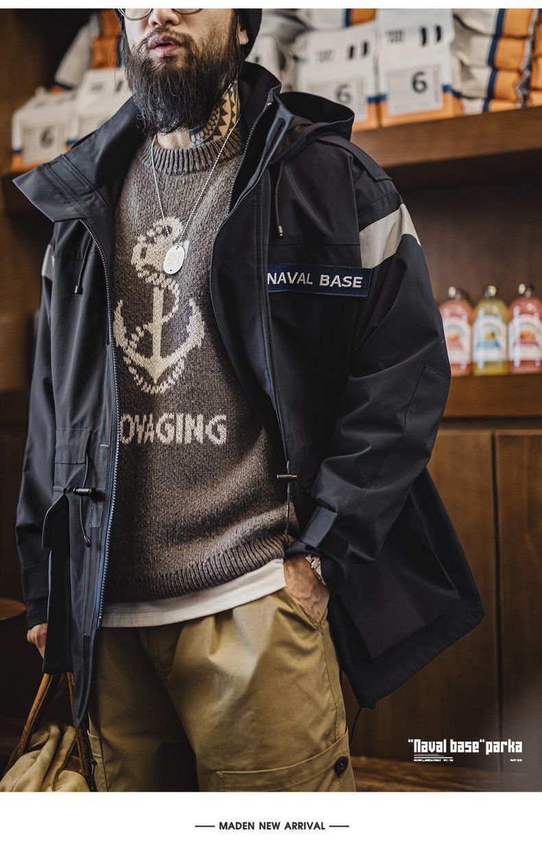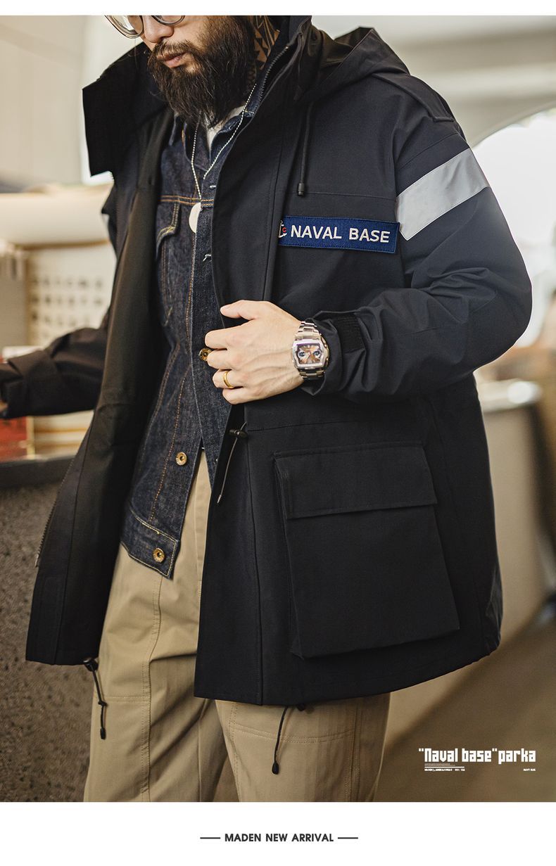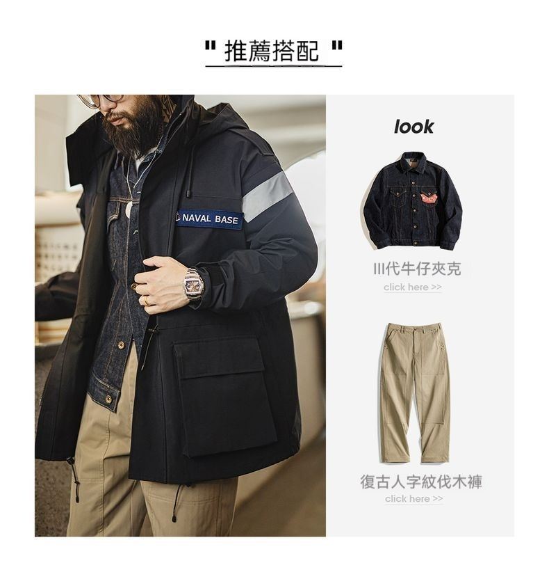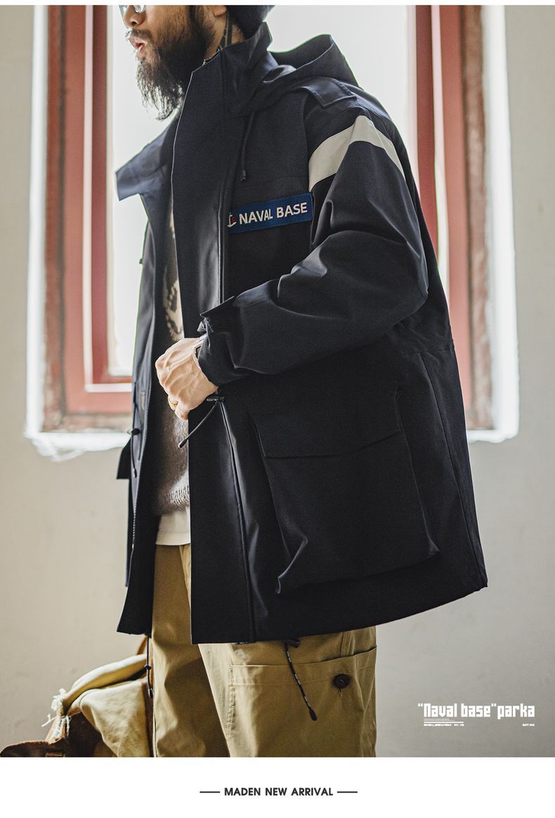 馬登工裝 美式復古中長款海軍派克風衣寬鬆防風連帽夾克外套男秋冬