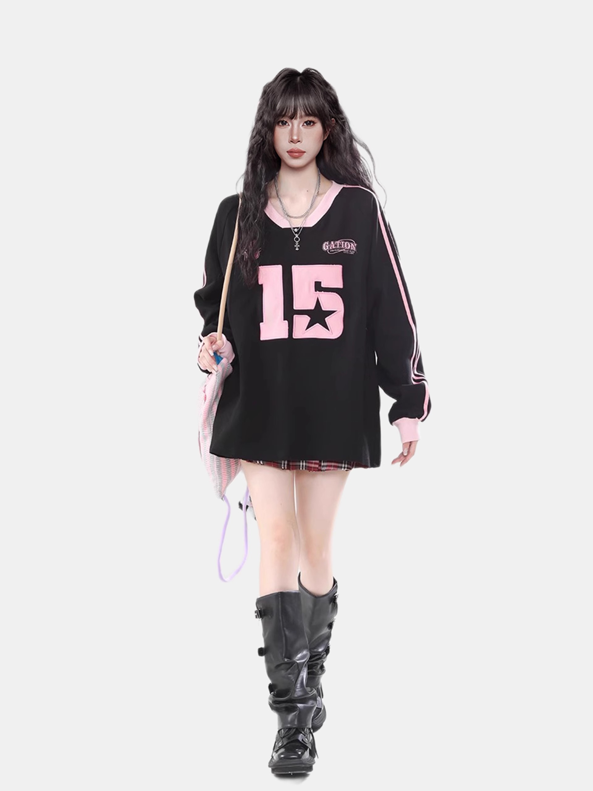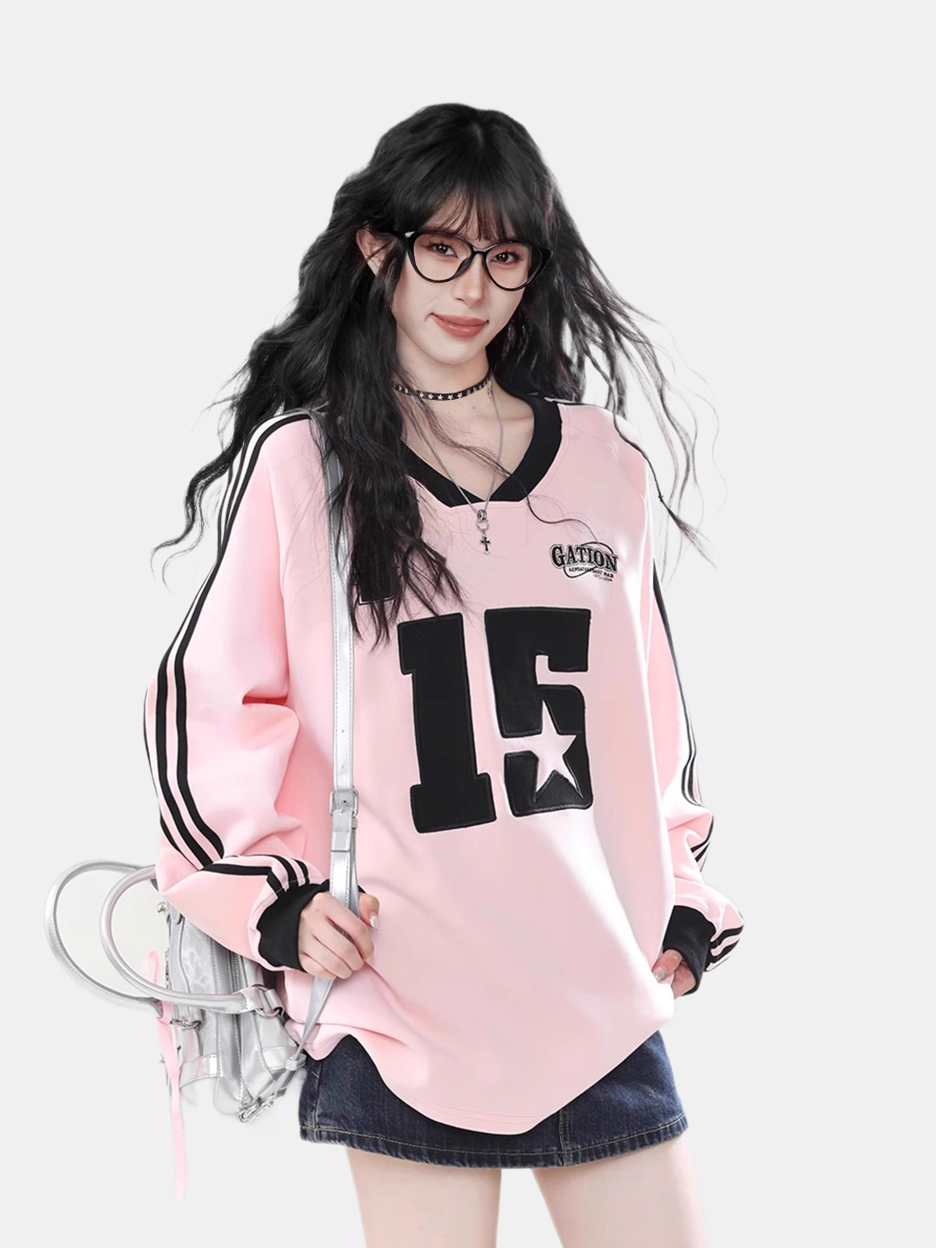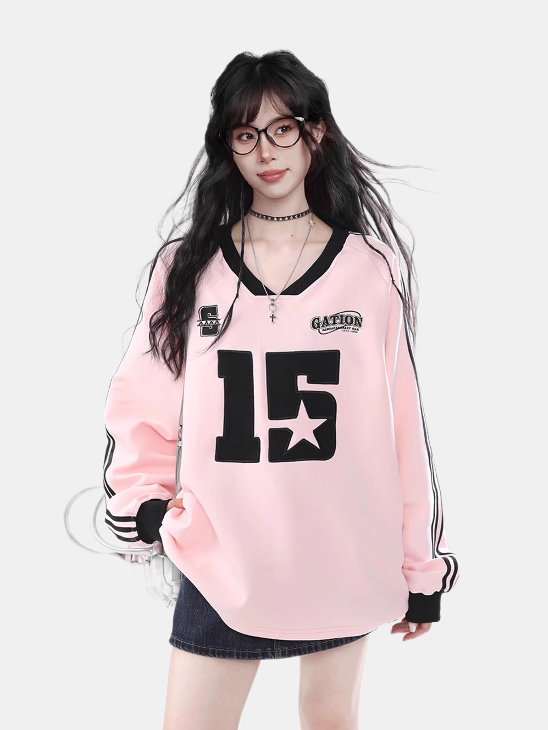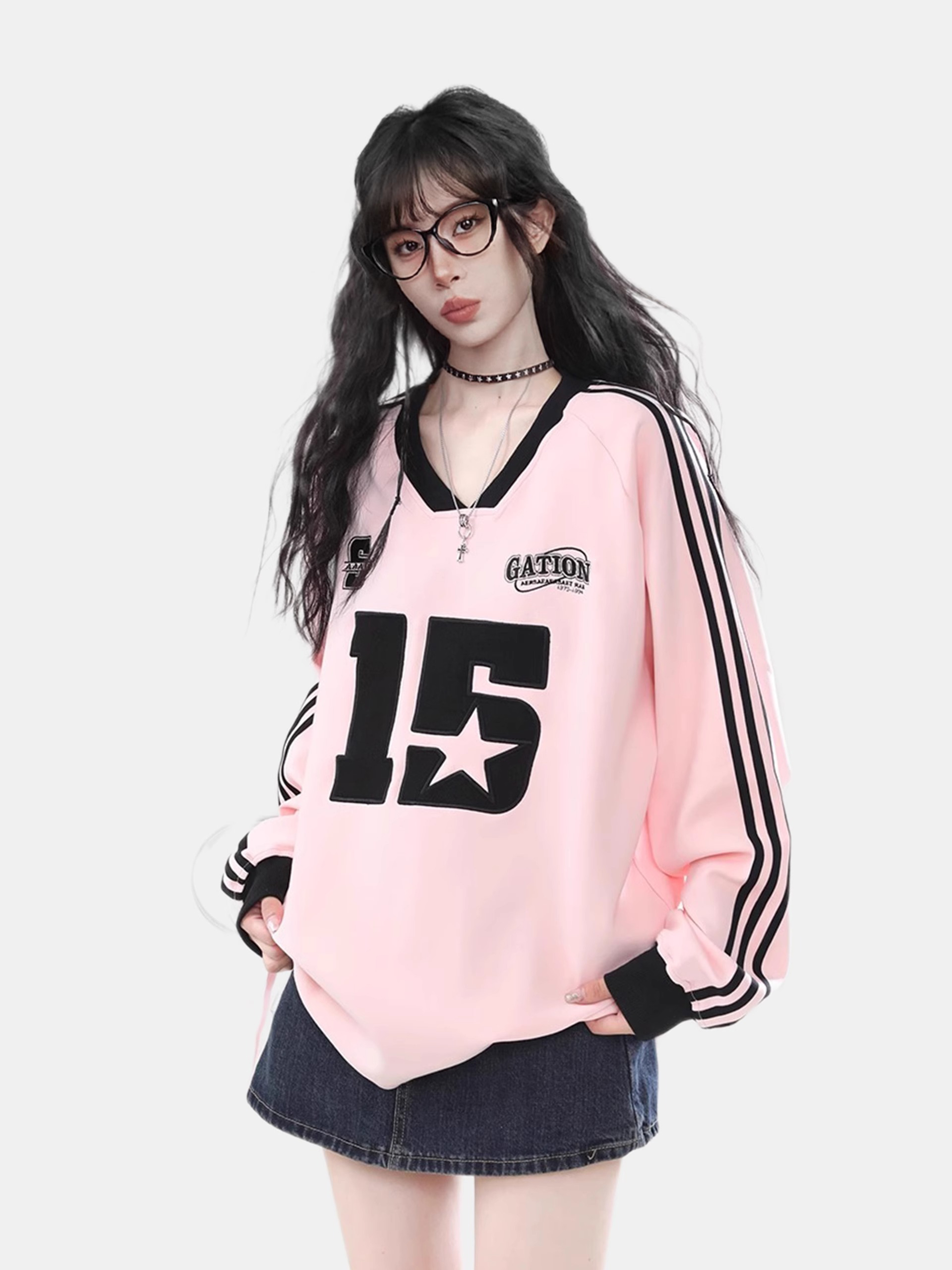 粉色多巴胺正肩V領寬鬆長袖衛衣春秋套頭運動上衣情侶