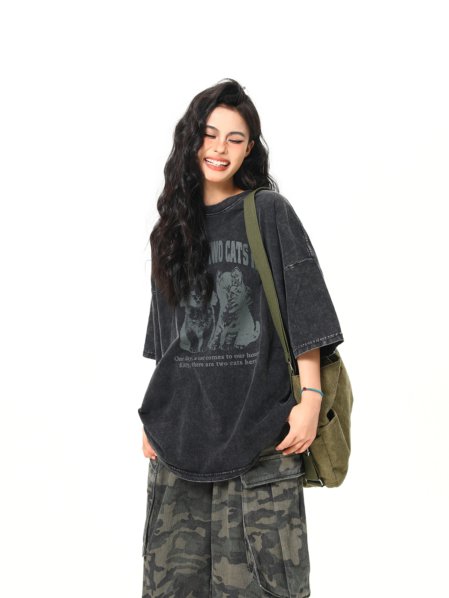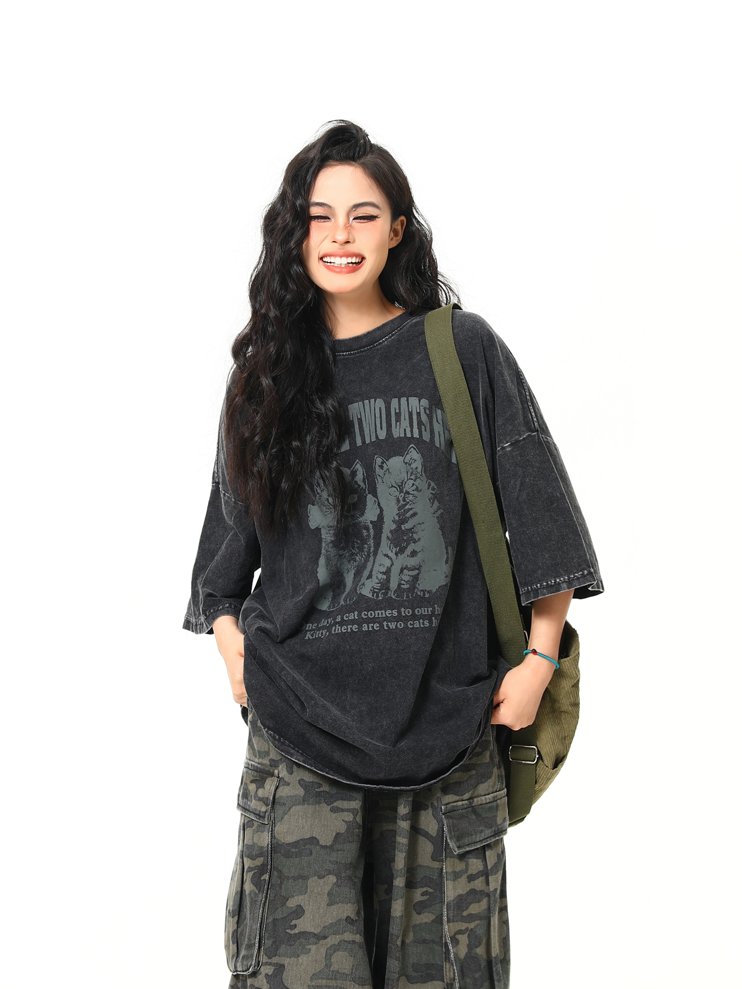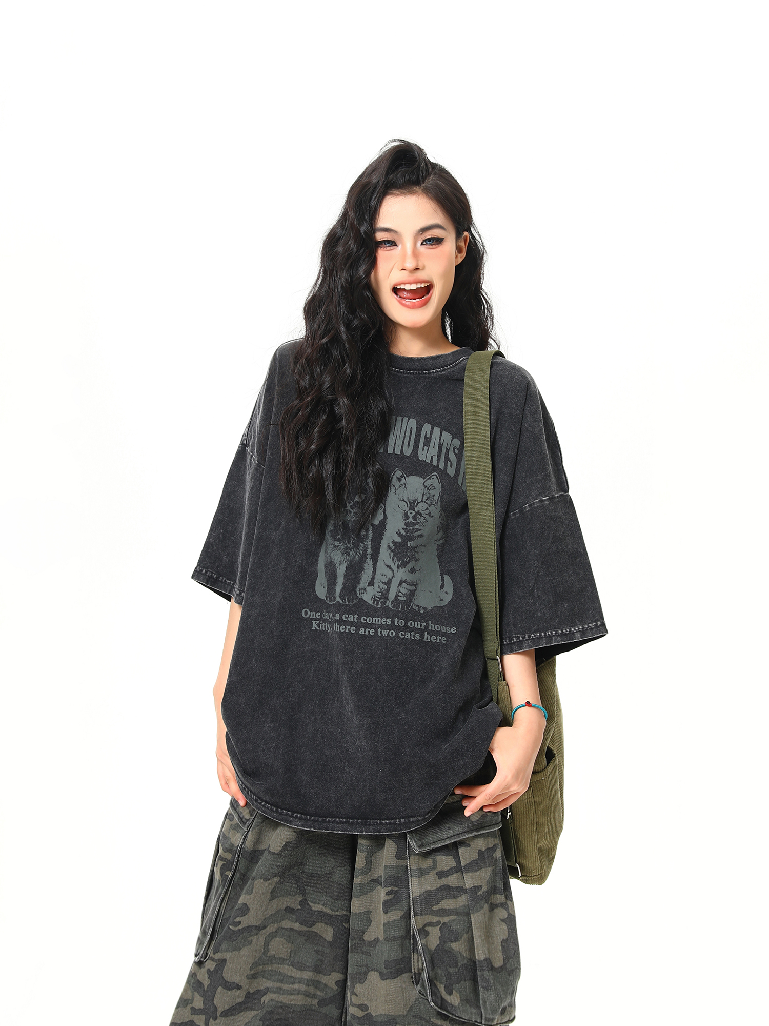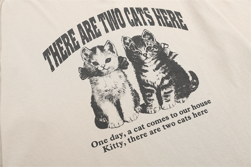美式復古黑貓印花短袖T卹夏季寬鬆水洗做舊潮牌情侶Tee