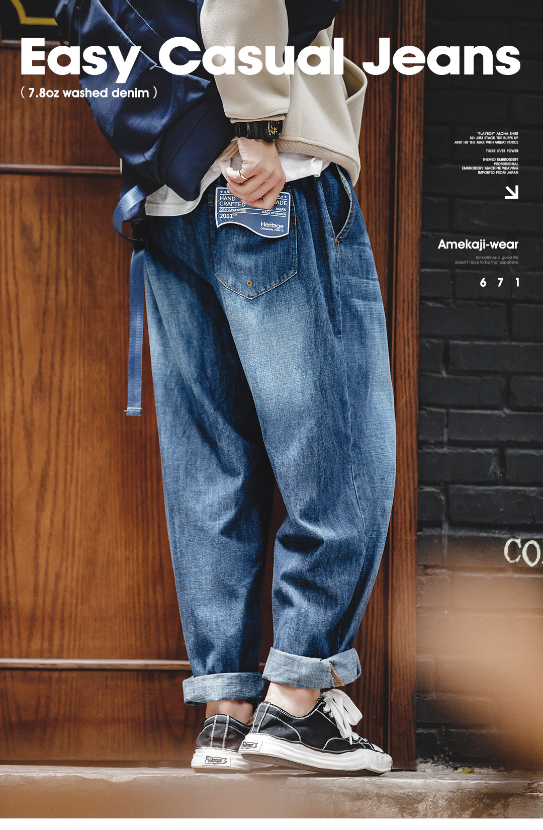 馬登工裝 美式休閒磨白丹寧牛仔褲水洗貓須寬鬆直筒長褲