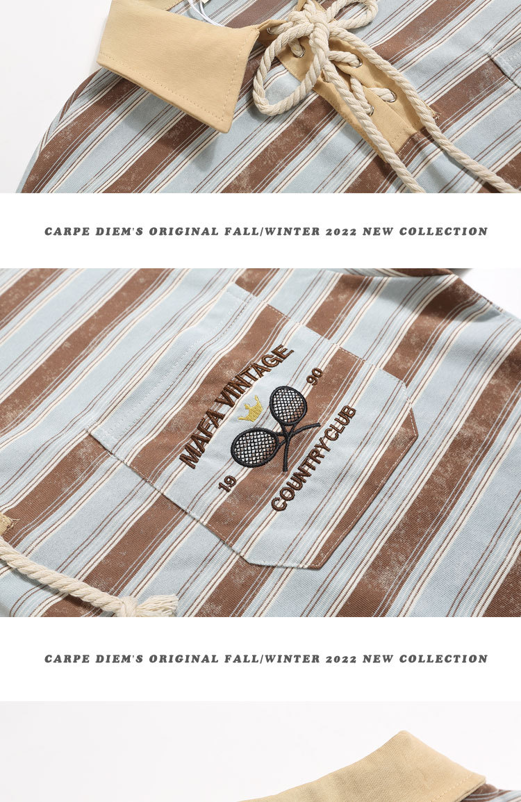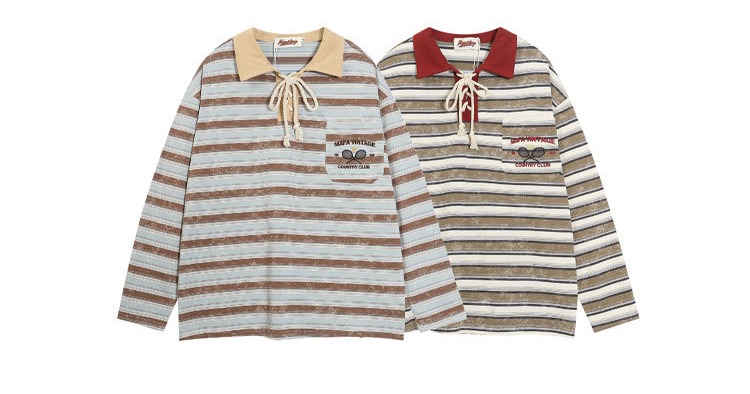 美式復古學院風條紋長袖Polo衫撞色氛圍感Oversize翻領情侶上衣
