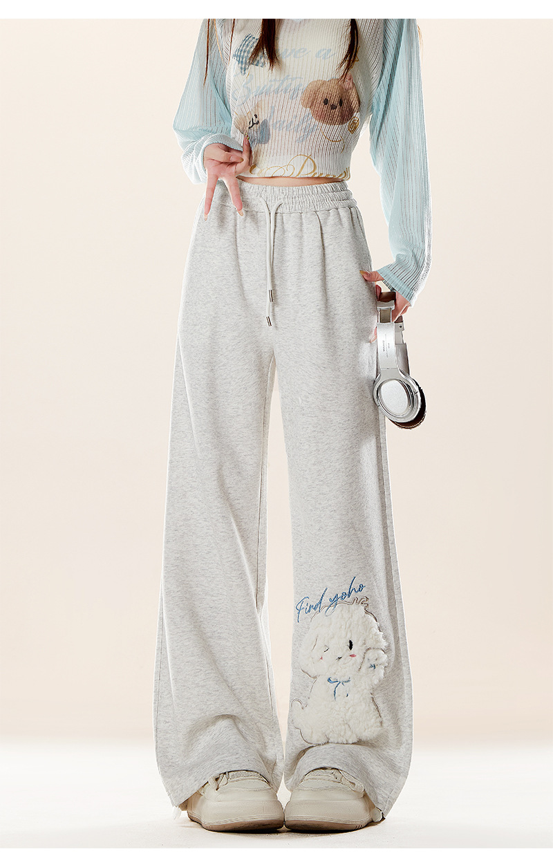 美式復古可愛小狗貼布繡休閒衛褲百搭直筒寬鬆運動闊腿褲