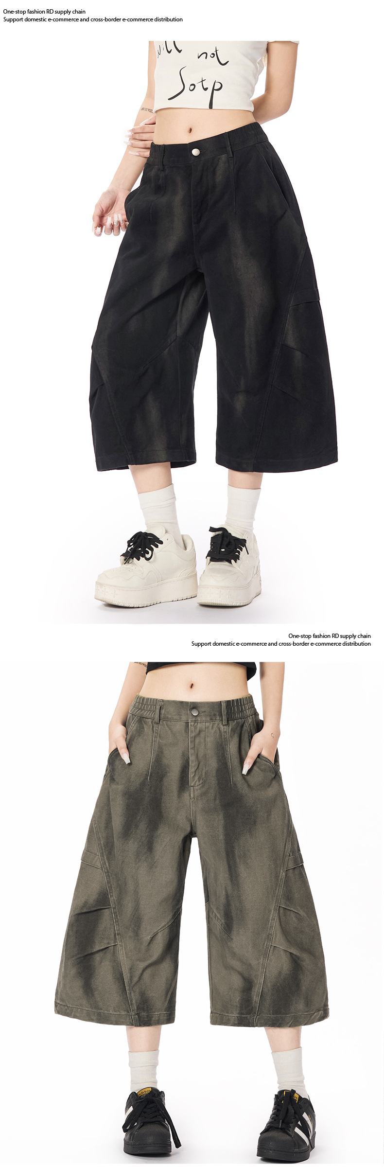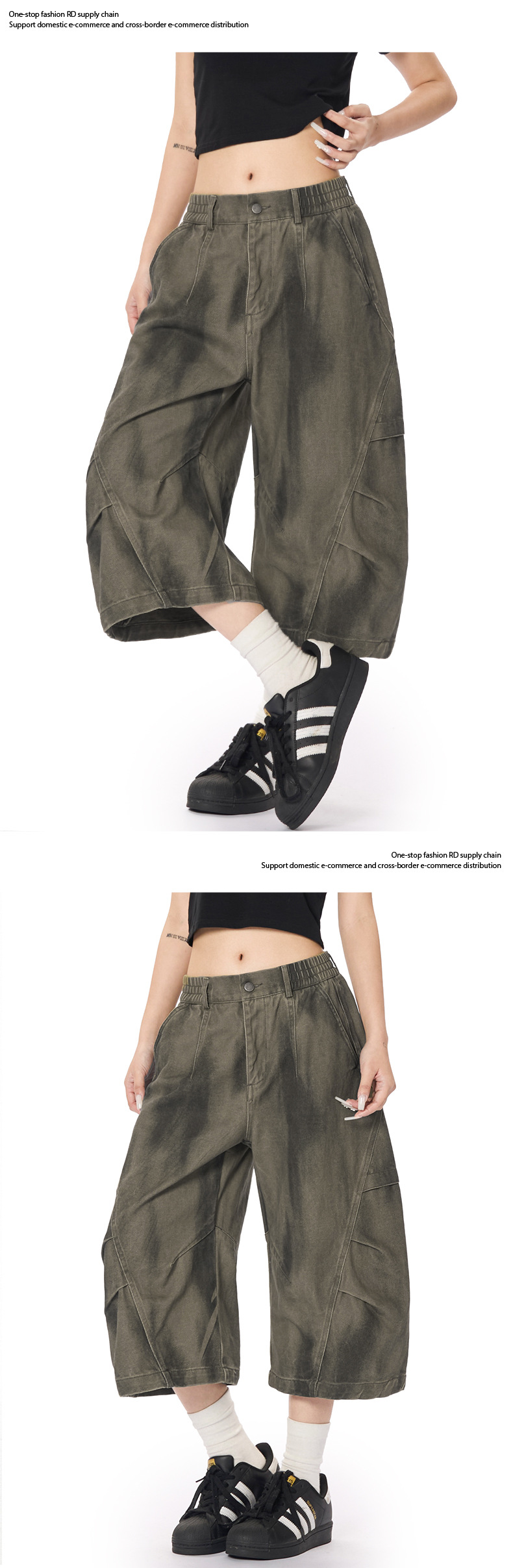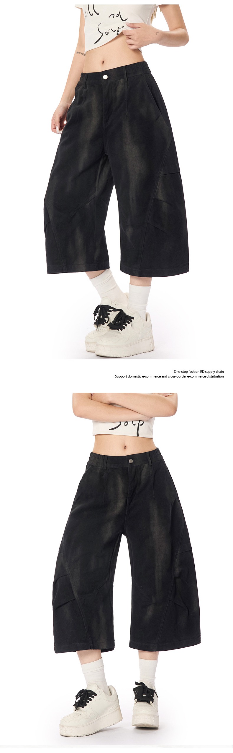 美式復古做舊髒染工裝七分褲男女高街潮牌休閒褶皺設計感寬褲