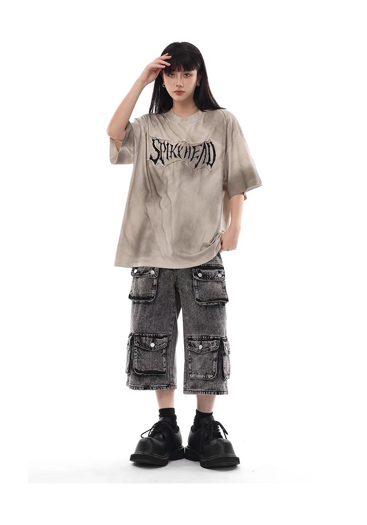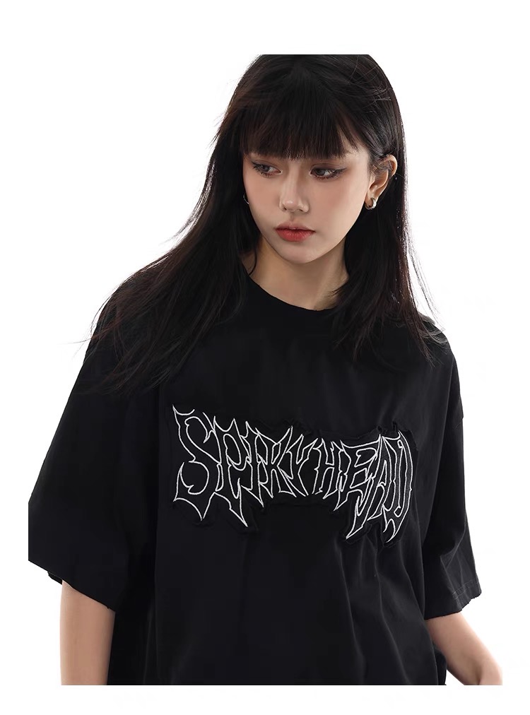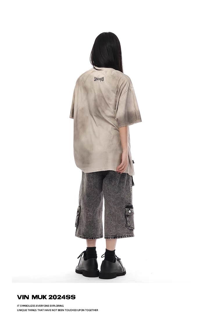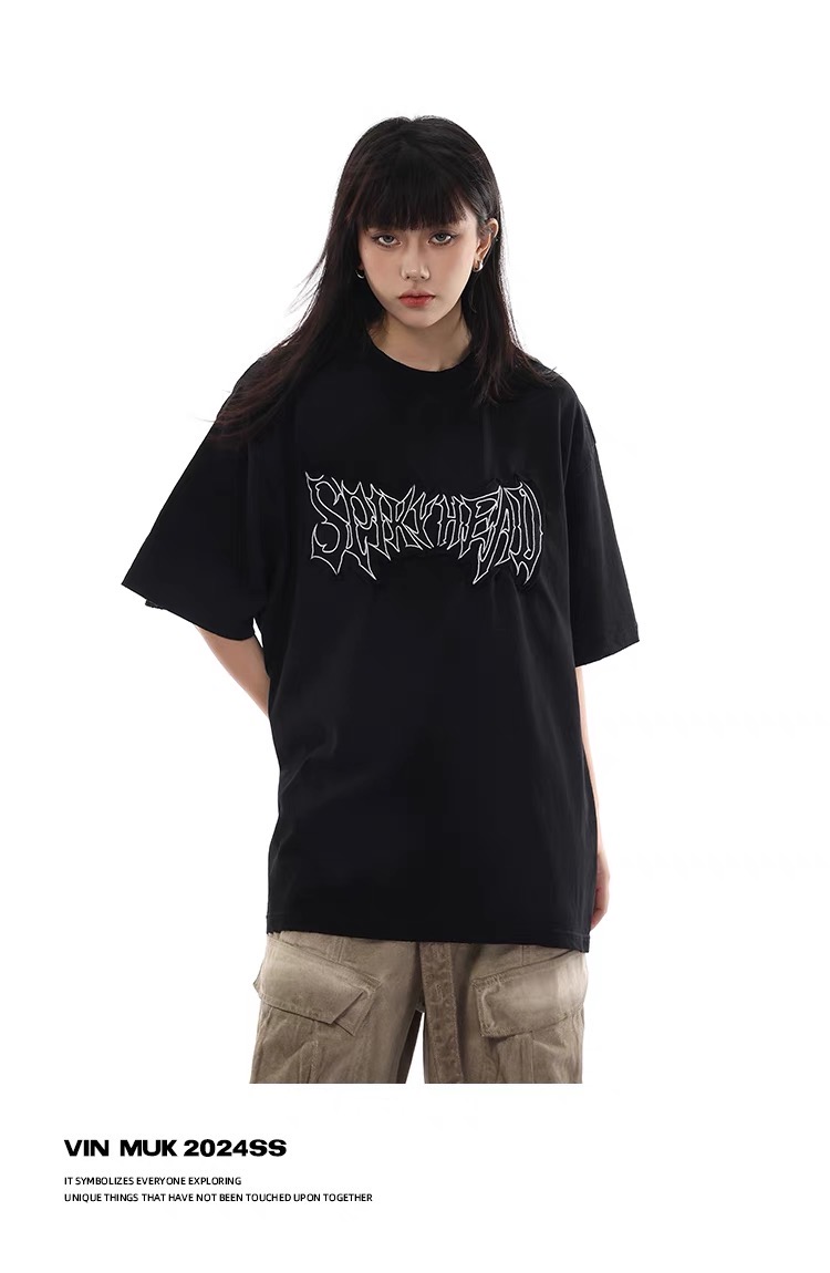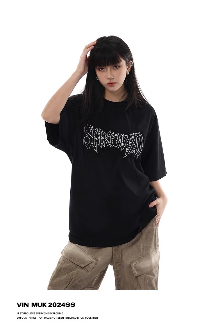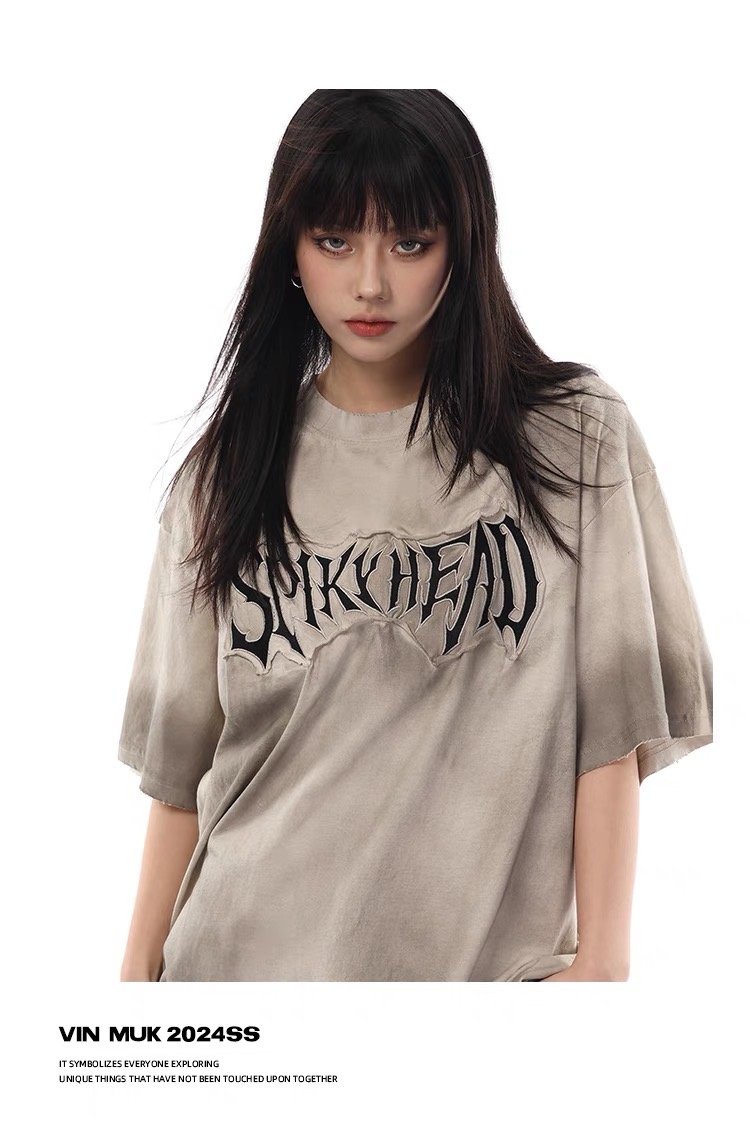 美式復古水洗髒染做舊貼布繡短袖T恤髒髒刺繡寬鬆情侶半袖上衣