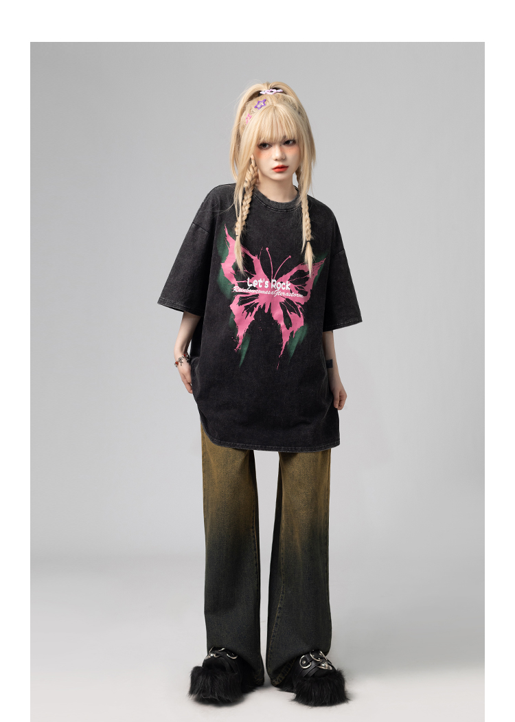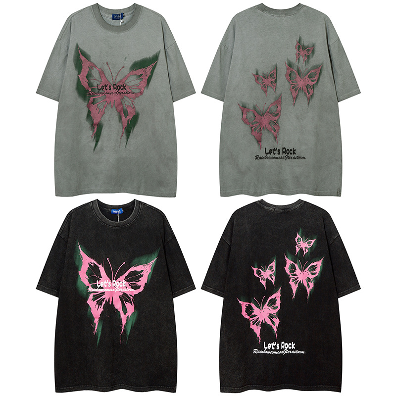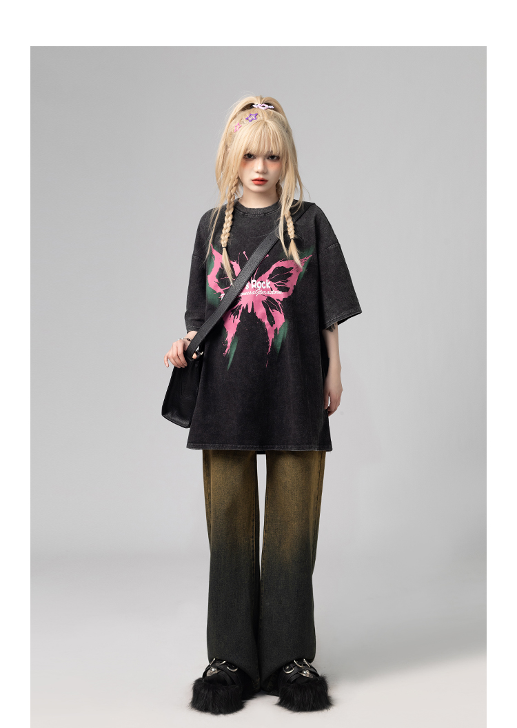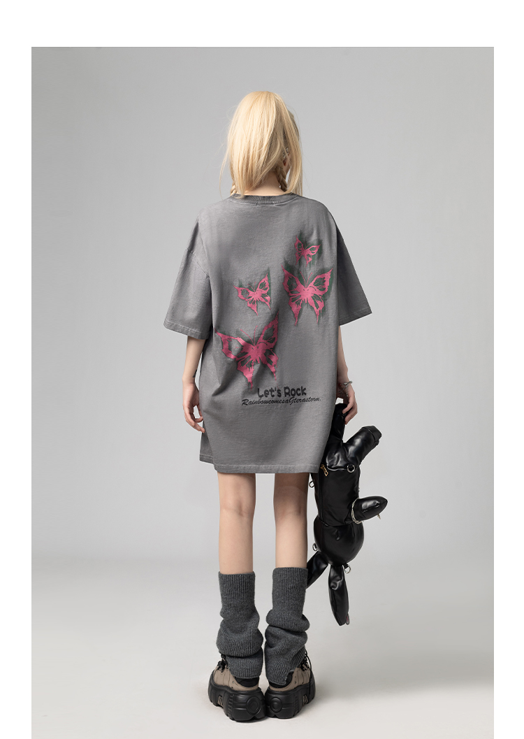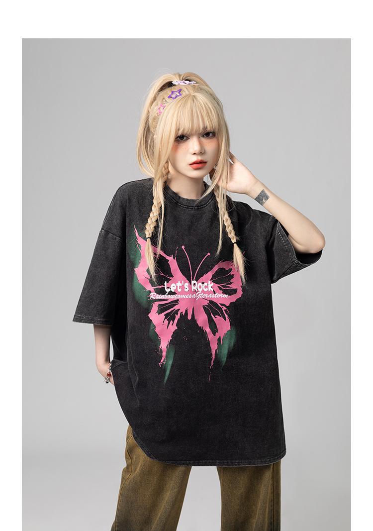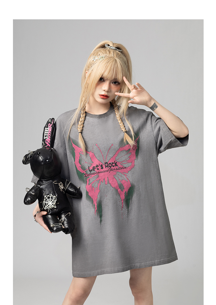 美式復古哥特風蝴蝶印花Chic寬鬆T恤潮流設計感情侶短袖上衣