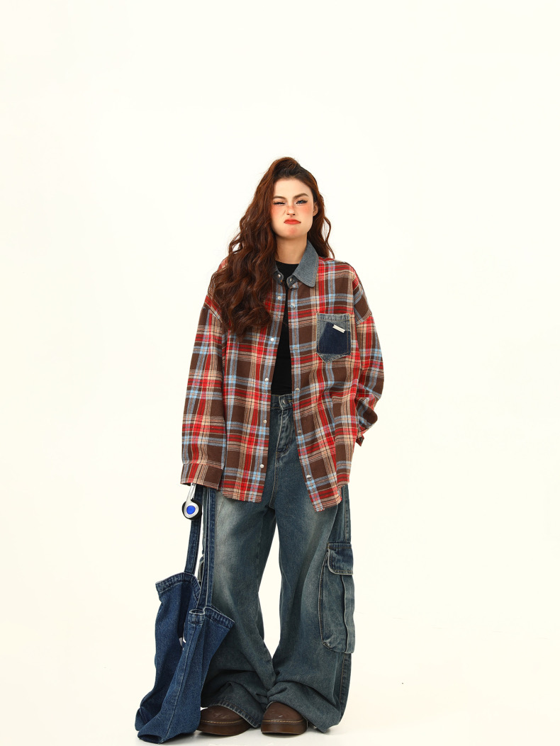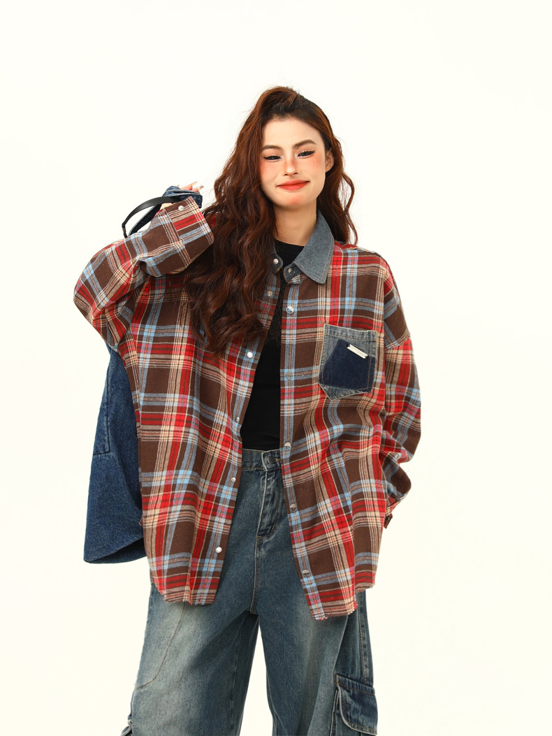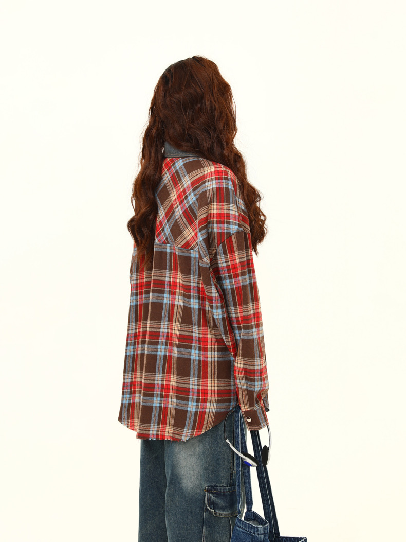 高級感外穿格子襯衫女復古寬鬆百搭早秋黃色格紋襯衣外套